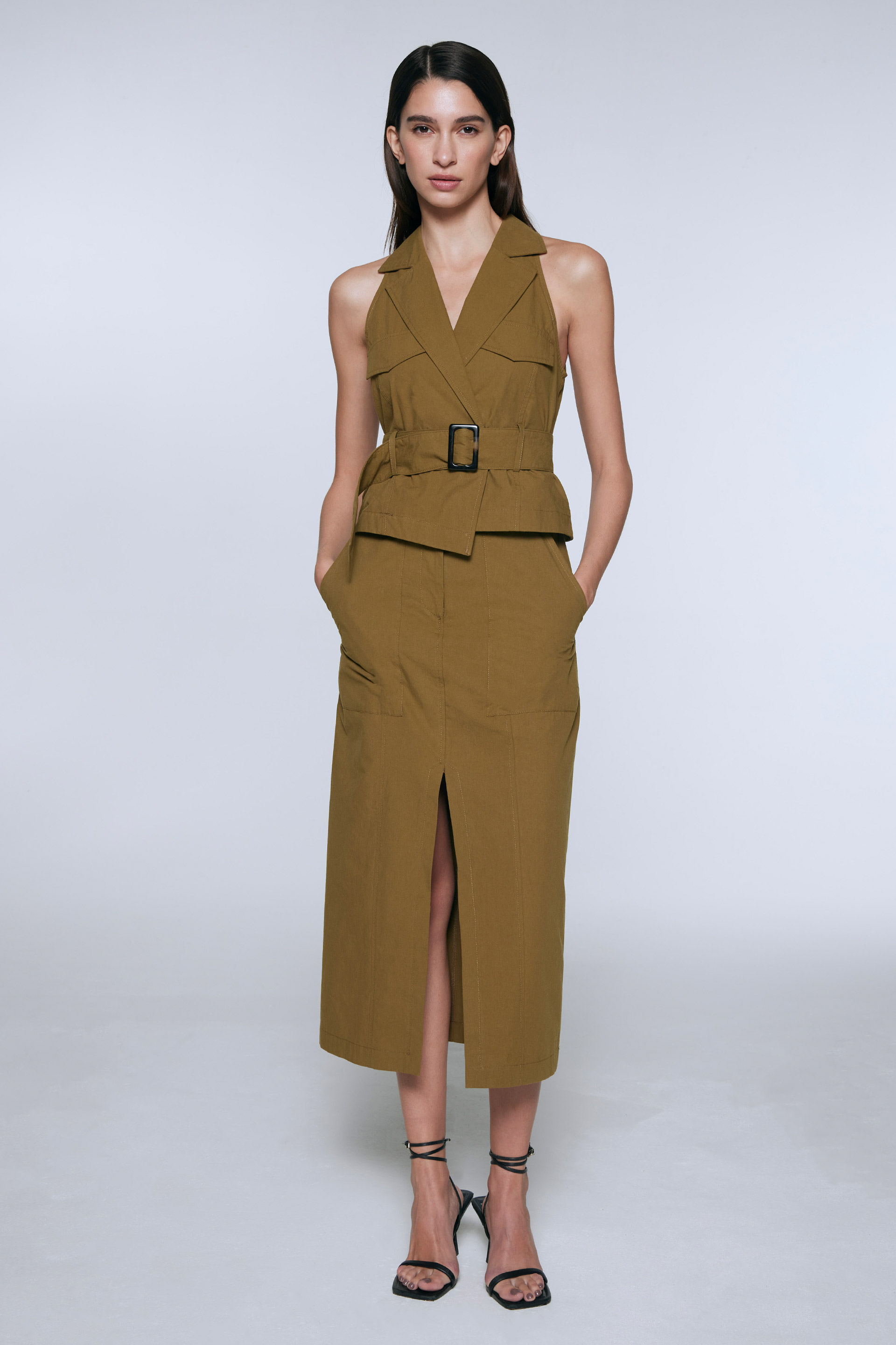 Tapado de paño de lana premium, de silueta entallada y manga larga. Posee cierres metálicos y remaches en terminación de bolsillos, recortes en hombros y broches en punta de cuello. La silueta femenina y detalles exclusivos hacen de este tapado una prenda irresistible.