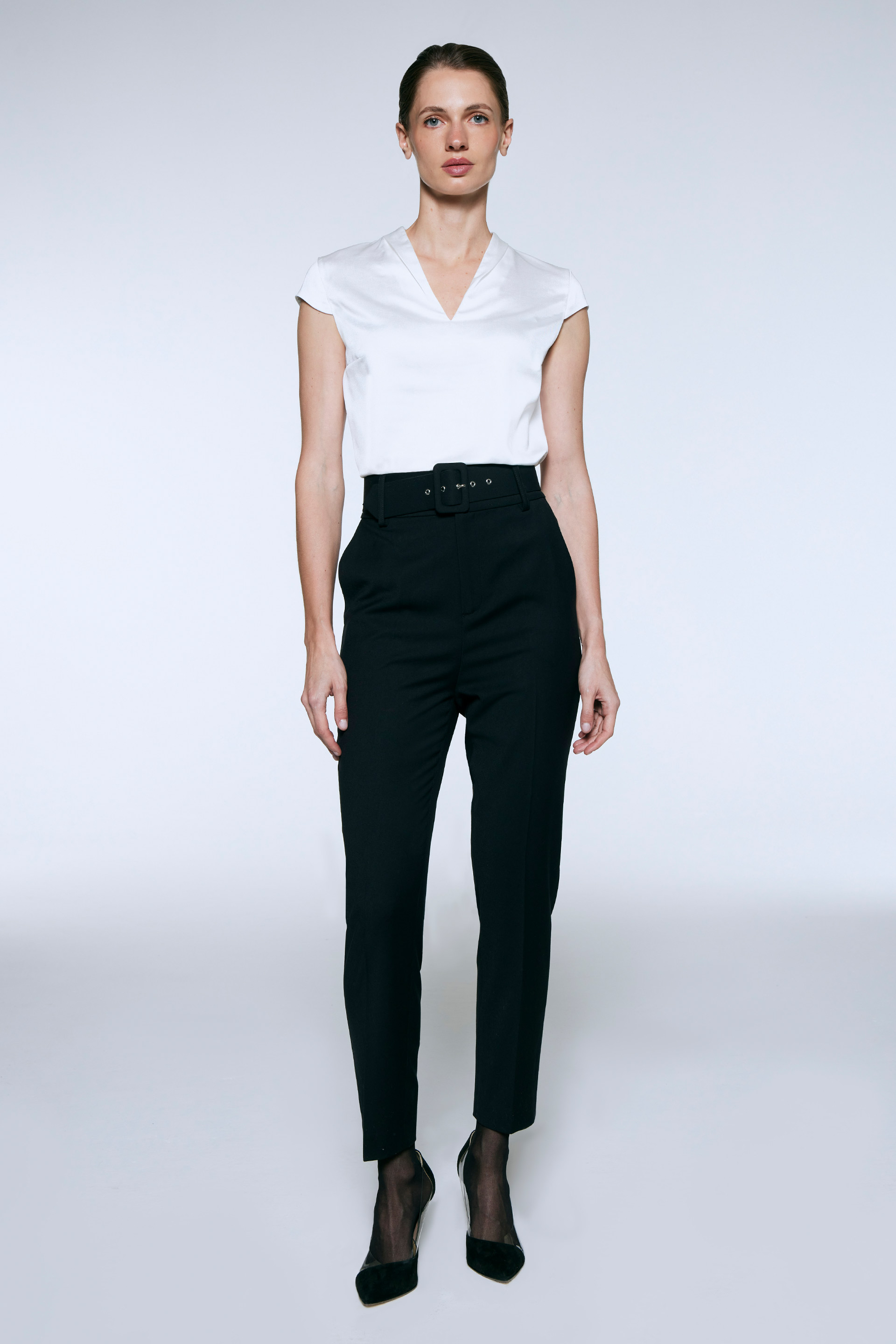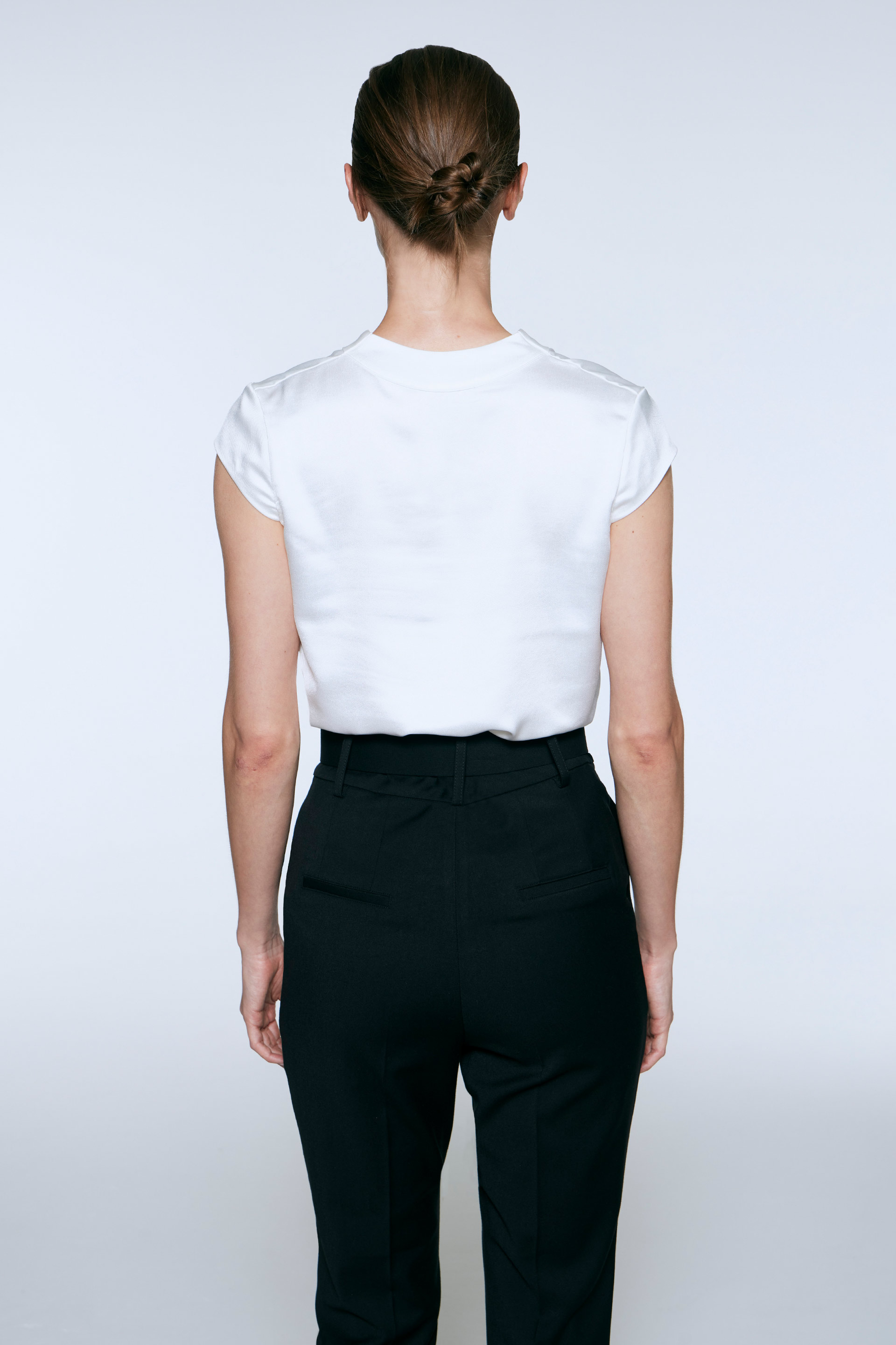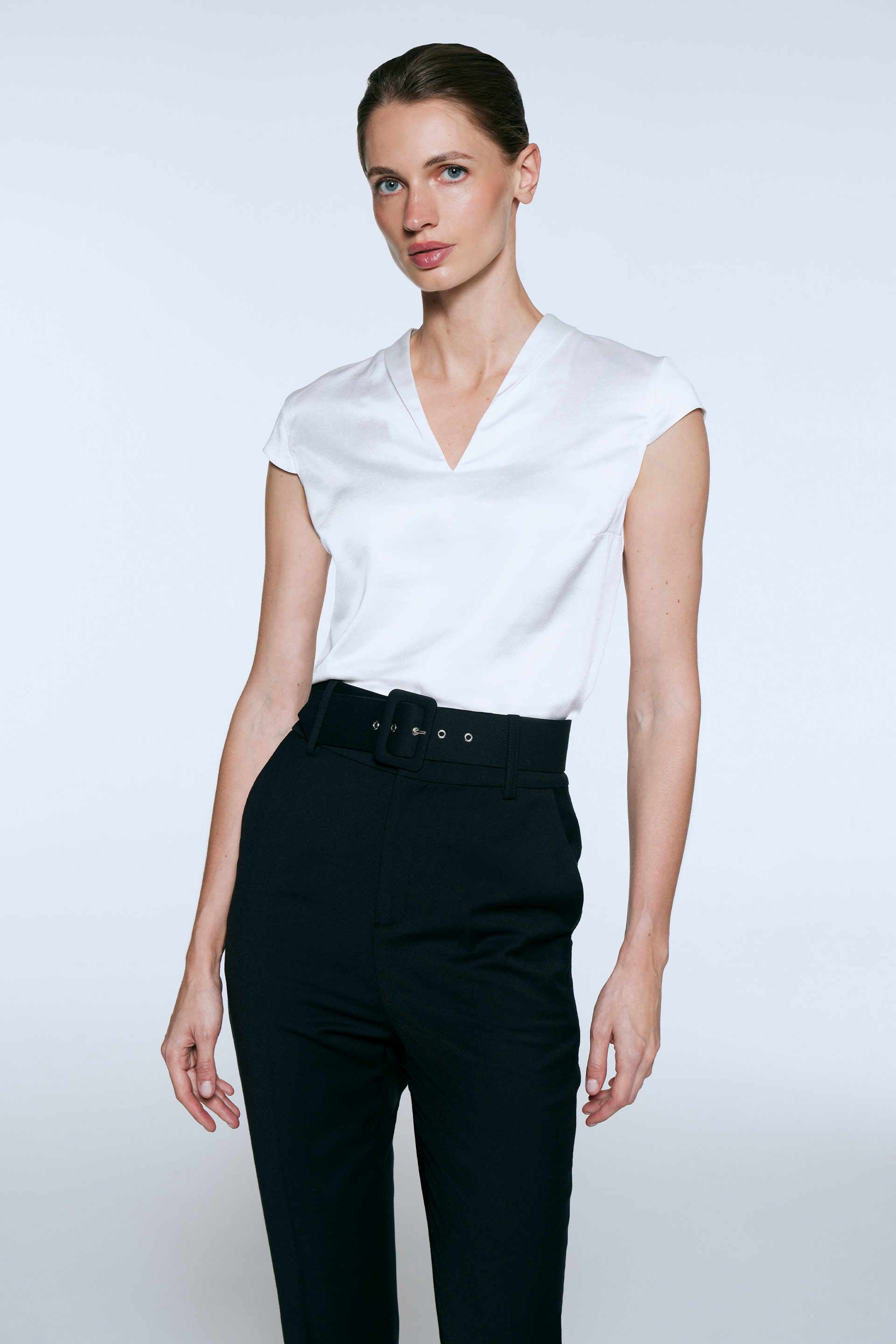 Blusa de satén twill, de silueta relajada. Posee mangas cortas japonesas, pinza de busto y escote en V con detalle de pliegue. Ideal para verte sofisticada en la oficina.