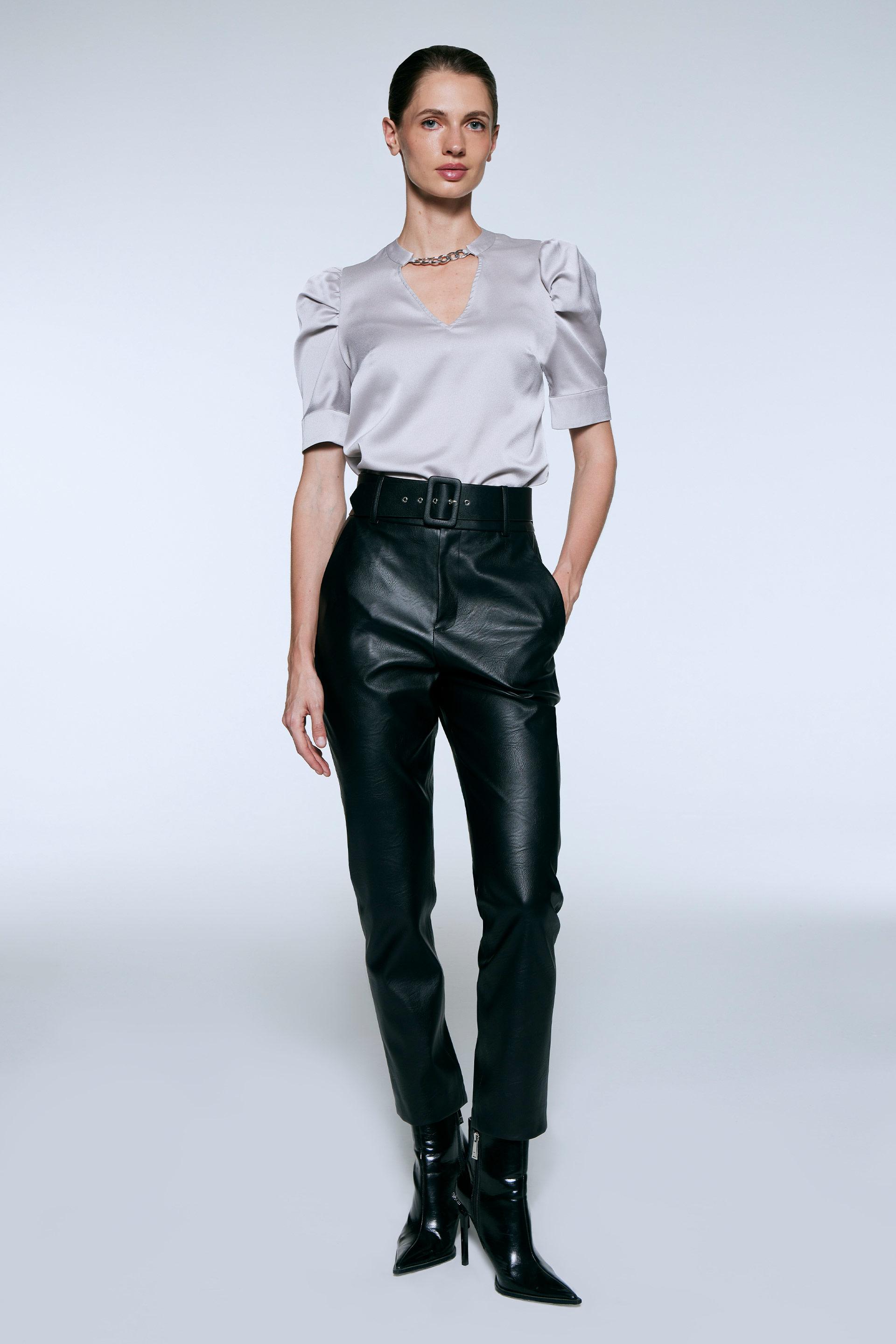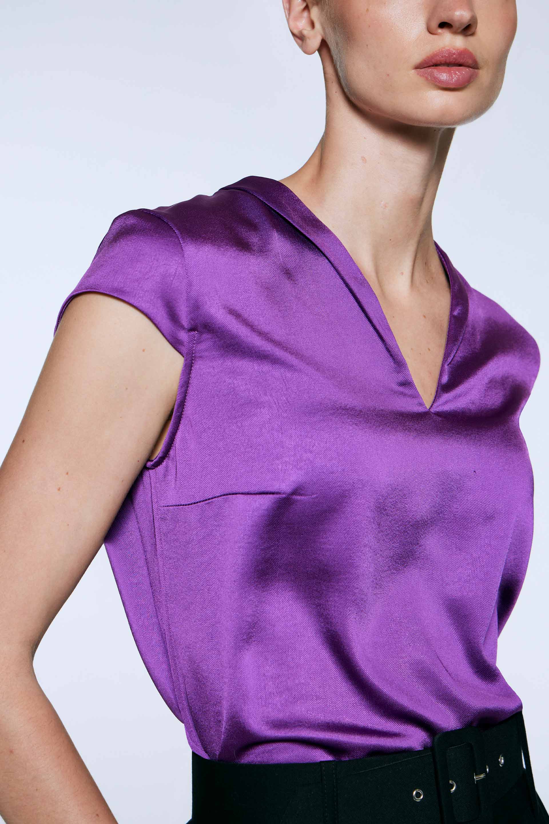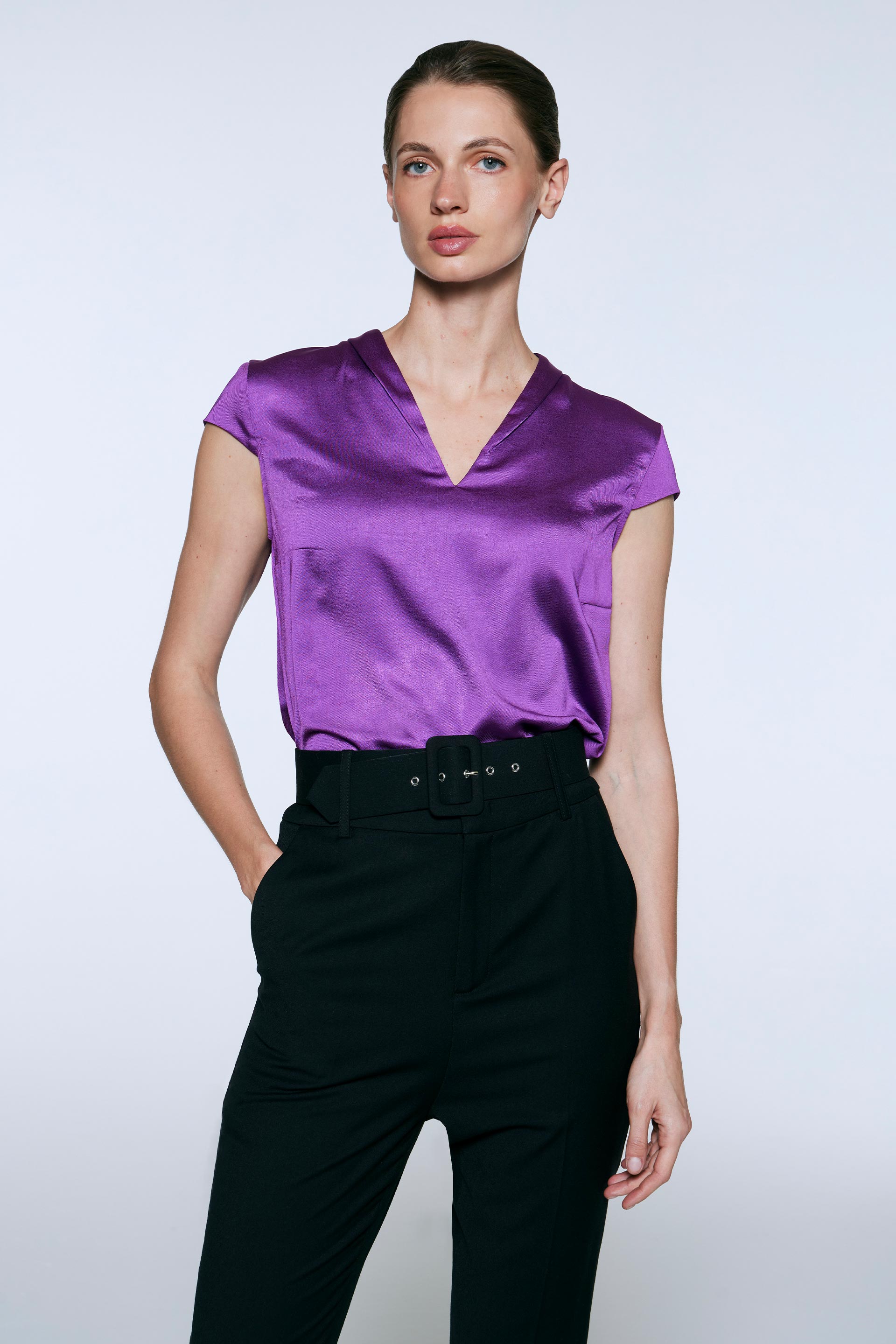 Blusa de satén twill, de silueta relajada. Posee mangas cortas japonesas, pinza de busto y escote en V con detalle de pliegue. Ideal para verte sofisticada en la oficina.