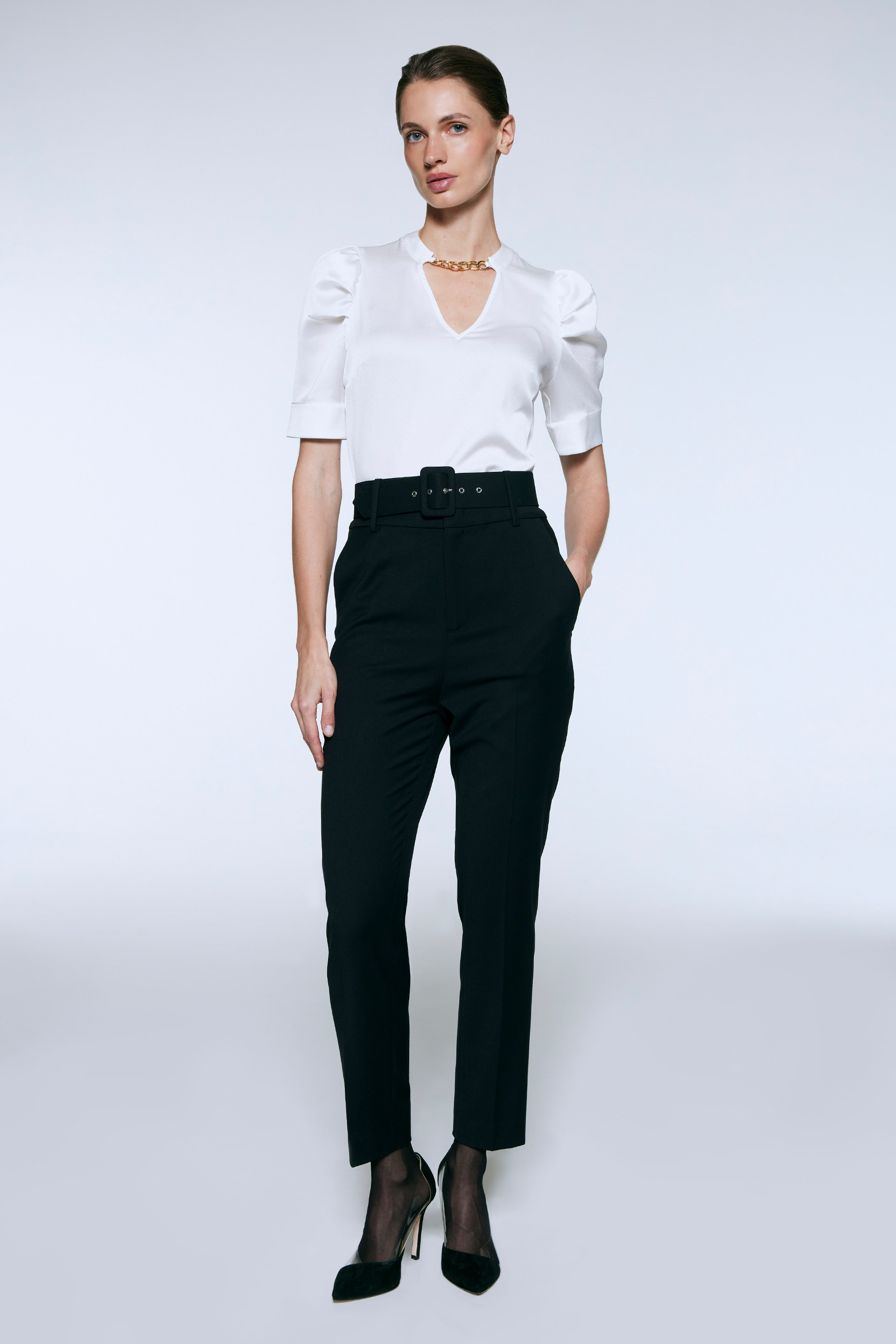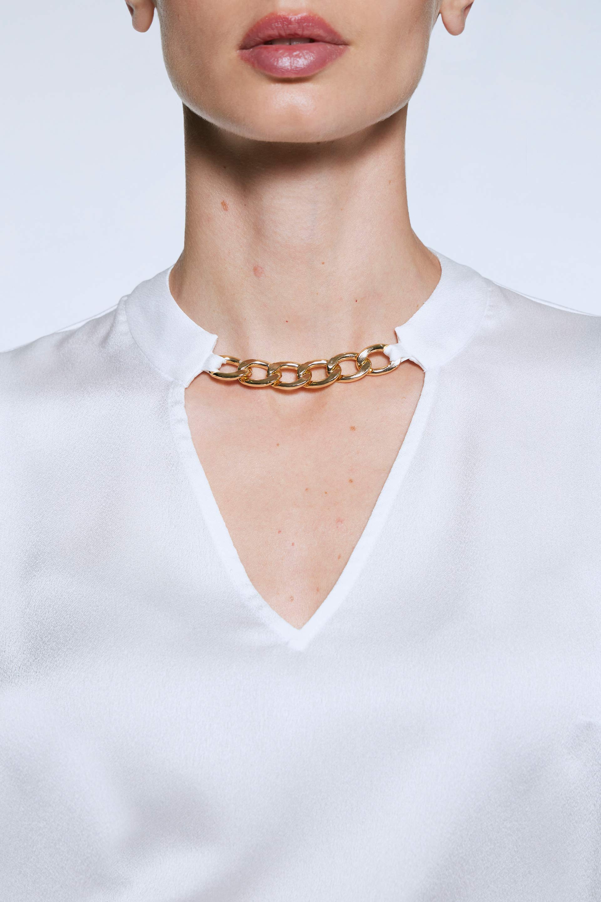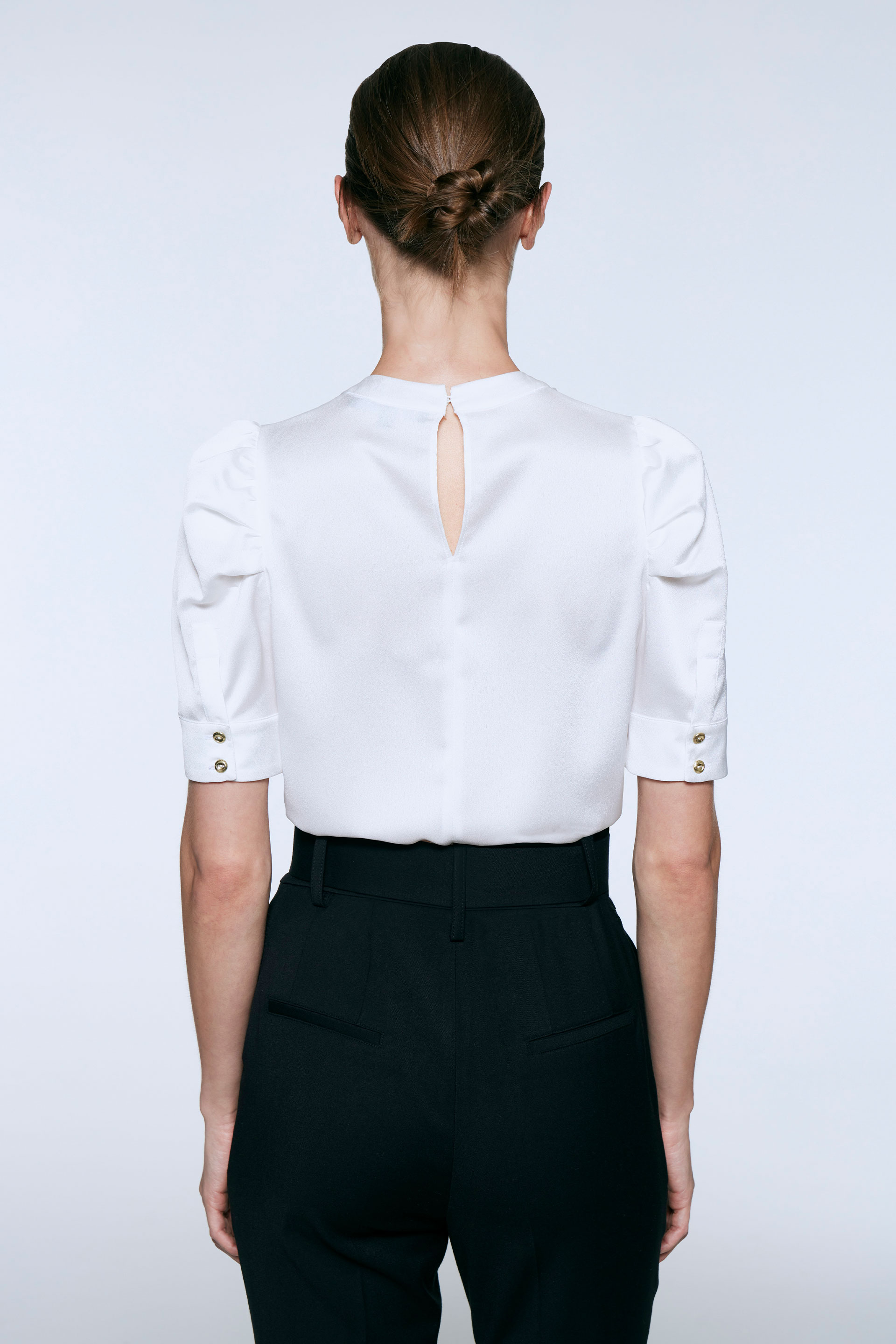 Blusa de sedita crepe, de silueta al cuerpo. Posee mangas cortas con puff por encima del codo, pinzas de busto, escote en V con cuello mao y cadena metálica.