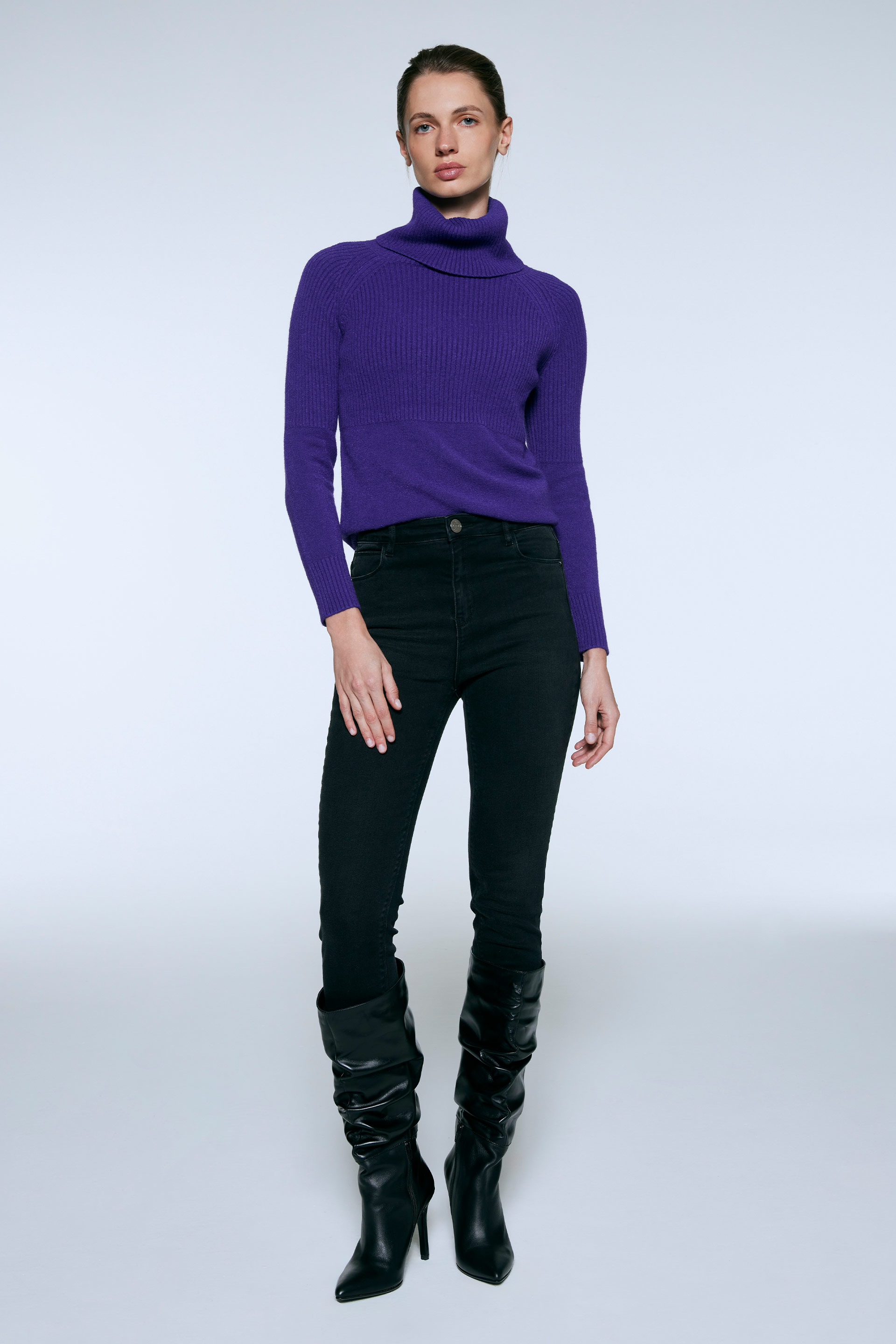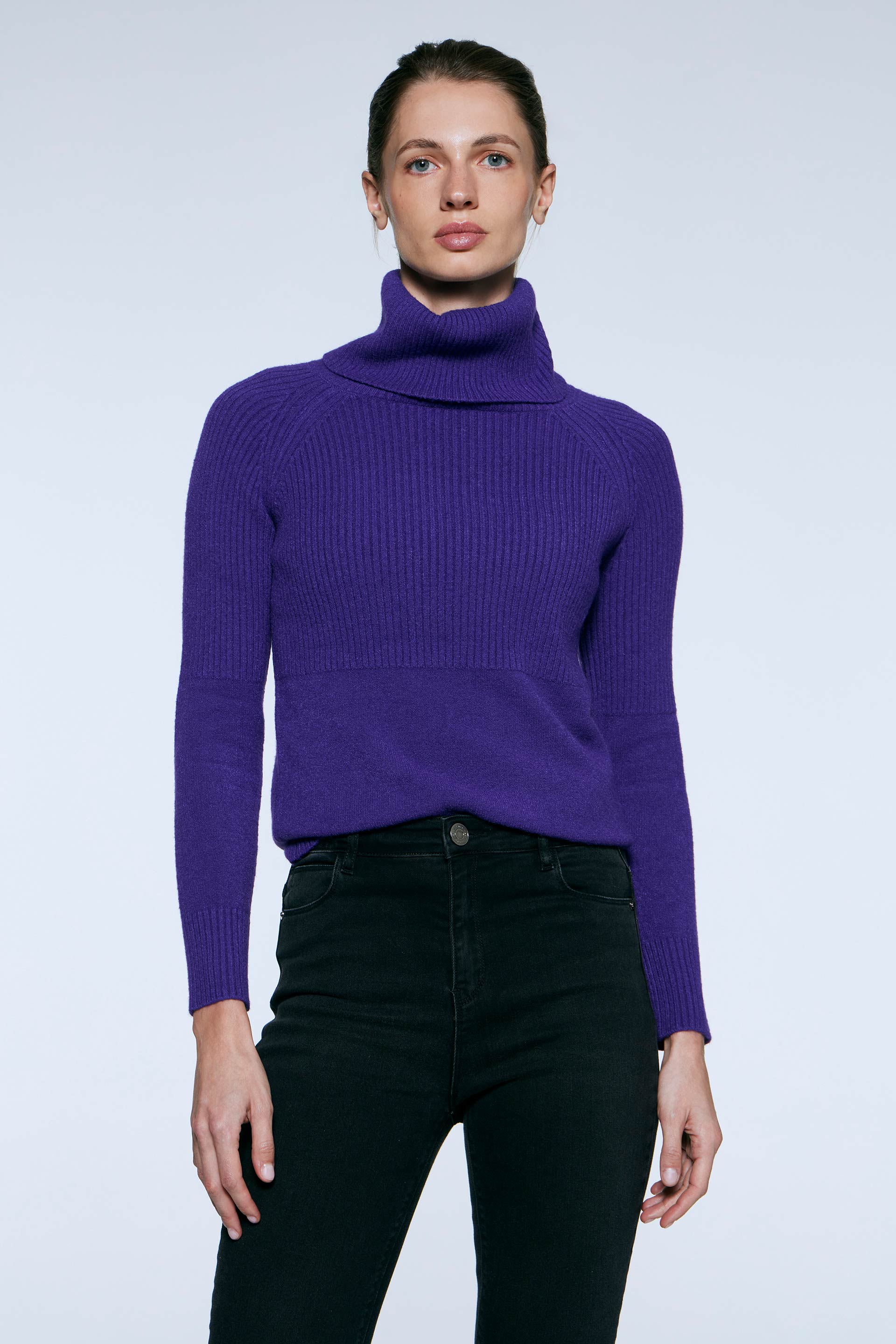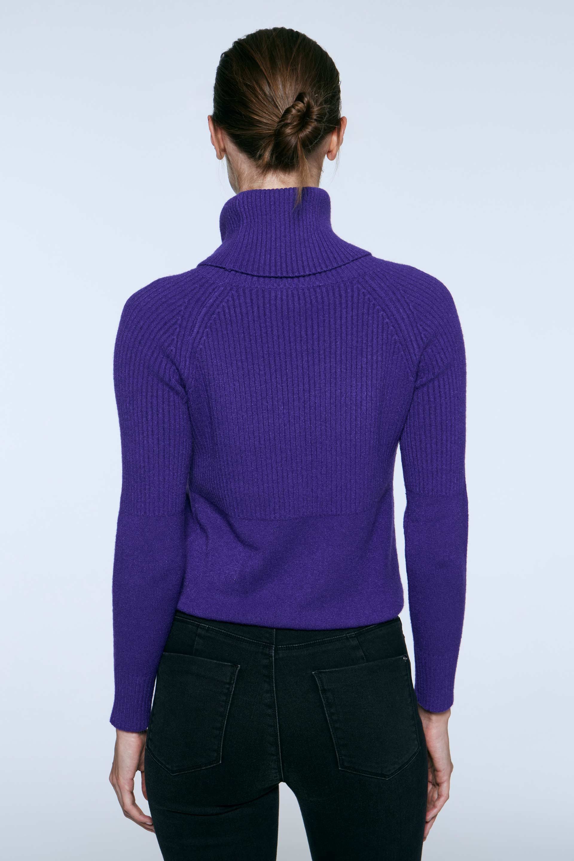 Polerón tejido de calce al cuerpo y mangas largas. Cuello alto rebatible y detalle de punto canelón en copa de mangas y en la parte superior de la prenda. Ideal para sumar estilo a tus outfits de invierno.