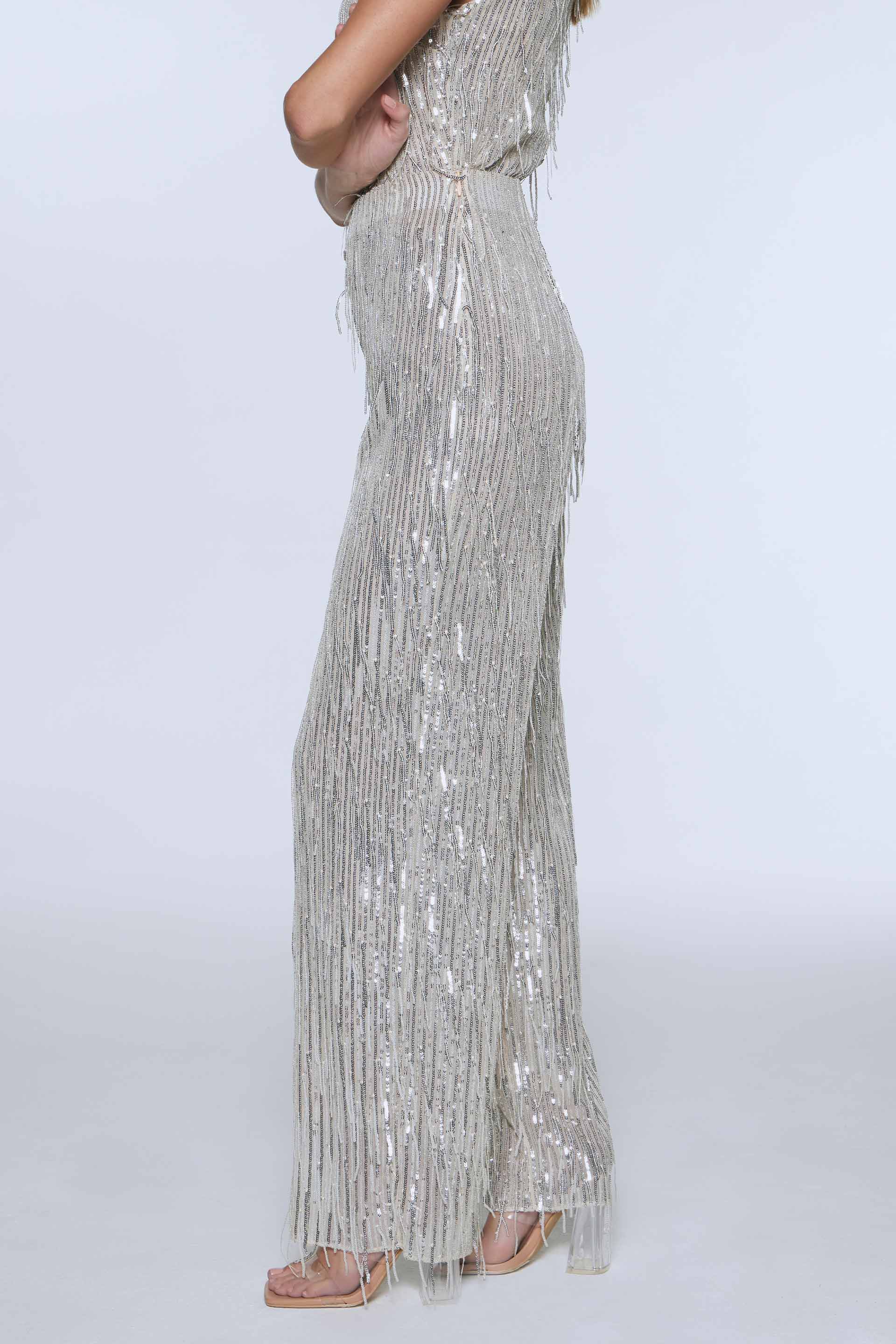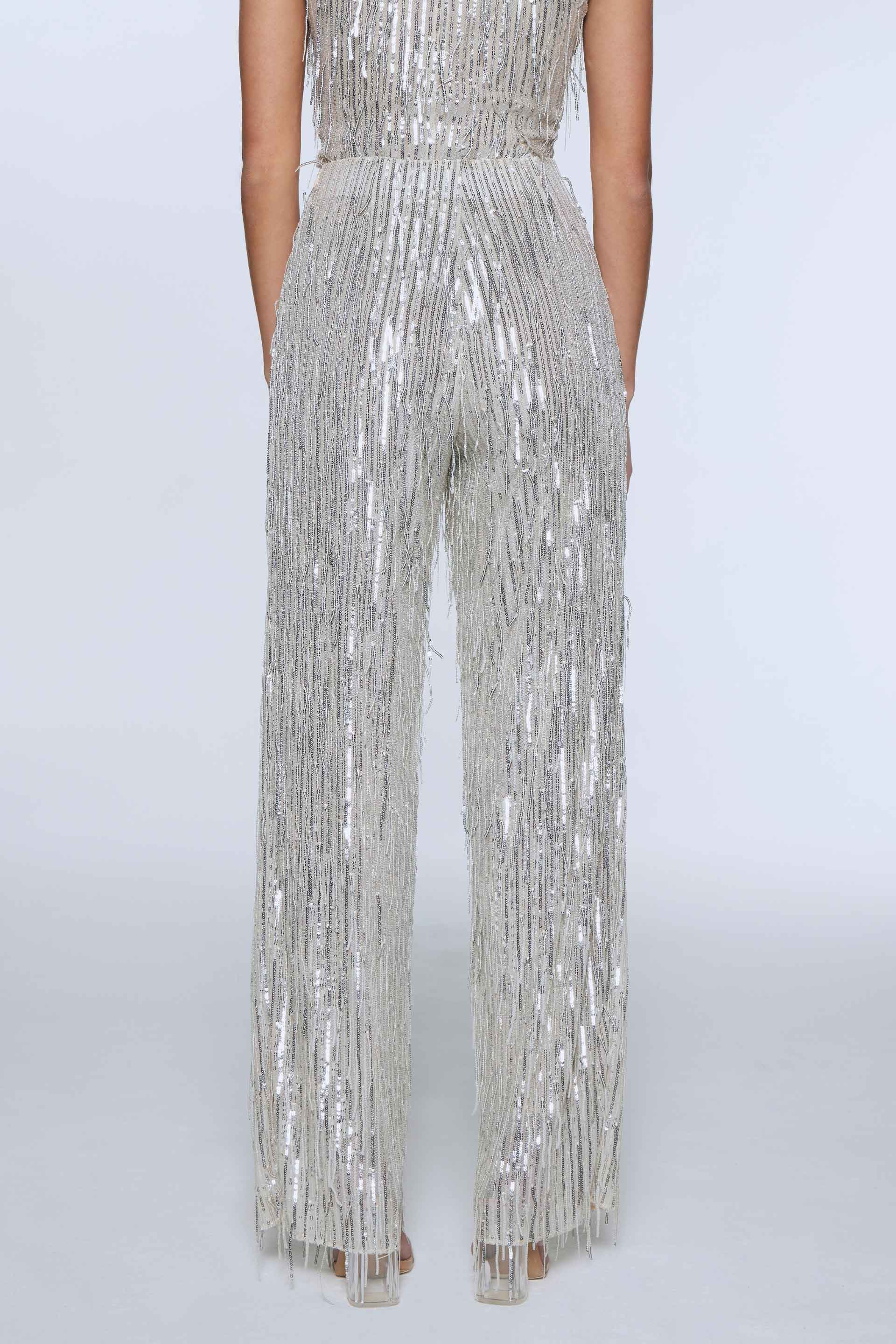 Pantalón de lentejuelas, tiro alto y pierna recta. Posee acceso en el lateral con cierre invisible y cintura interna sastrera. Su interior está forrado para un mayor confort. Su calce y su género con flecos aportan modernidad, ideal para un evento. Combinalo con el top Aiyara y armá un total look.
