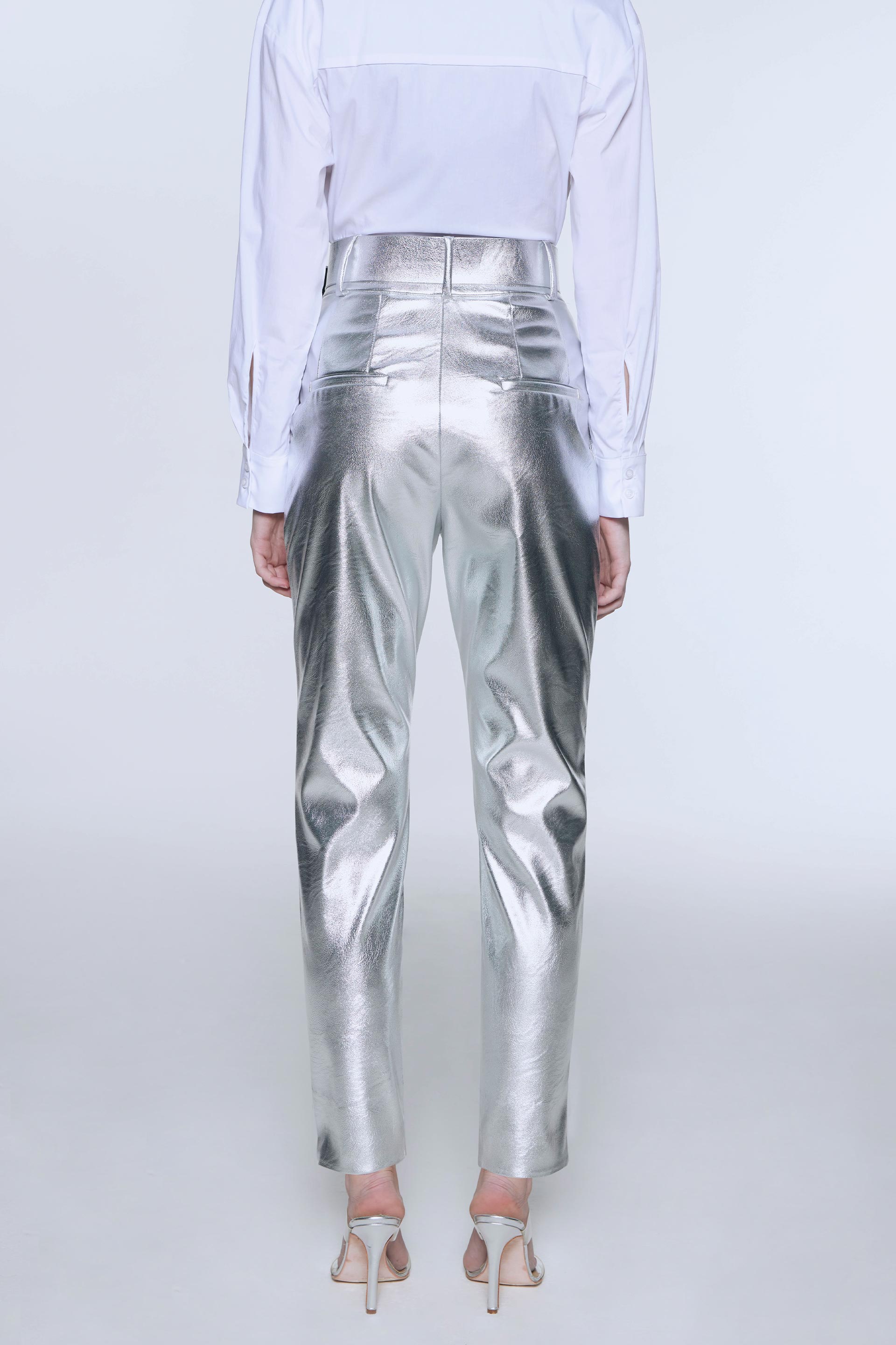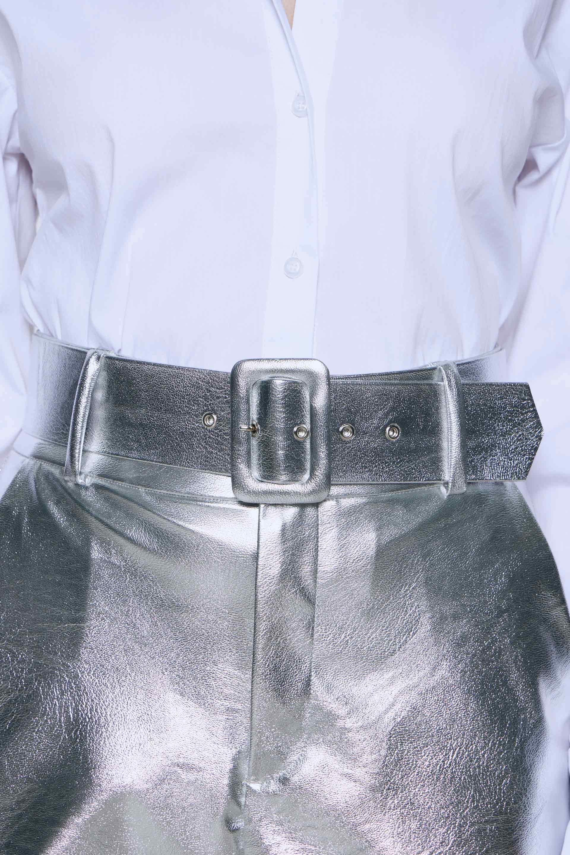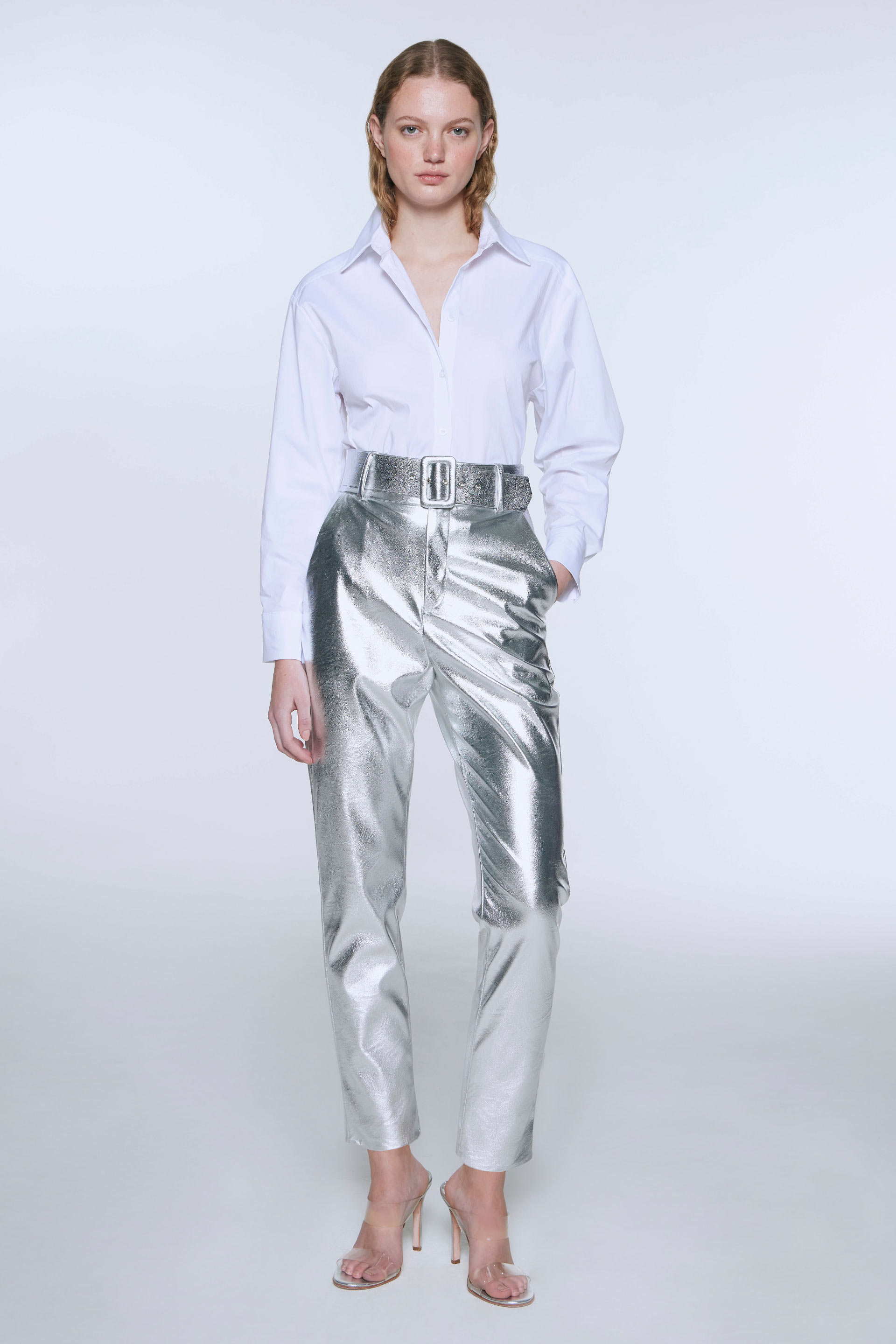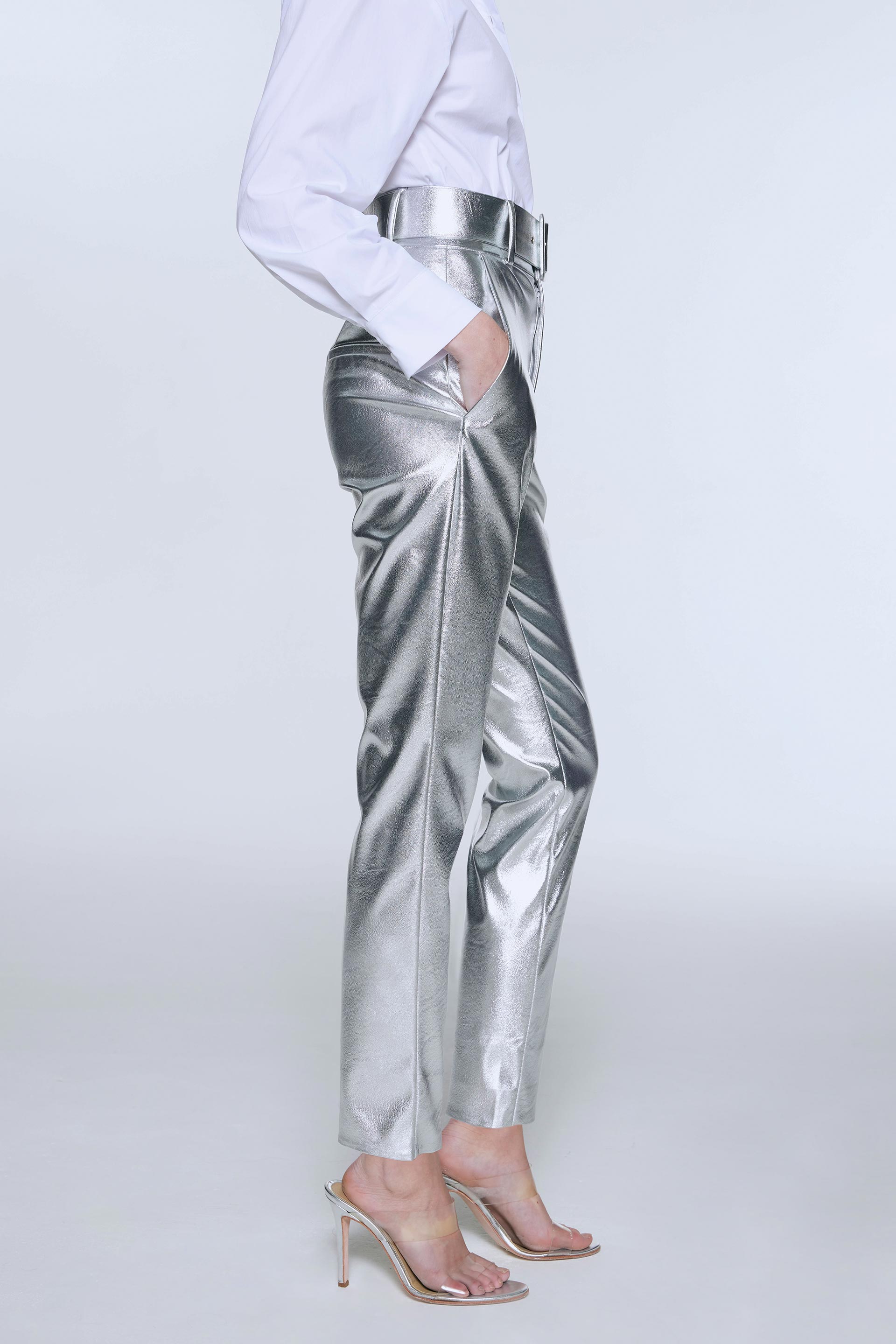 Pantalón efecto cuero, de tiro alto y pierna slim. Posee cinturón forrado con hebilla y bolsillos laterales. Su calce y color lo convierten en un pantalón moderno y de absoluta tendencia que elevará todos tus looks.