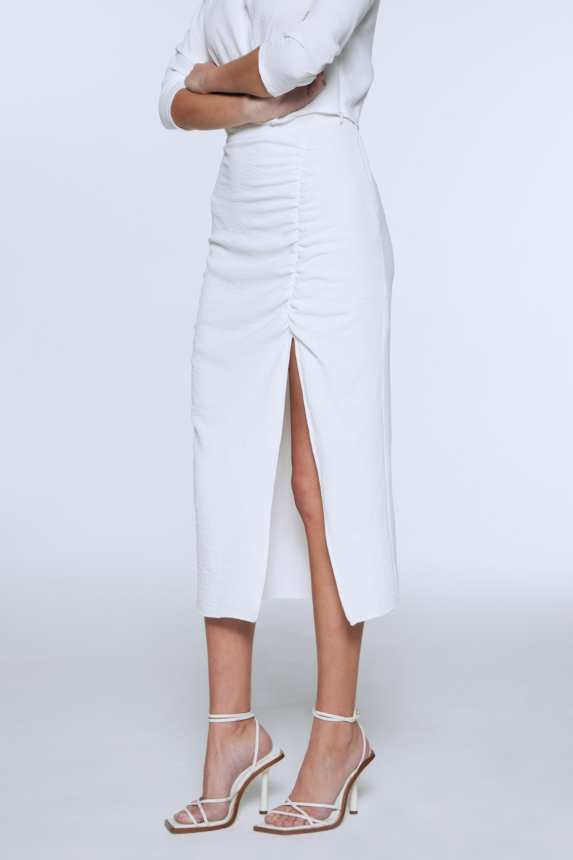 Pollera de crepe washed, de tiro alto y silueta recta. Posee frunces en el delantero, tajo y cintura sastrera con acceso en el lateral. Su largo midi y su silueta recta hacen que sea una prenda moderna y elegante. Combinala con la camisa Trudy y armá un total look ideal para un evento.
