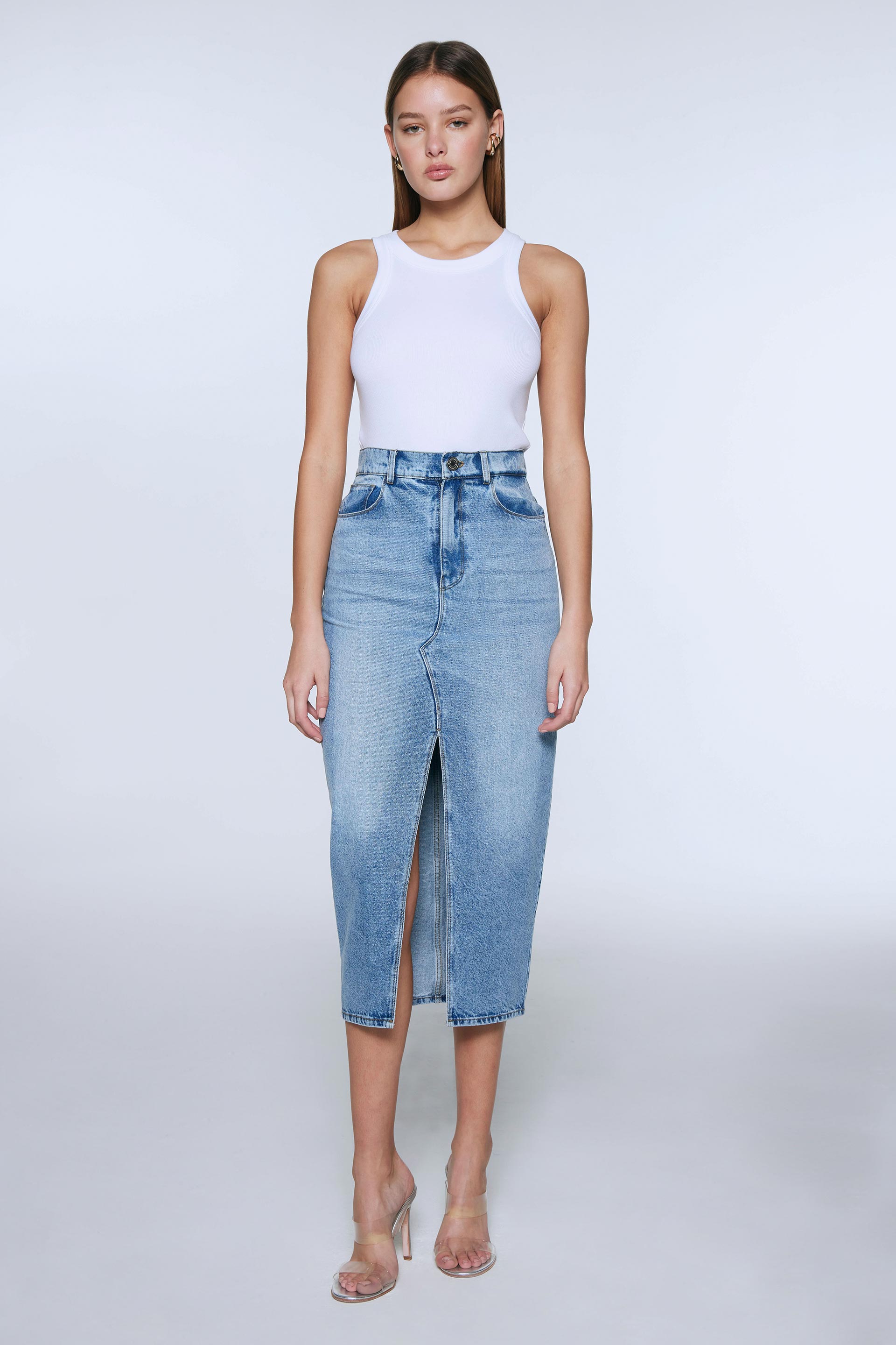 Pollera denim, de tiro alto y silueta recta. Posee tajo en delantero y diseño con 5 bolsillos. Su largo hasta los tobillos la convierte en una prenda de absoluta tendencia, ideal para armar un look urbano y relajado.