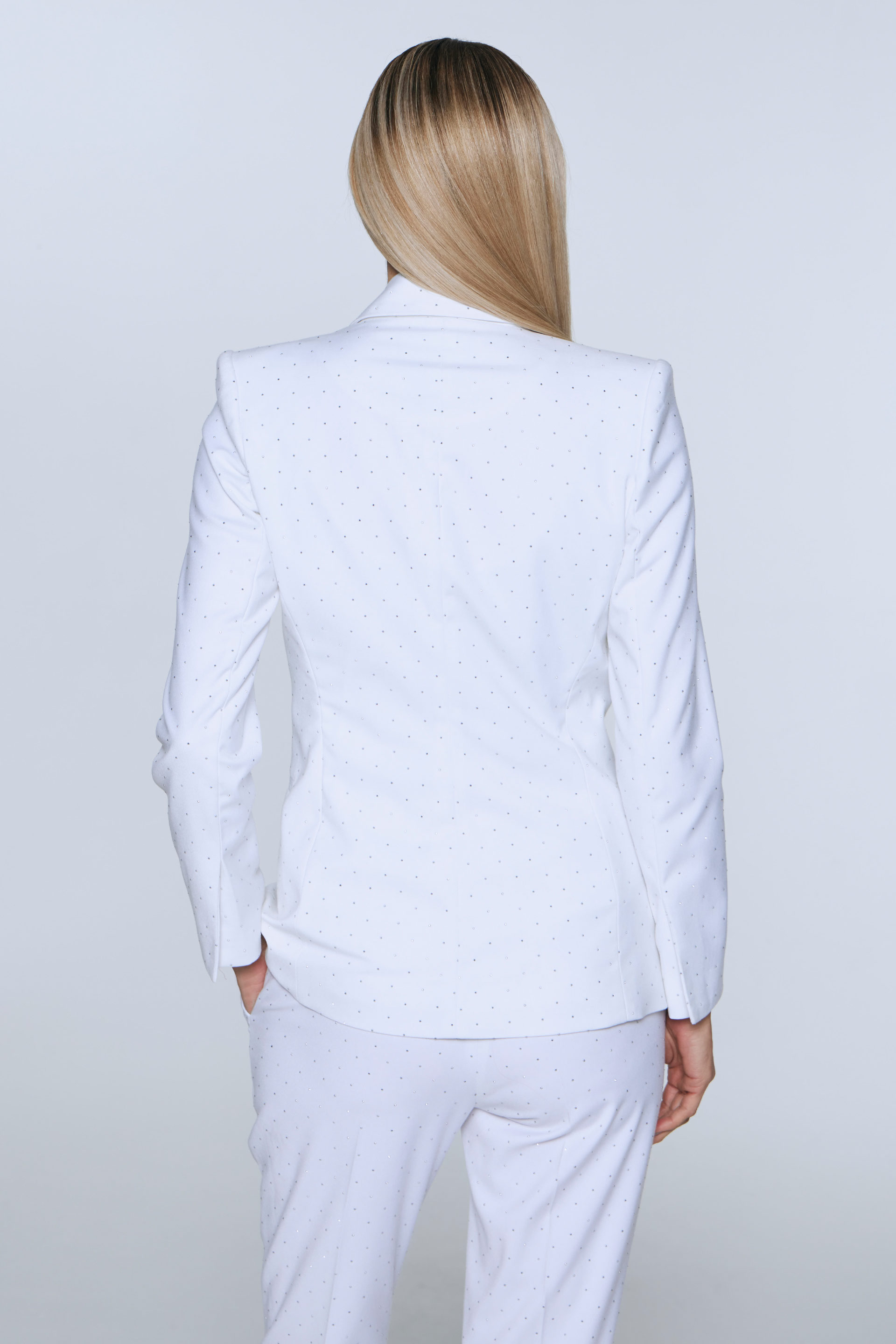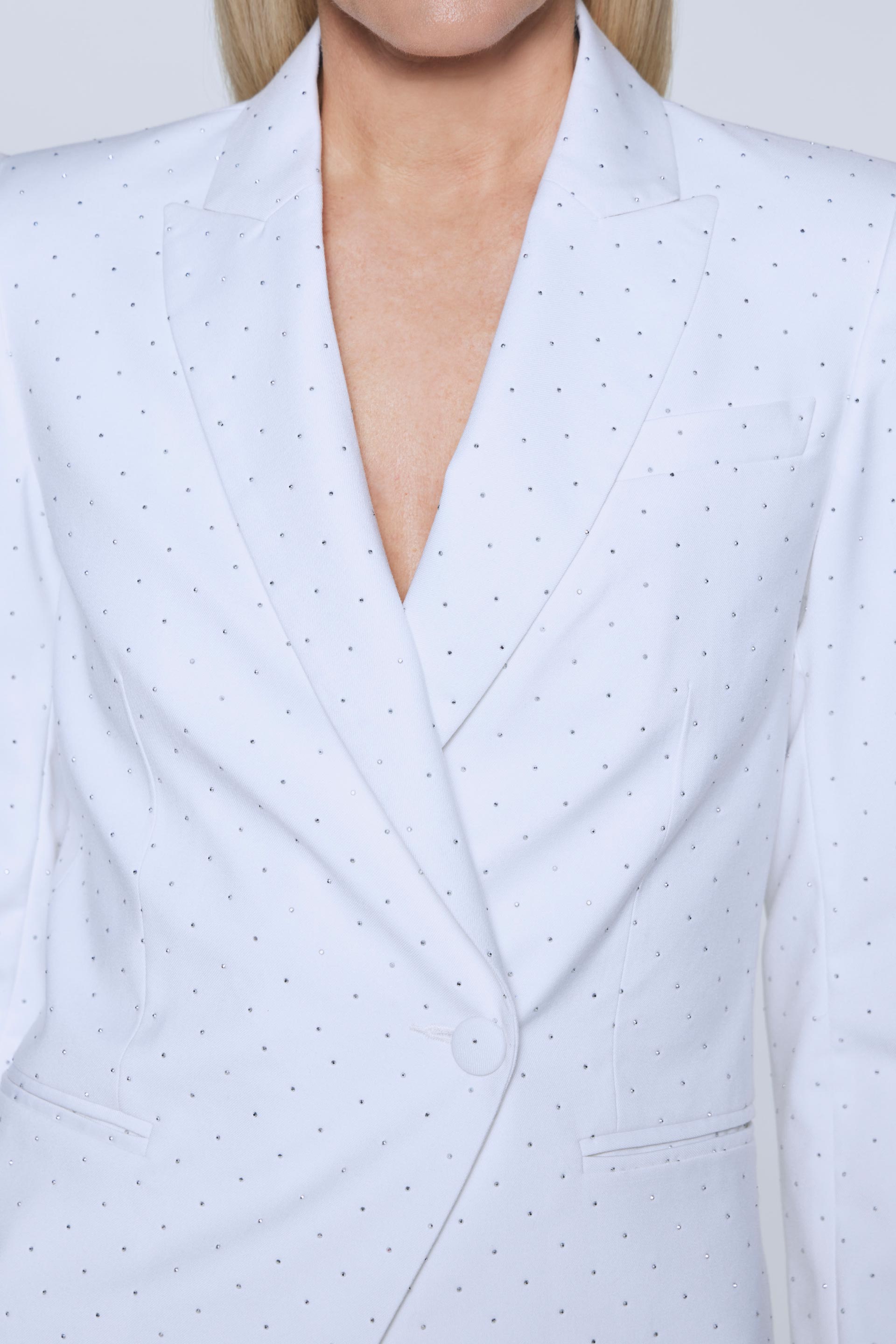 Blazer largo cruzado de sastreria viscosa con cristales termofusionados, silueta entallada y manga larga. Posee acceso con botón forrado, solapa y bolsillos con vivos. Su interior está forrado en satén elastizado generando extra confort. Combinalo con el pantalón Bagwis y armá un total look sofisticado ideal para un evento.