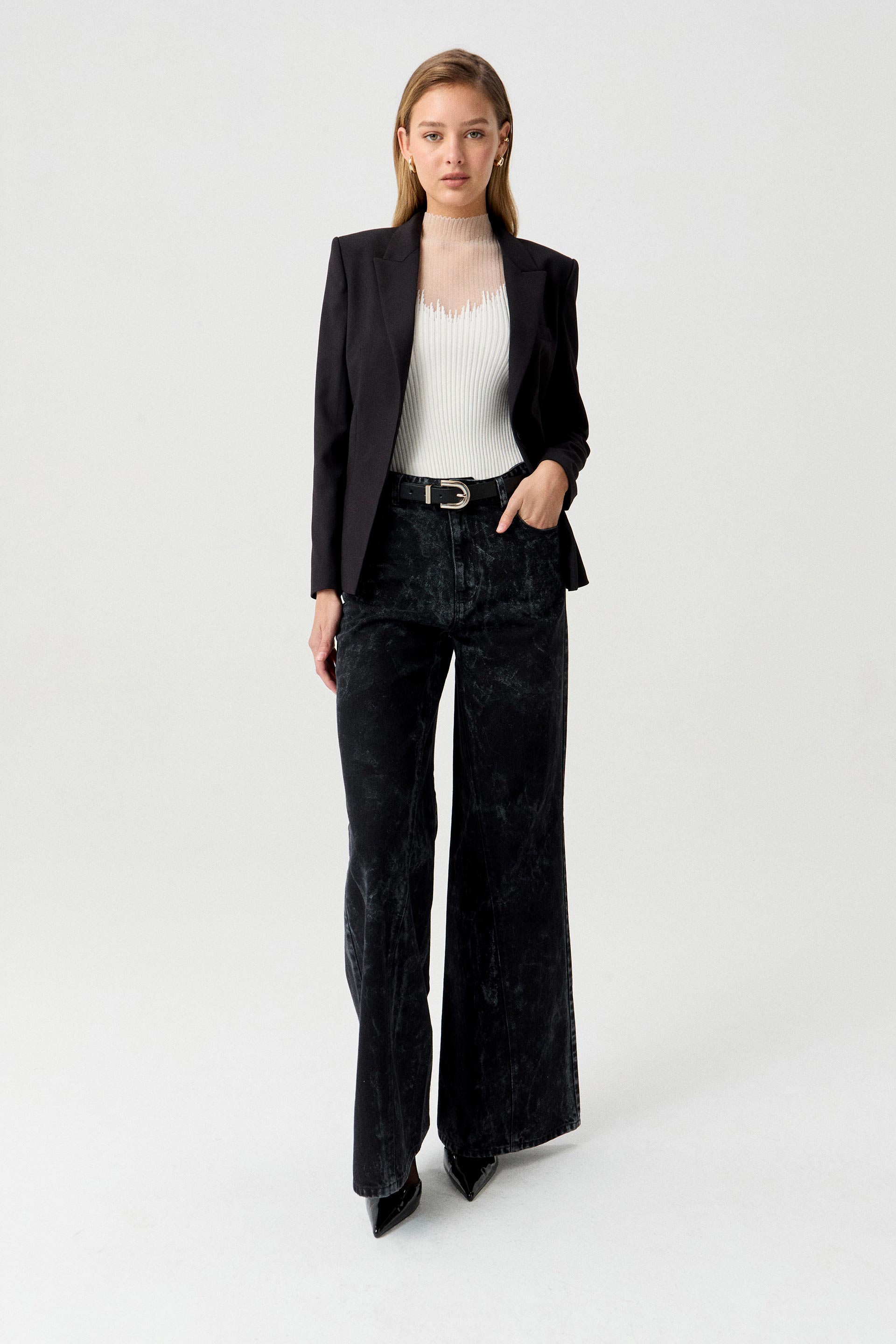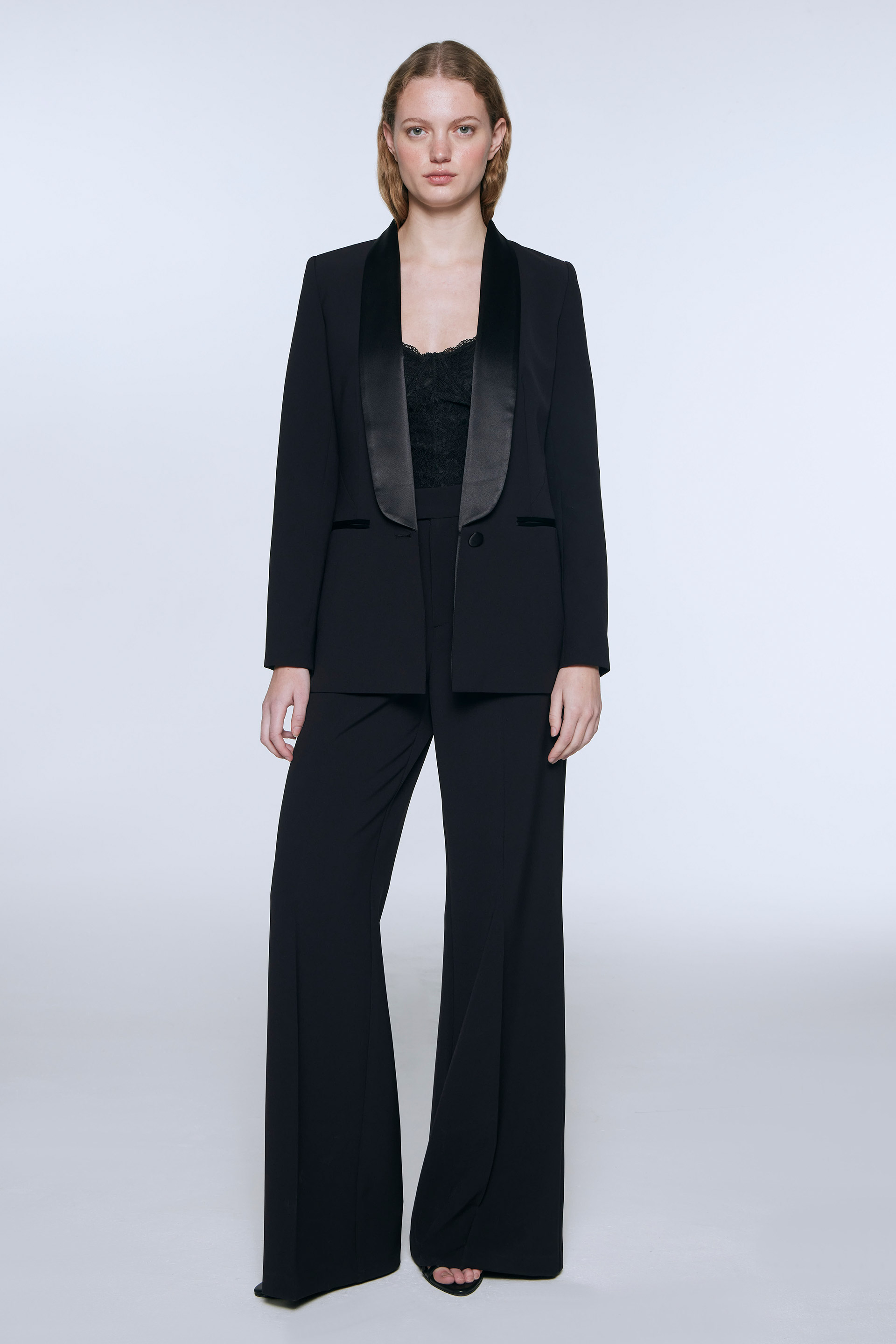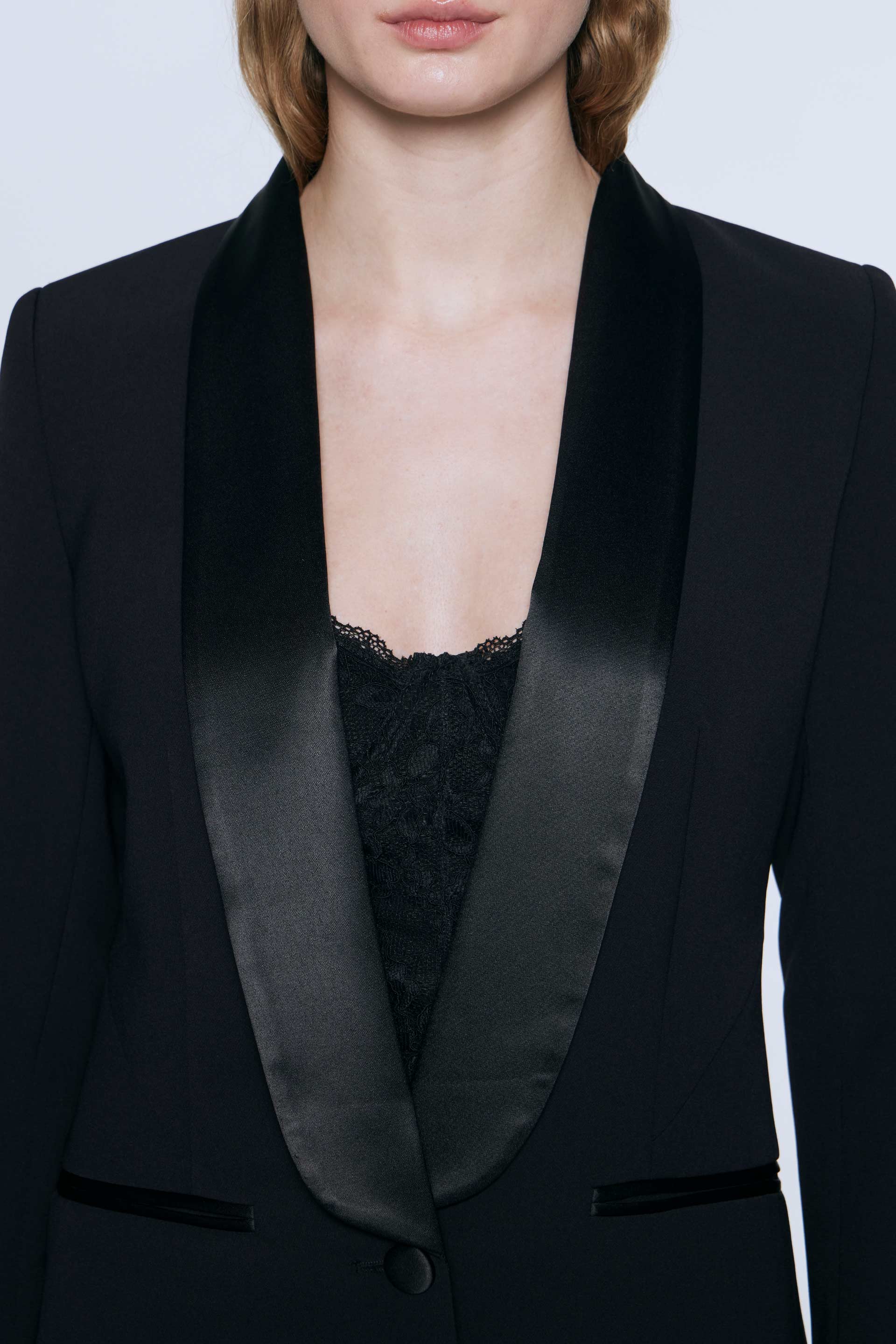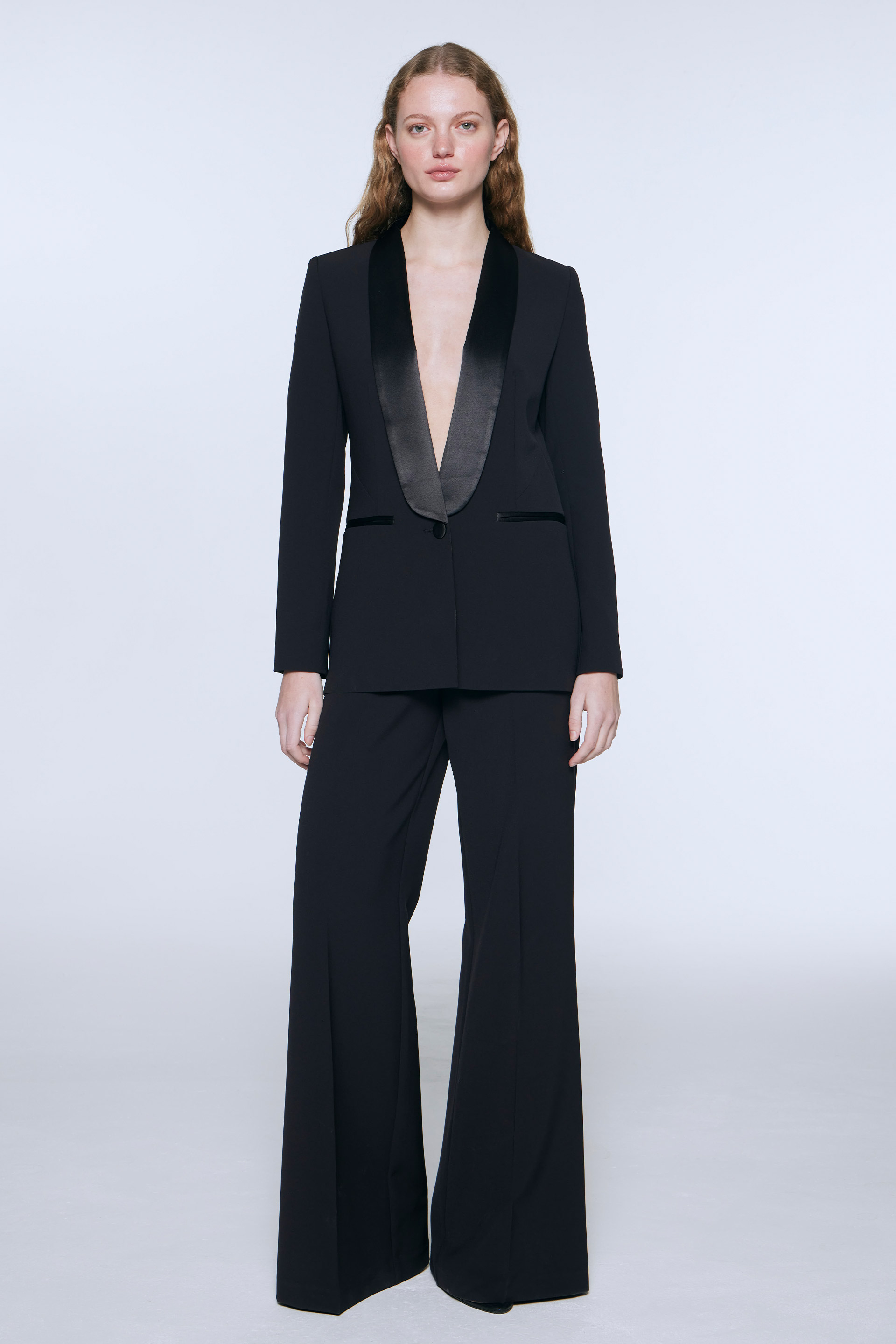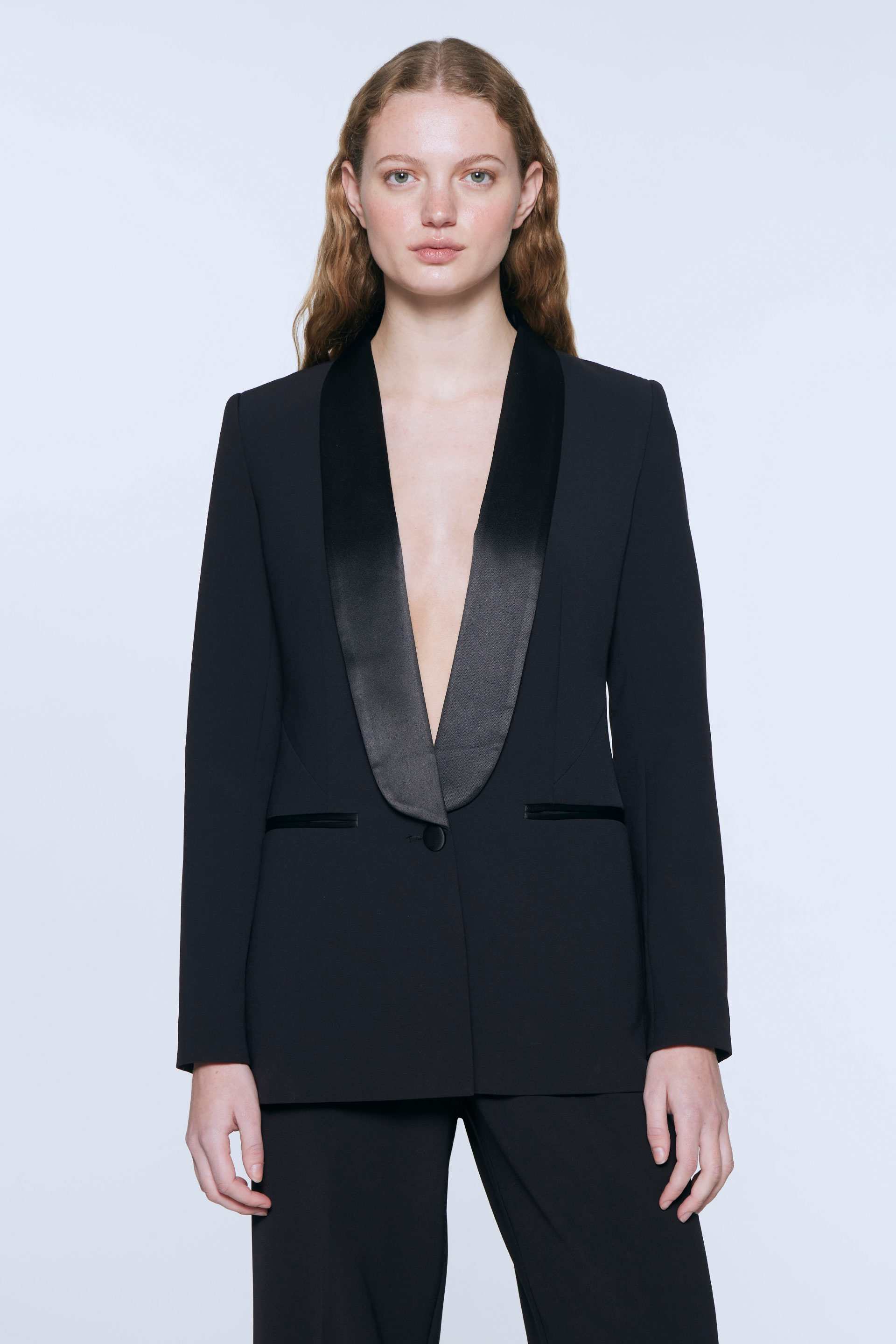 Blazer largo de sastreria elastizada, silueta entallada y manga larga. Posee solapa smoking en satén, acceso con botón forrado y bolsillos ojal. Su interior está forrado en acetato diagonal que le otorga mayor estructura a la prenda. Combinalo con el pantalón Zelda y armá un total.