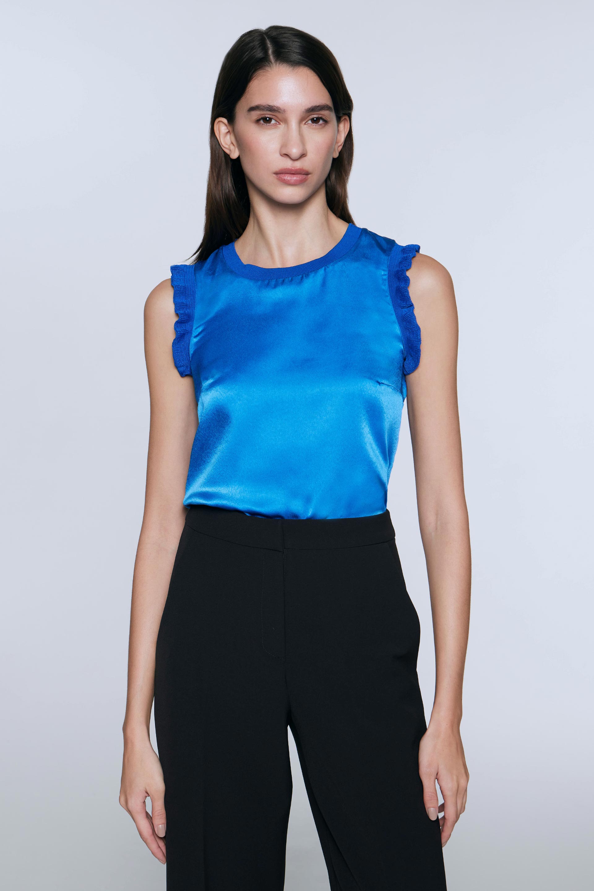 Top en sedita de calce relajado. Posee escote redondo amplio con cuello y volados tejidos en sisas. Comodín infaltable para armar looks femeninos de oficina o salidas de noche.
