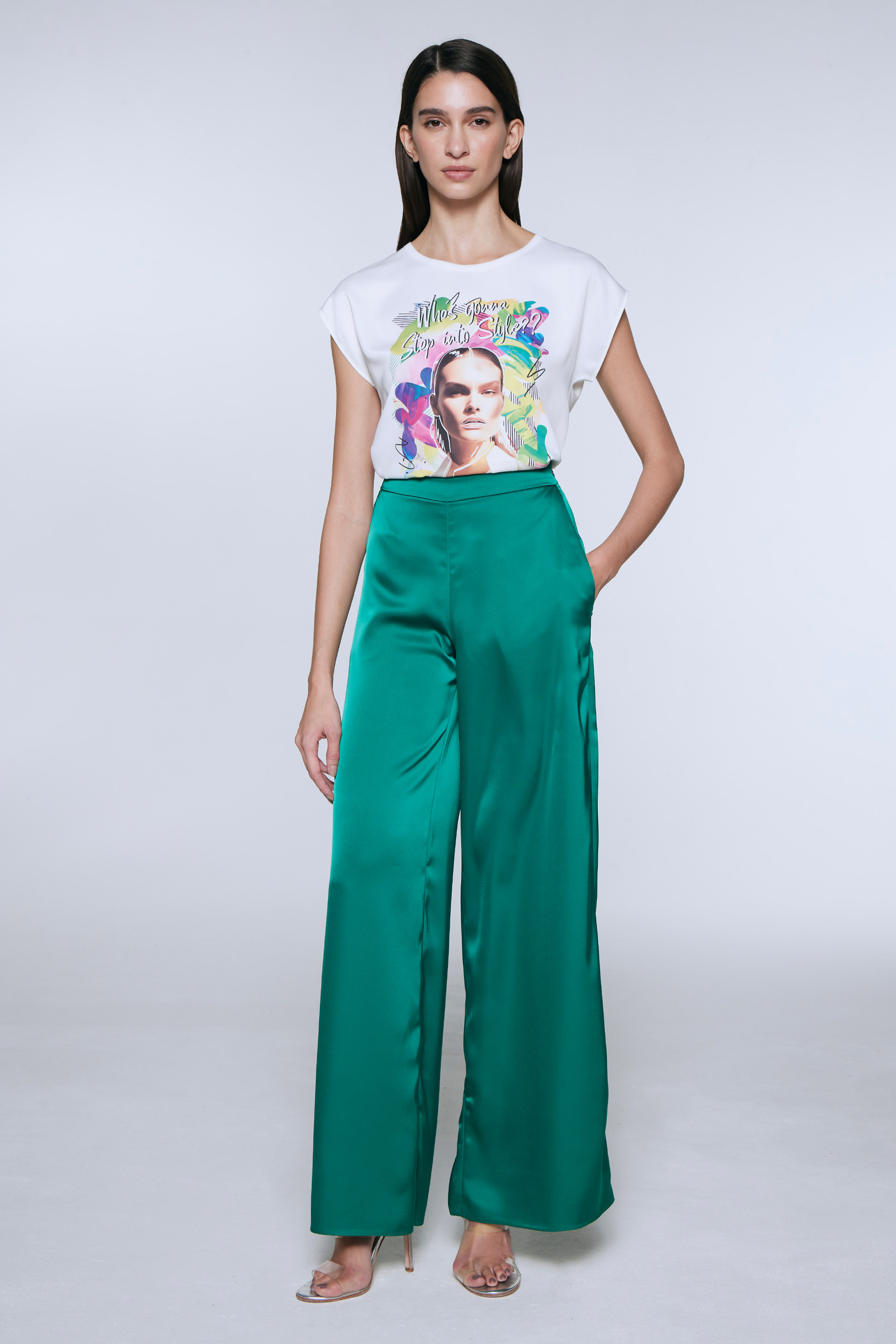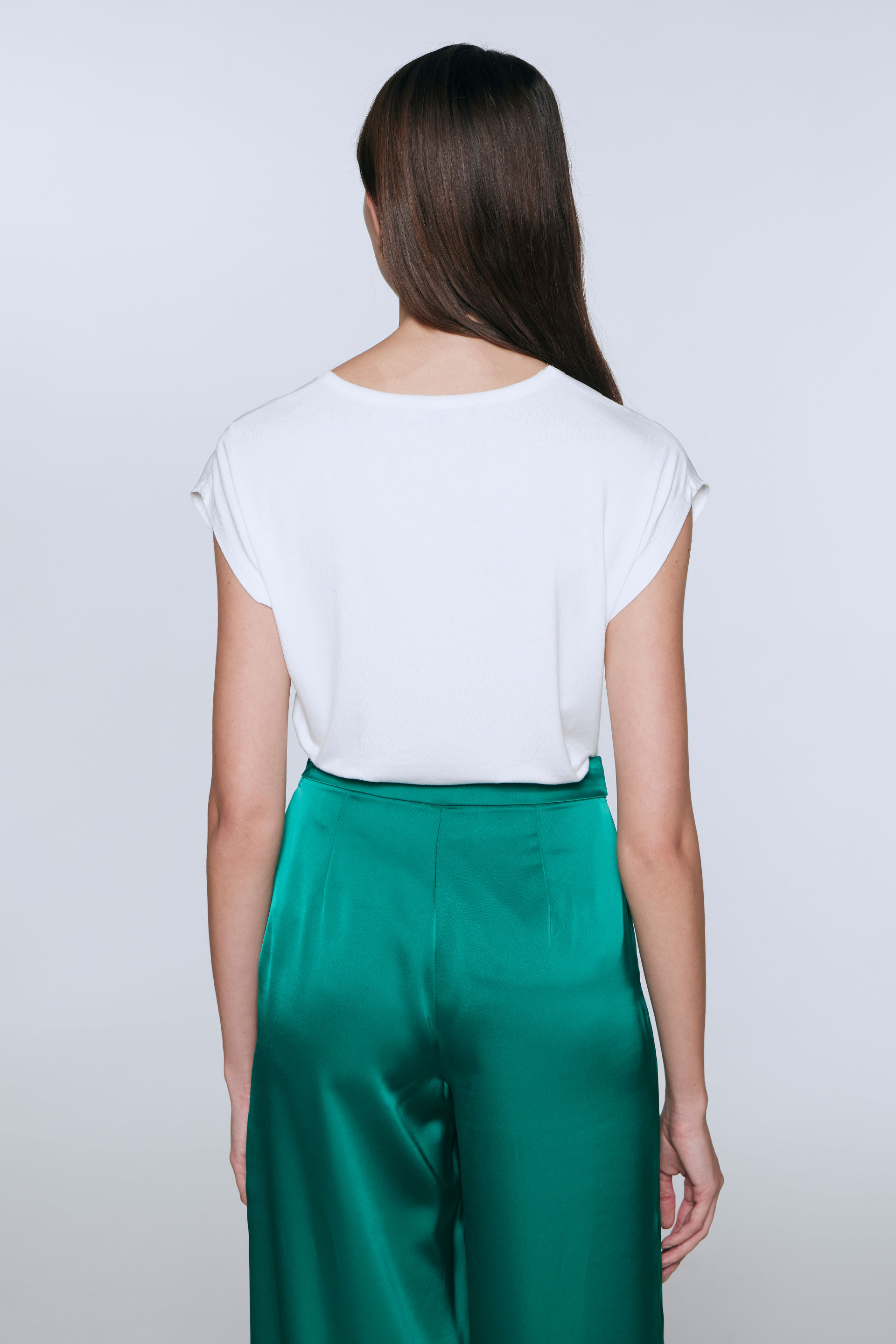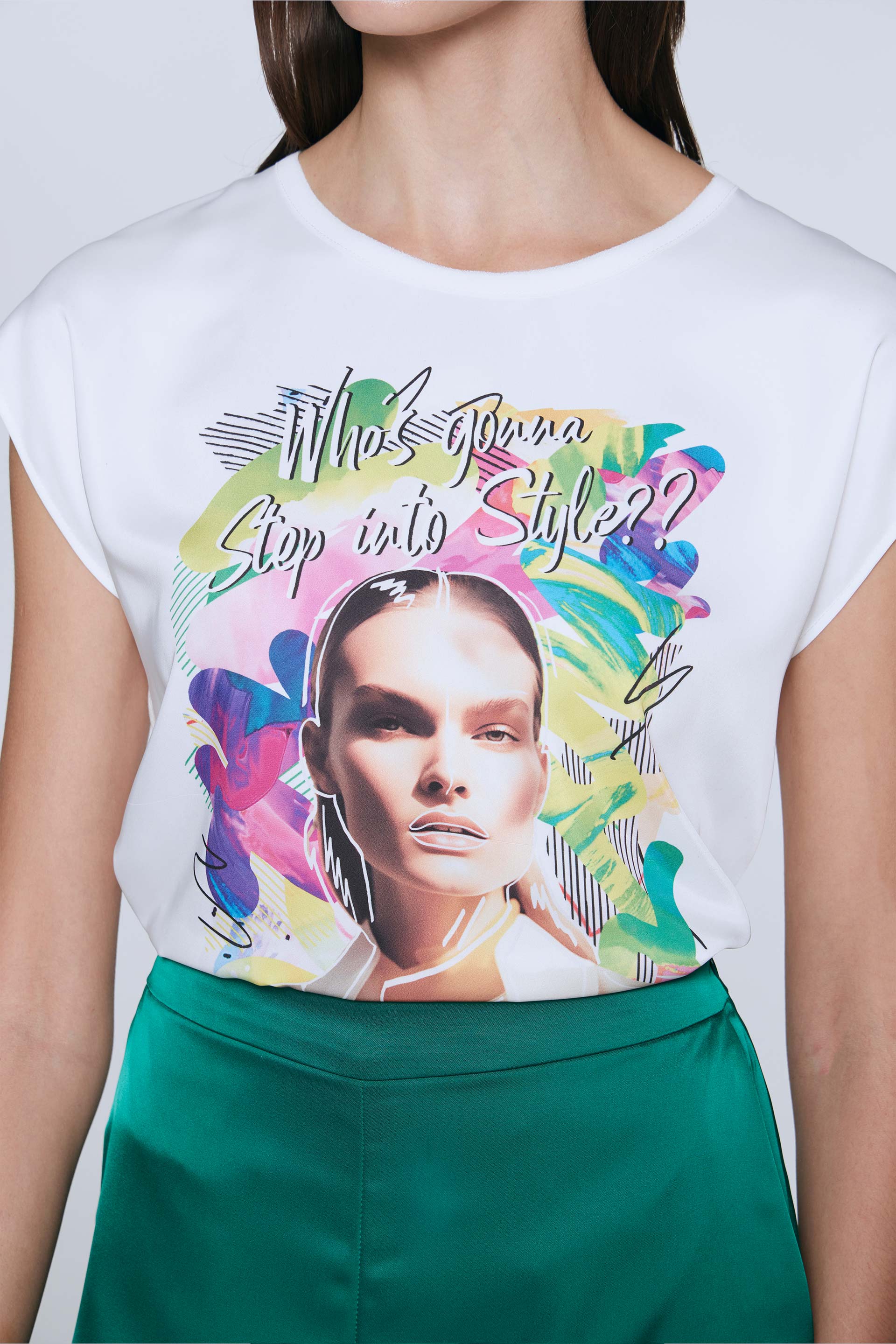 Remera de satén opaco con estampa central, combinada con gasa a tono en cuello y viscosa elastizada lisa a tono en espalda. Calce relajado, cuello redondo amplio y hombro caído. Dale un toque fresco y descontracturado a un look sastrero sumando este ítem.
