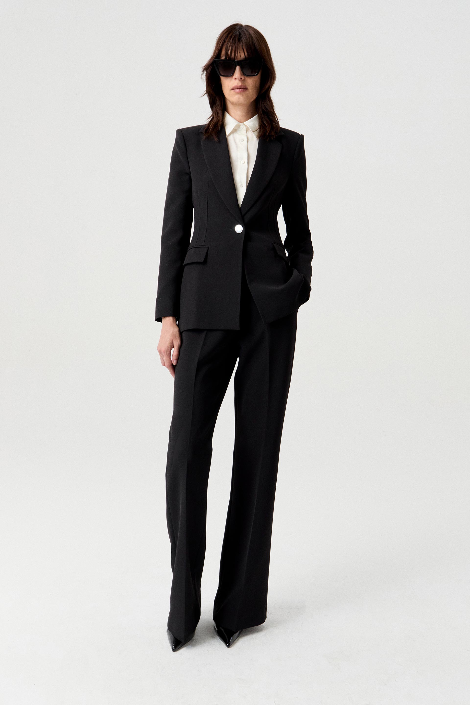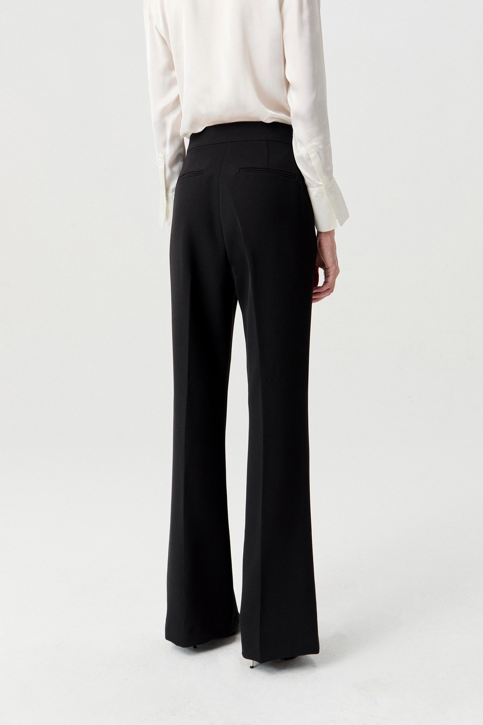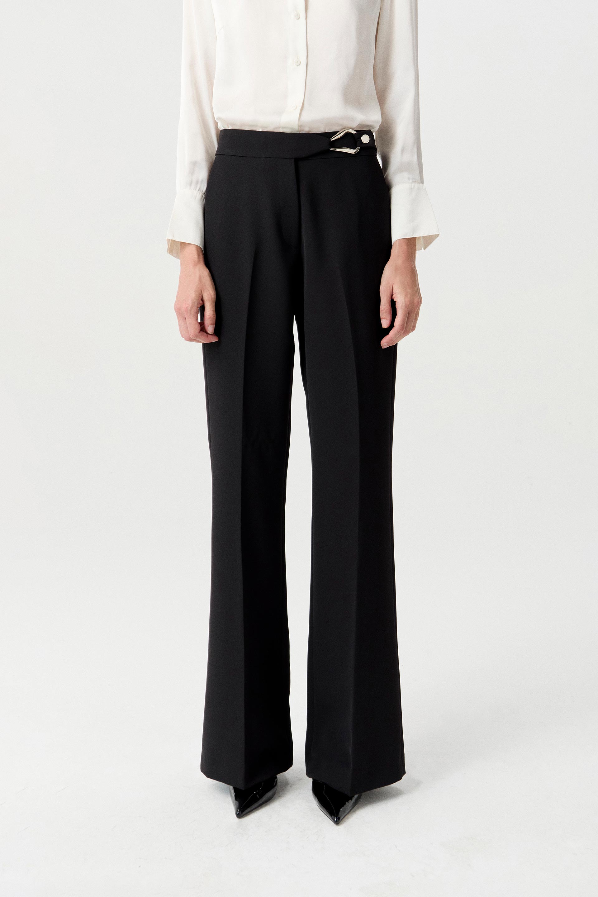 Pantalón de sastrería elastizada, de tiro alto y pierna flare. Posee bolsillos diagonales, cintura cruzada con hebilla metálica y botón personalizado MKV. Combinalo con el blazer Zete y obtené un total look elegante, moderno y sofisticado.