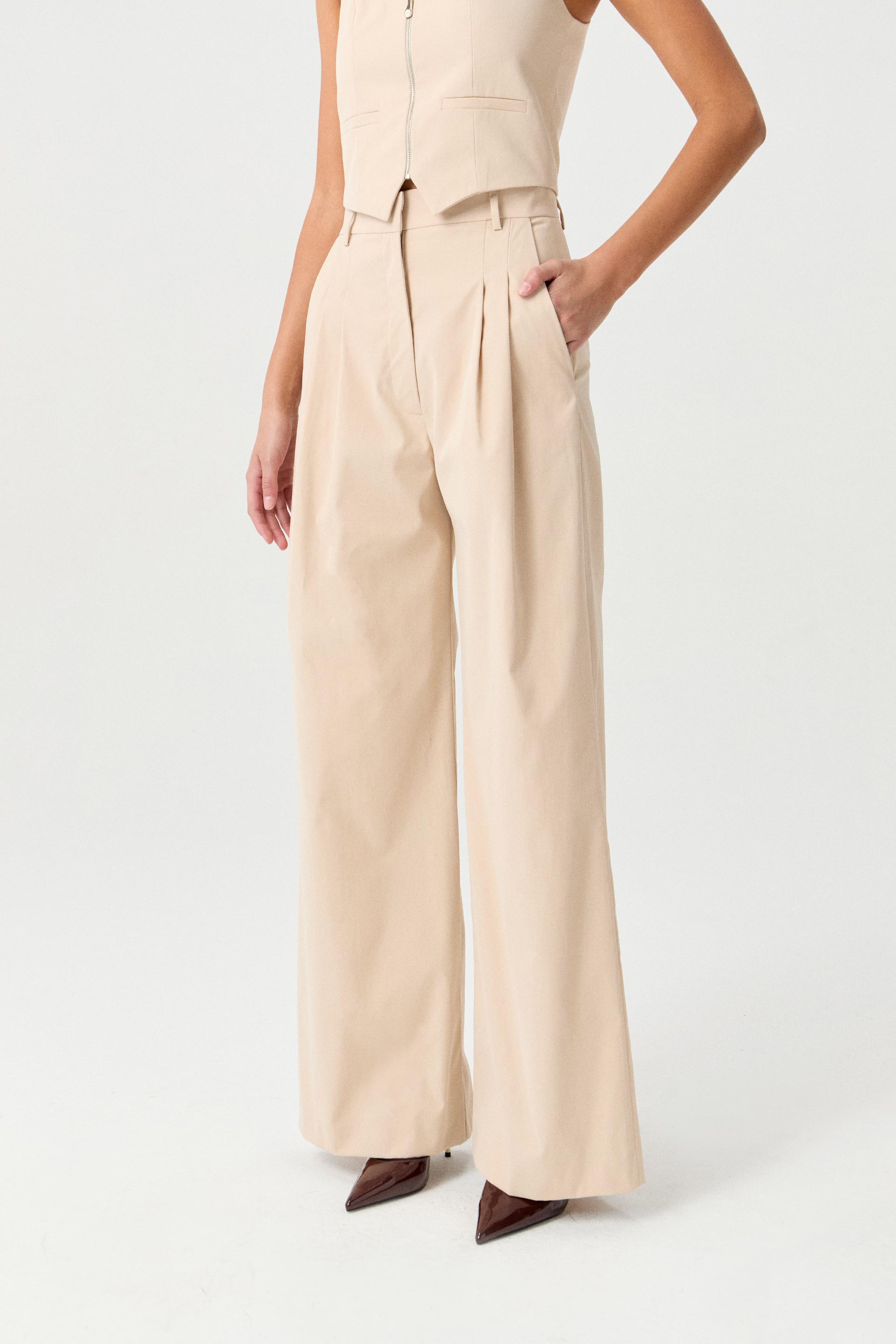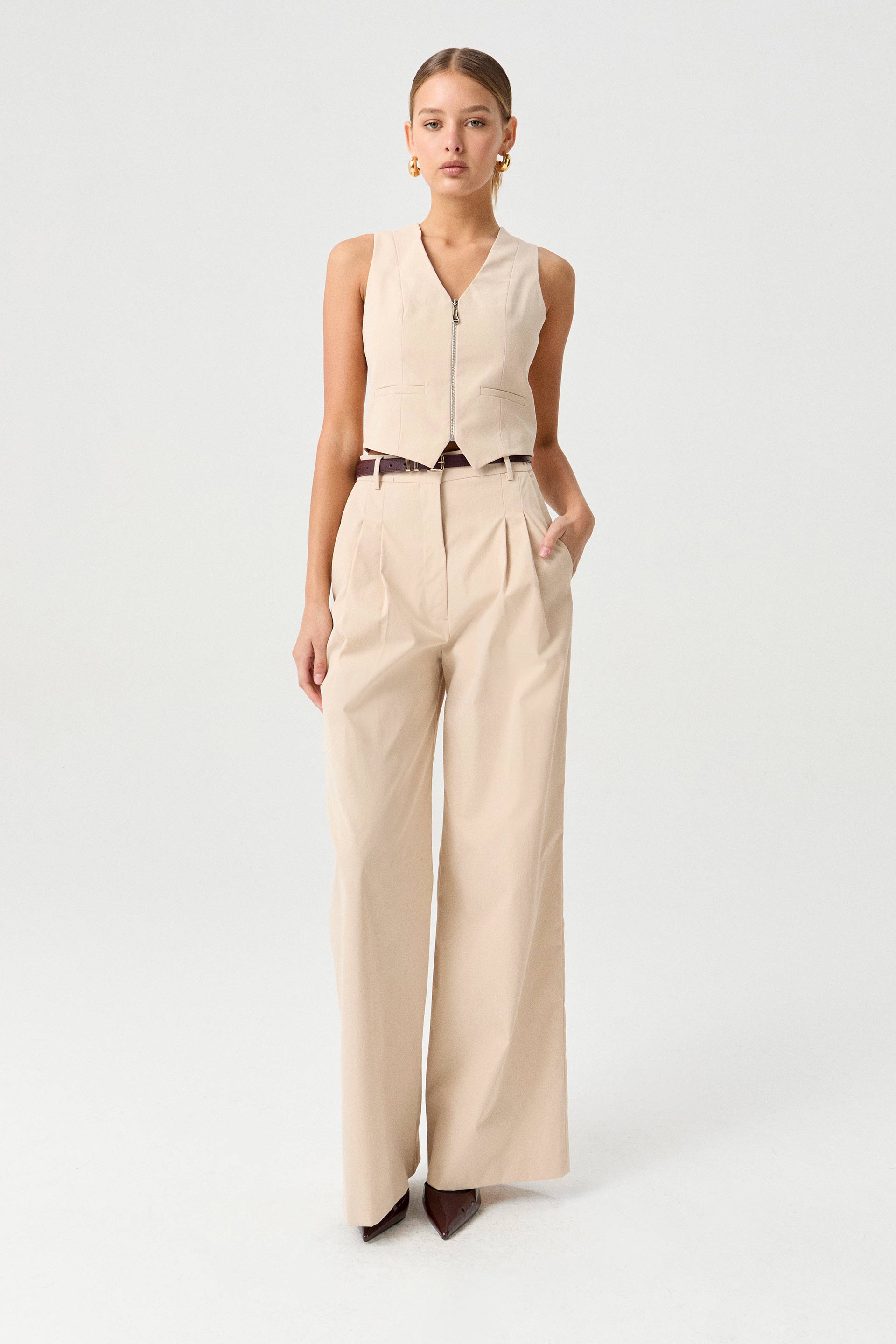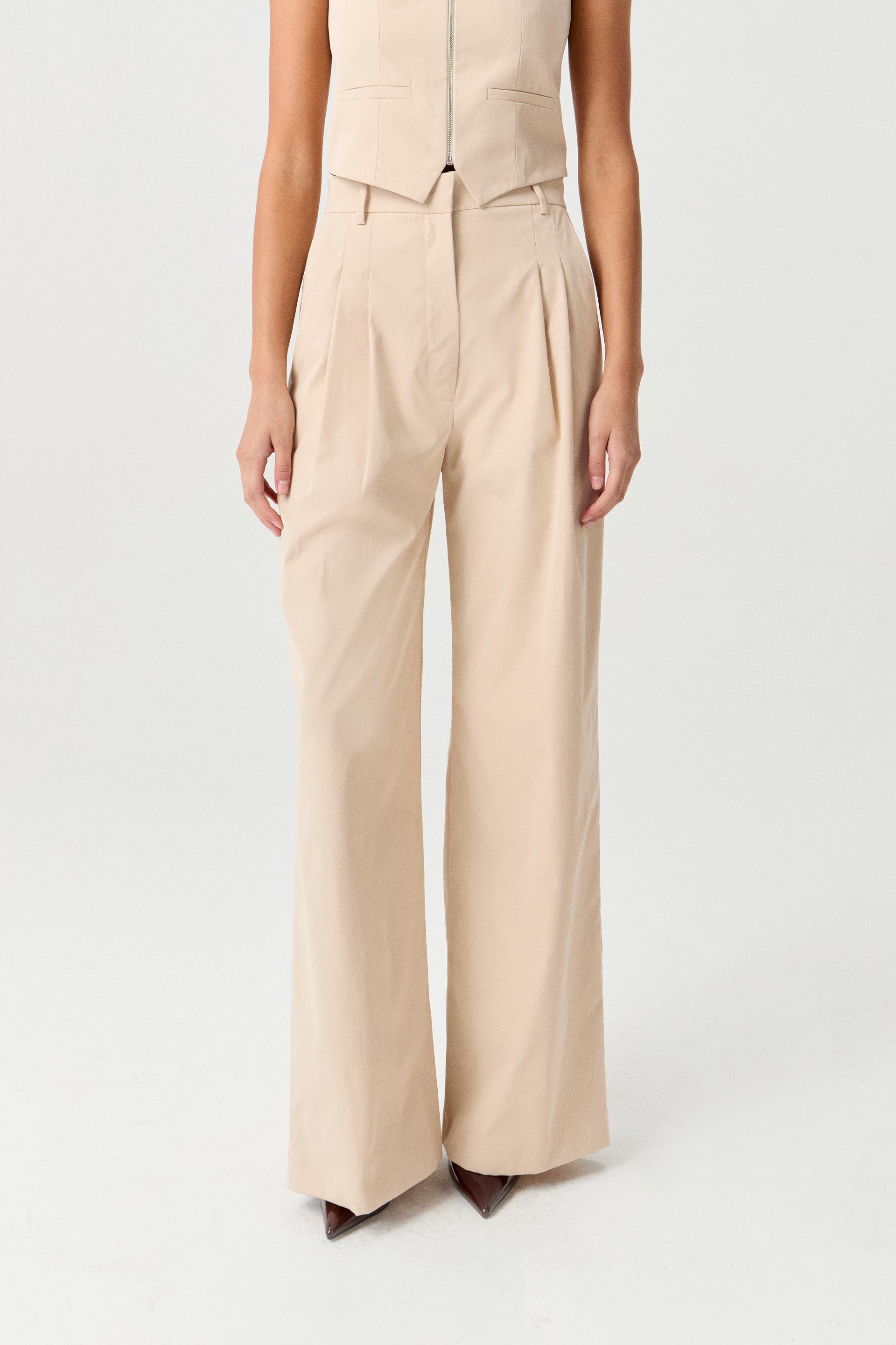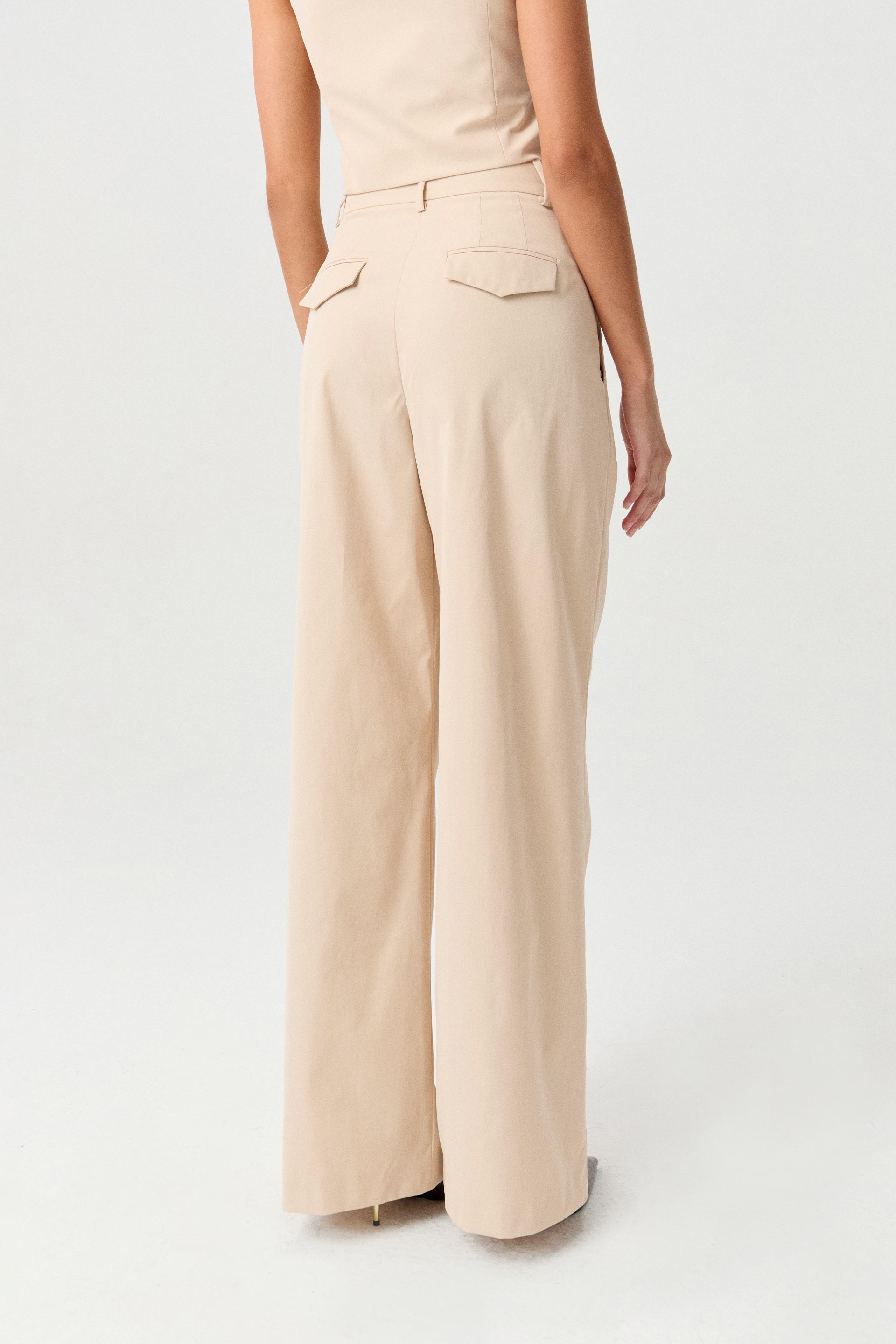 Pantalón de sastrería twill, tiro alto y pierna ancha. Posee doble tabla en delantero, bolsillos diagonales y cintura con presillas. Combinalo con el chaleco Tony para armar un total look moderno ideal para un evento o una salida.