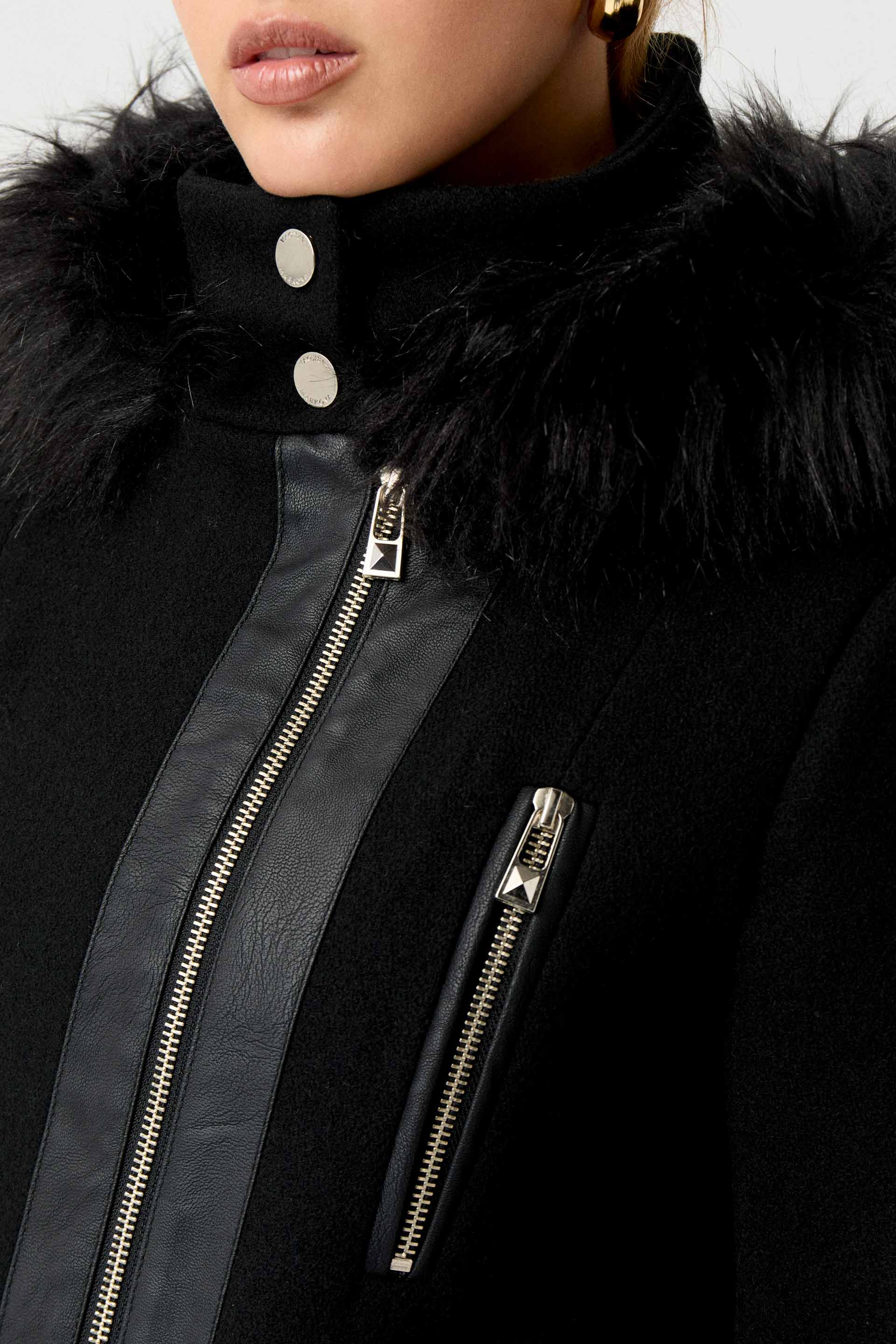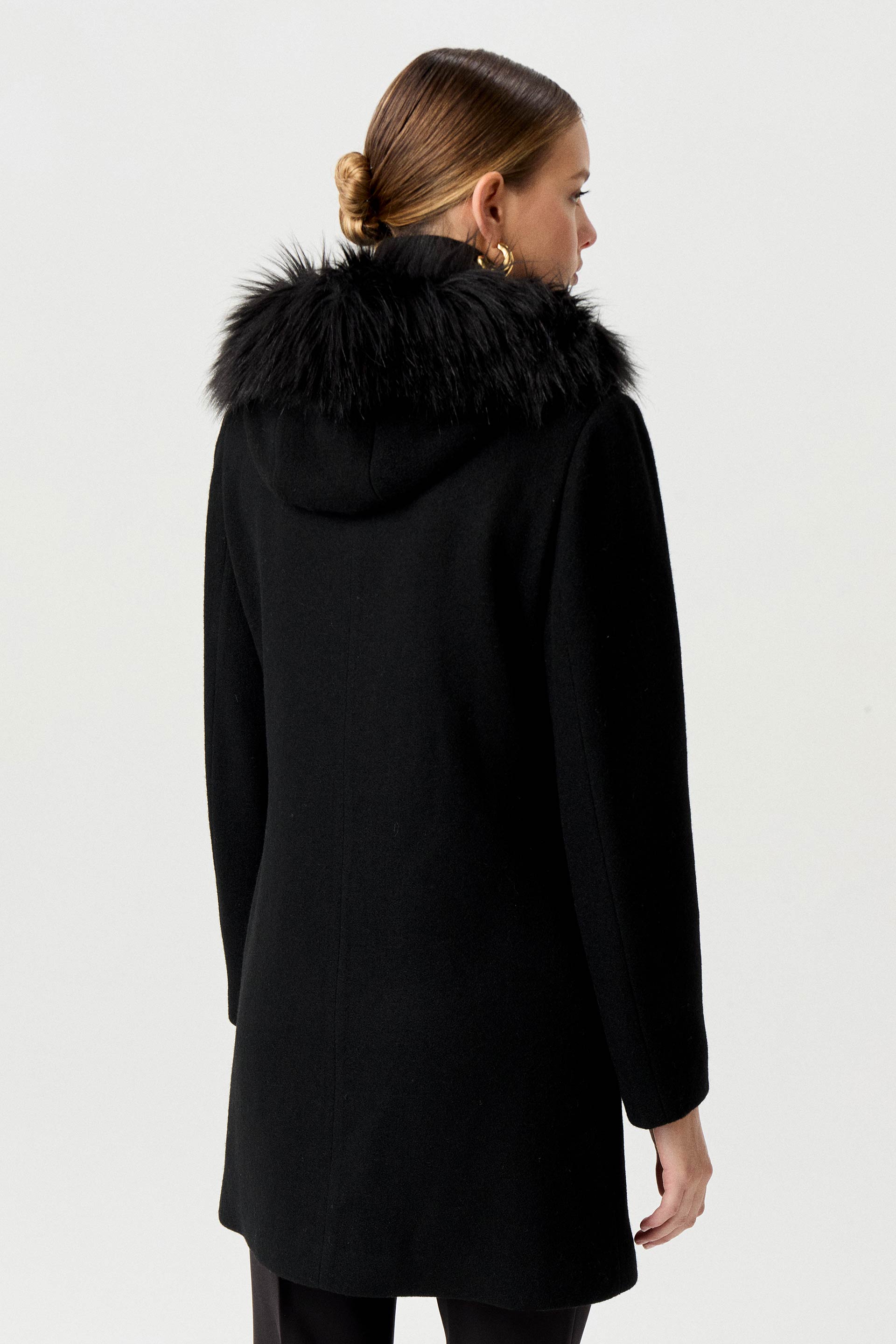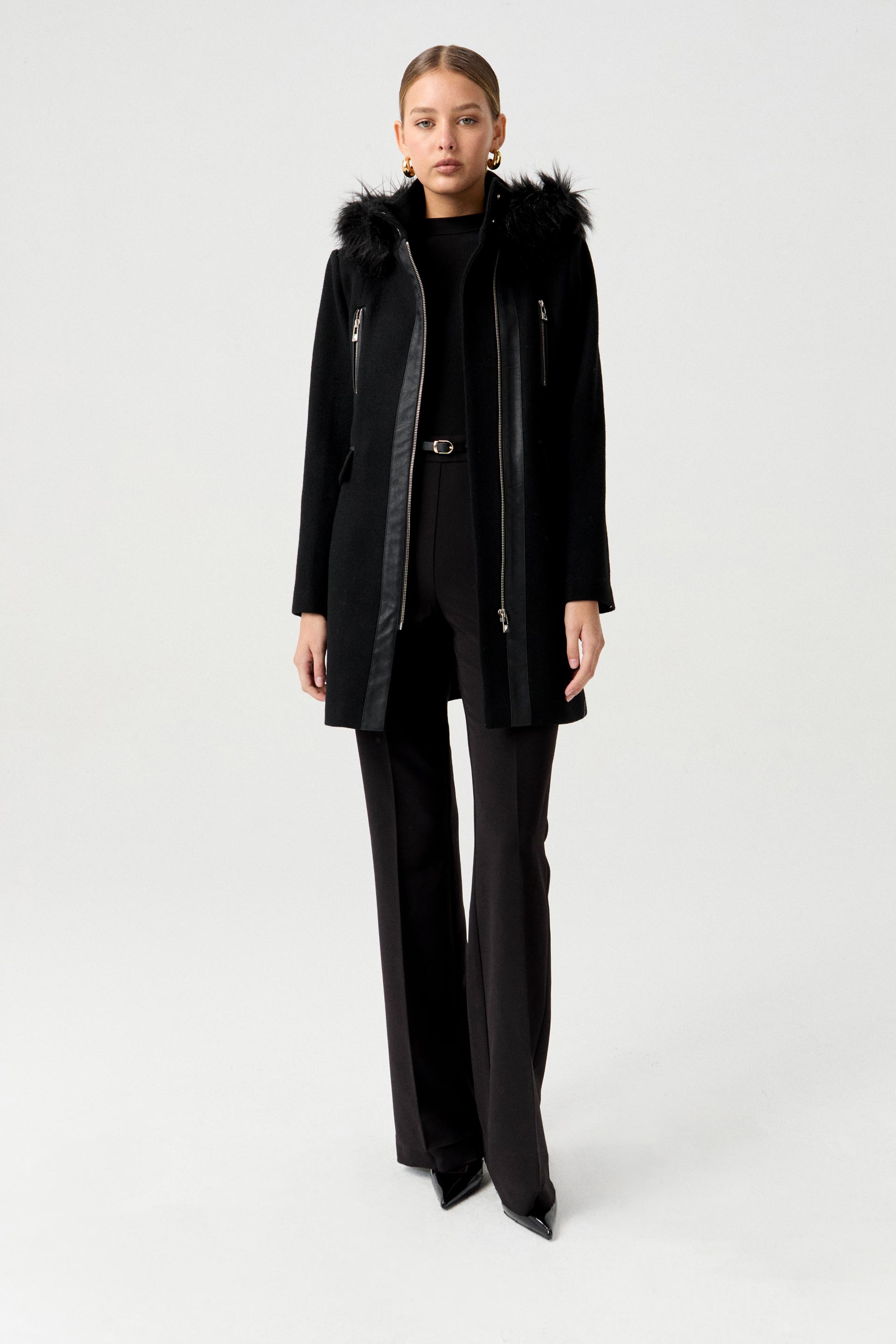Tapado de paño de lana premium, de silueta entallada y manga larga. Posee cierres y broches metálicos personalizados MKV, capucha con pelo y vivos en efecto cuero. Un tapado clásico y elegante que no te puede faltar este invierno en tu guardarropas.