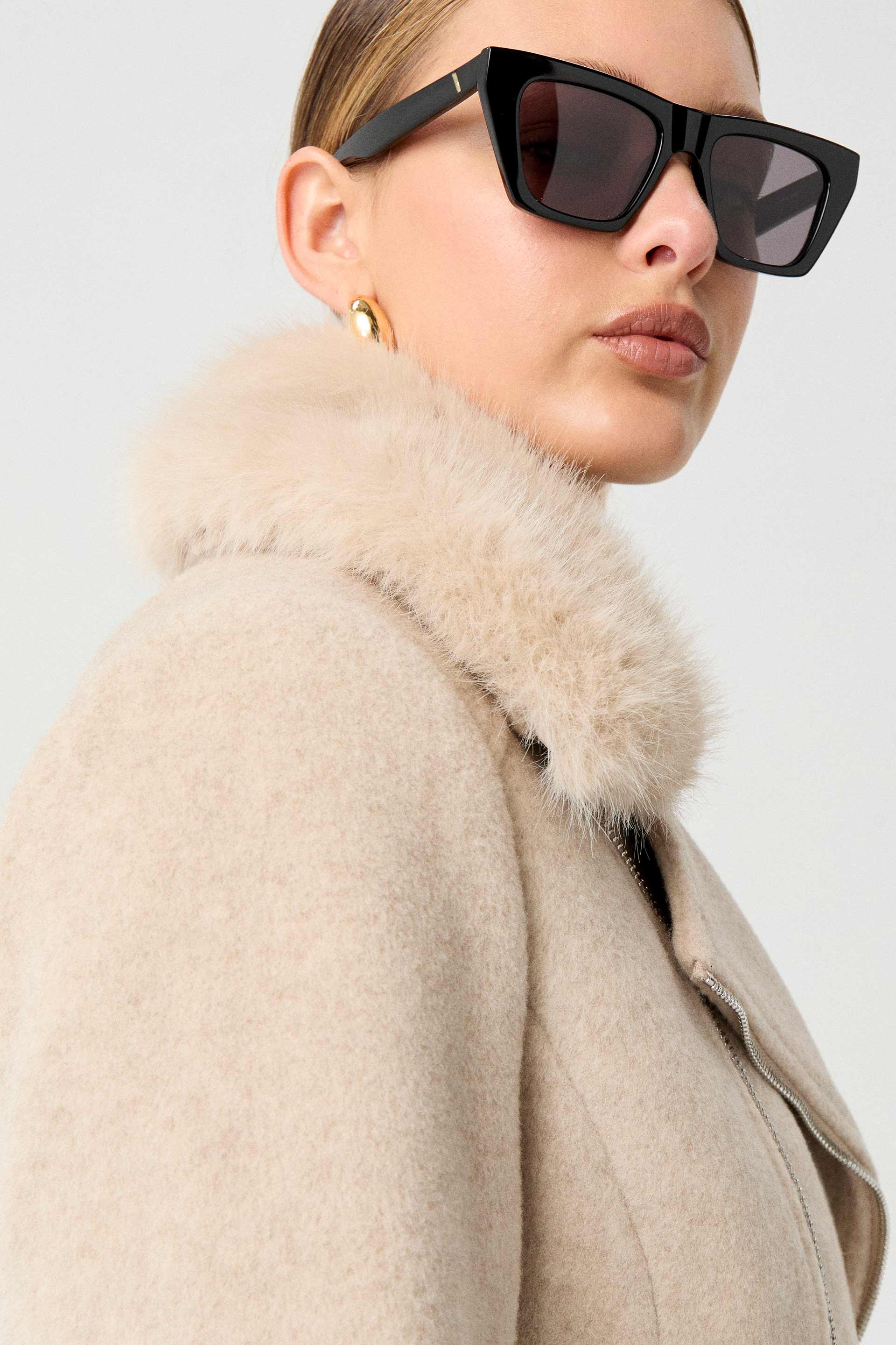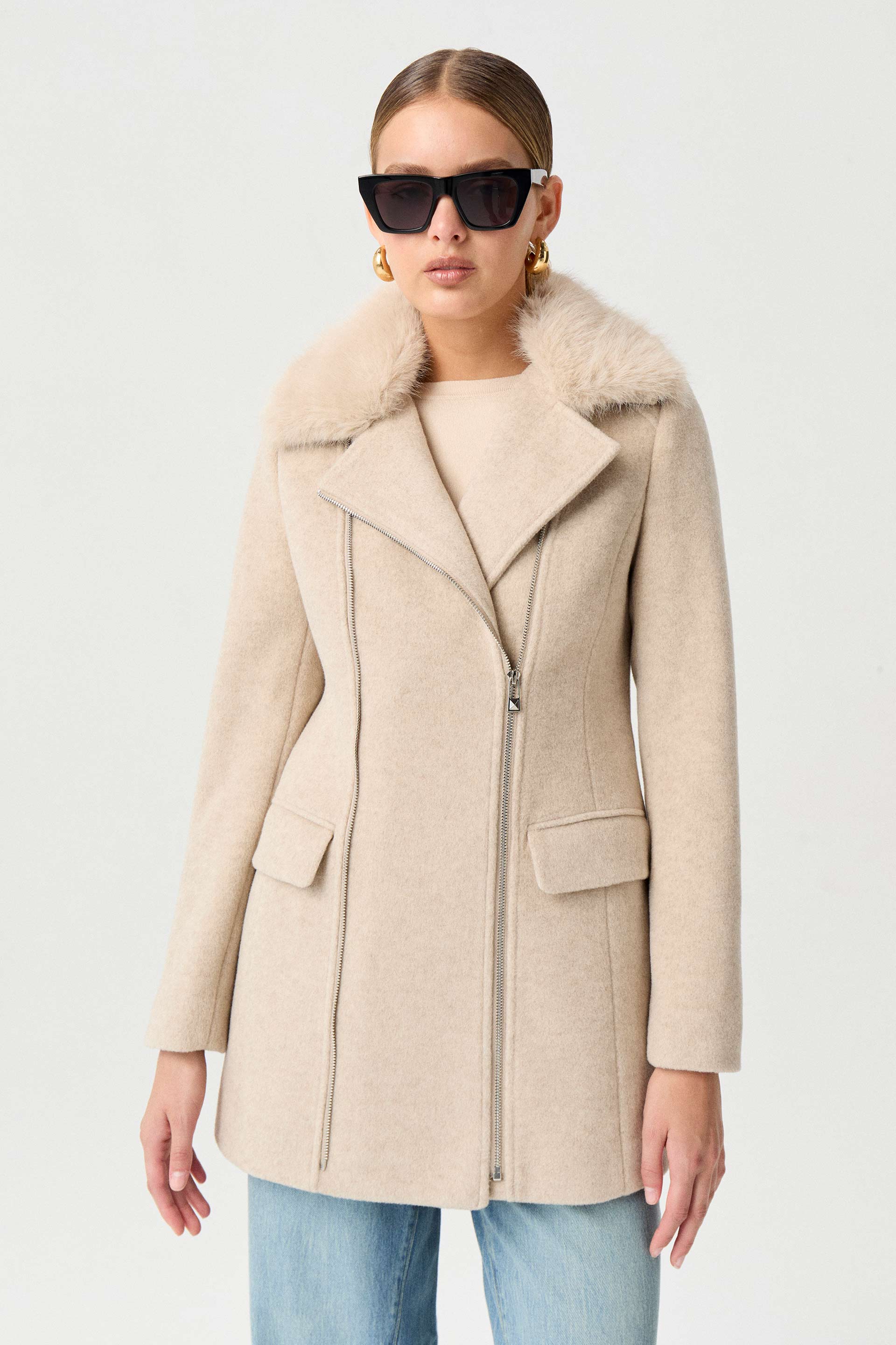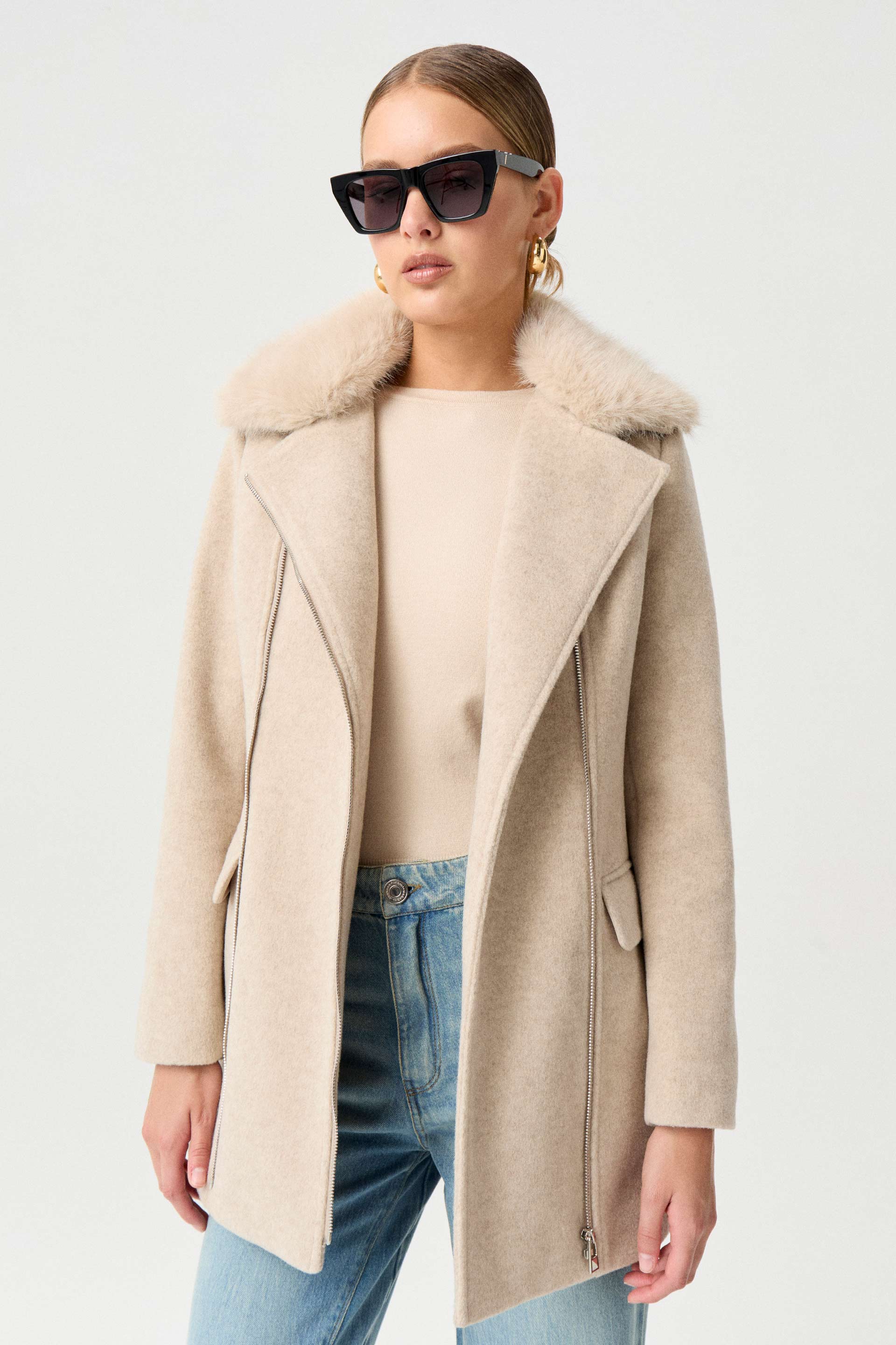Tapado de paño melange, de silueta entallada, cruzado y manga larga. Posee cierres metálicos personalizados MKV y pelo desmontable en cuello. El clásico tapado biker pero con un twist moderno, sin duda una apuesta segura para sumar a tu guardarropas.