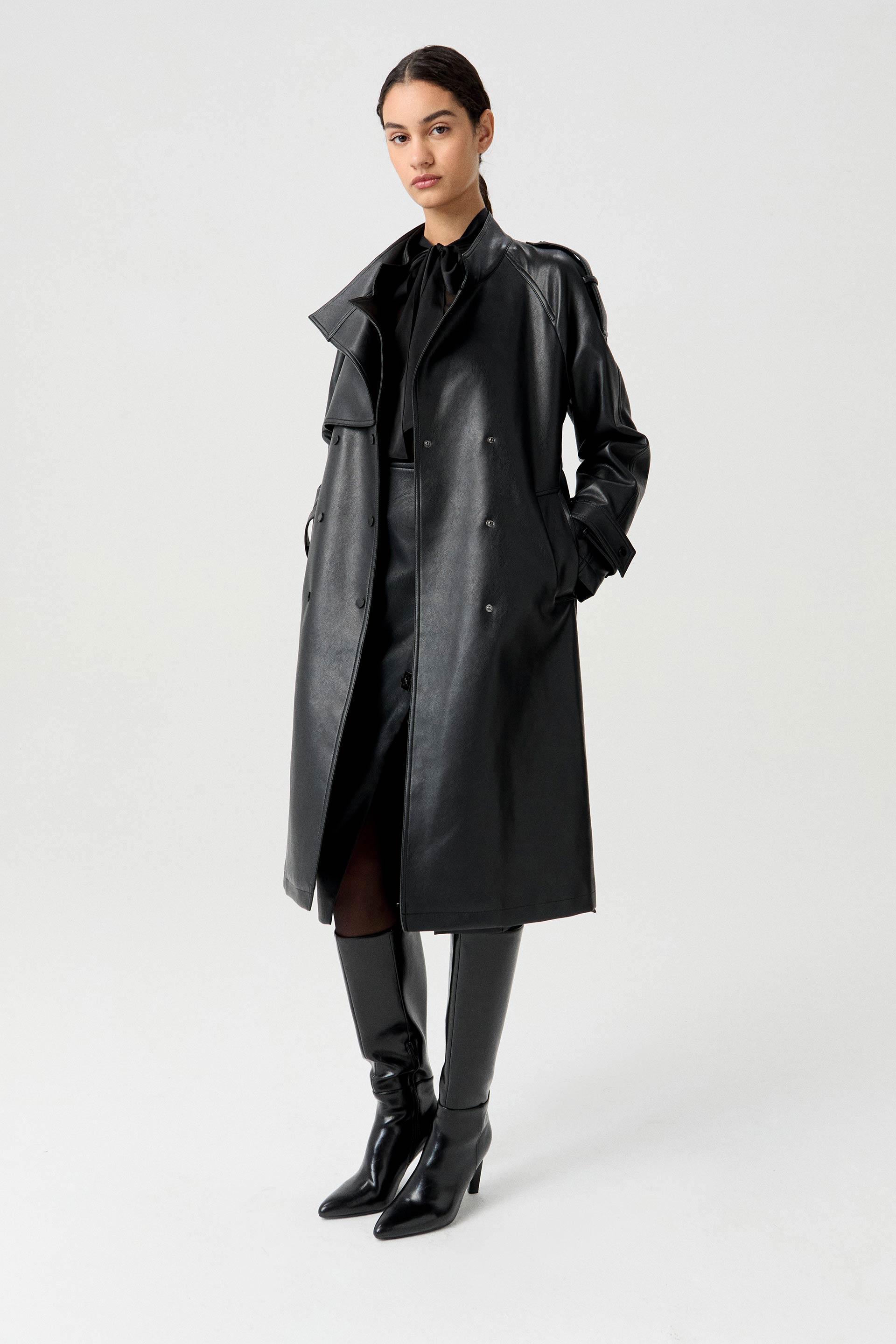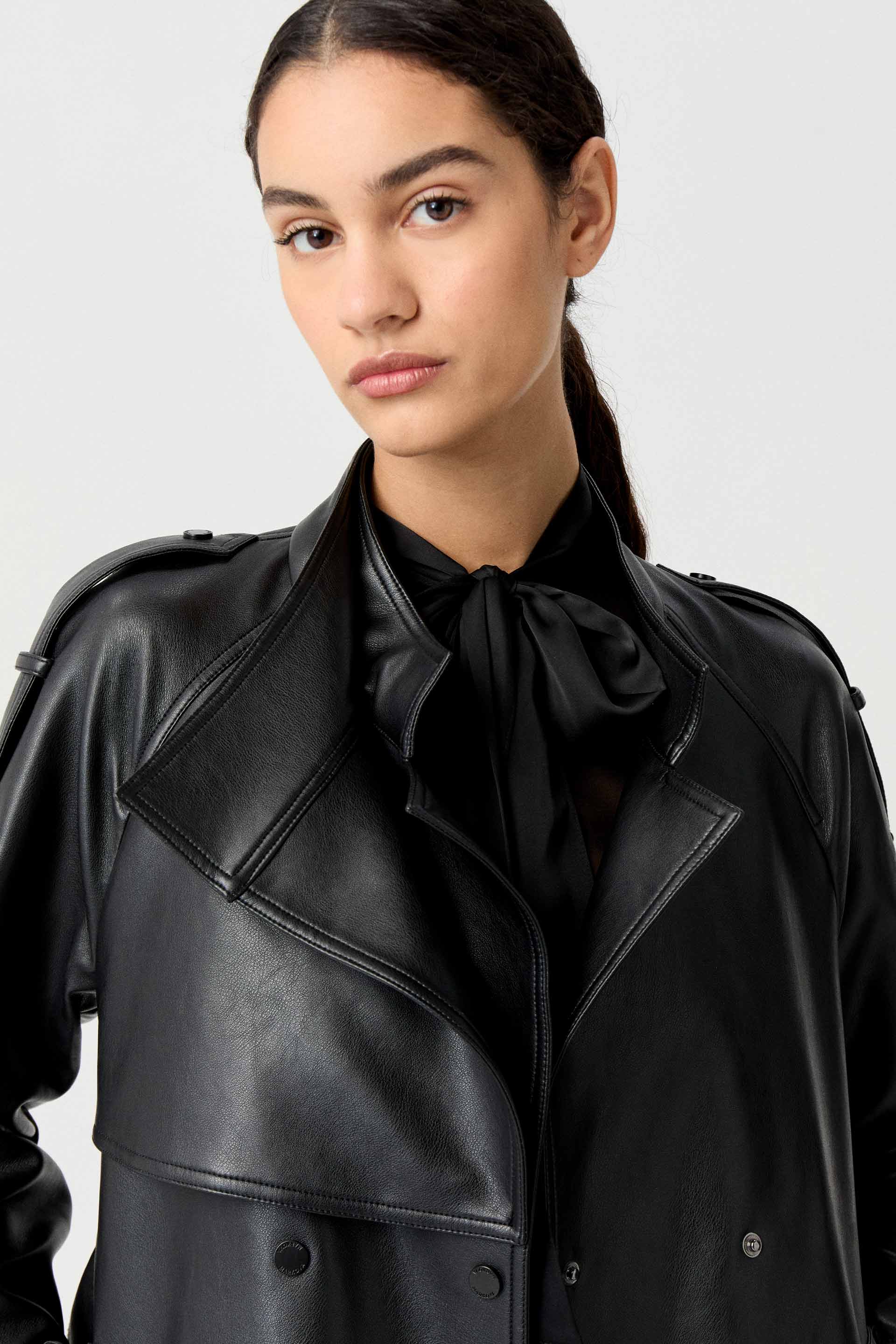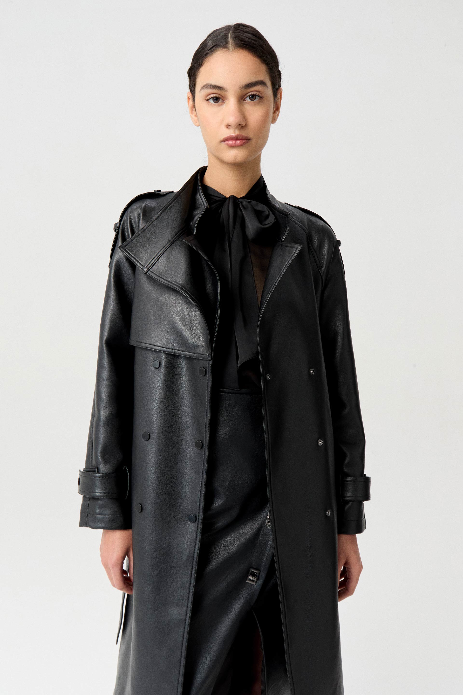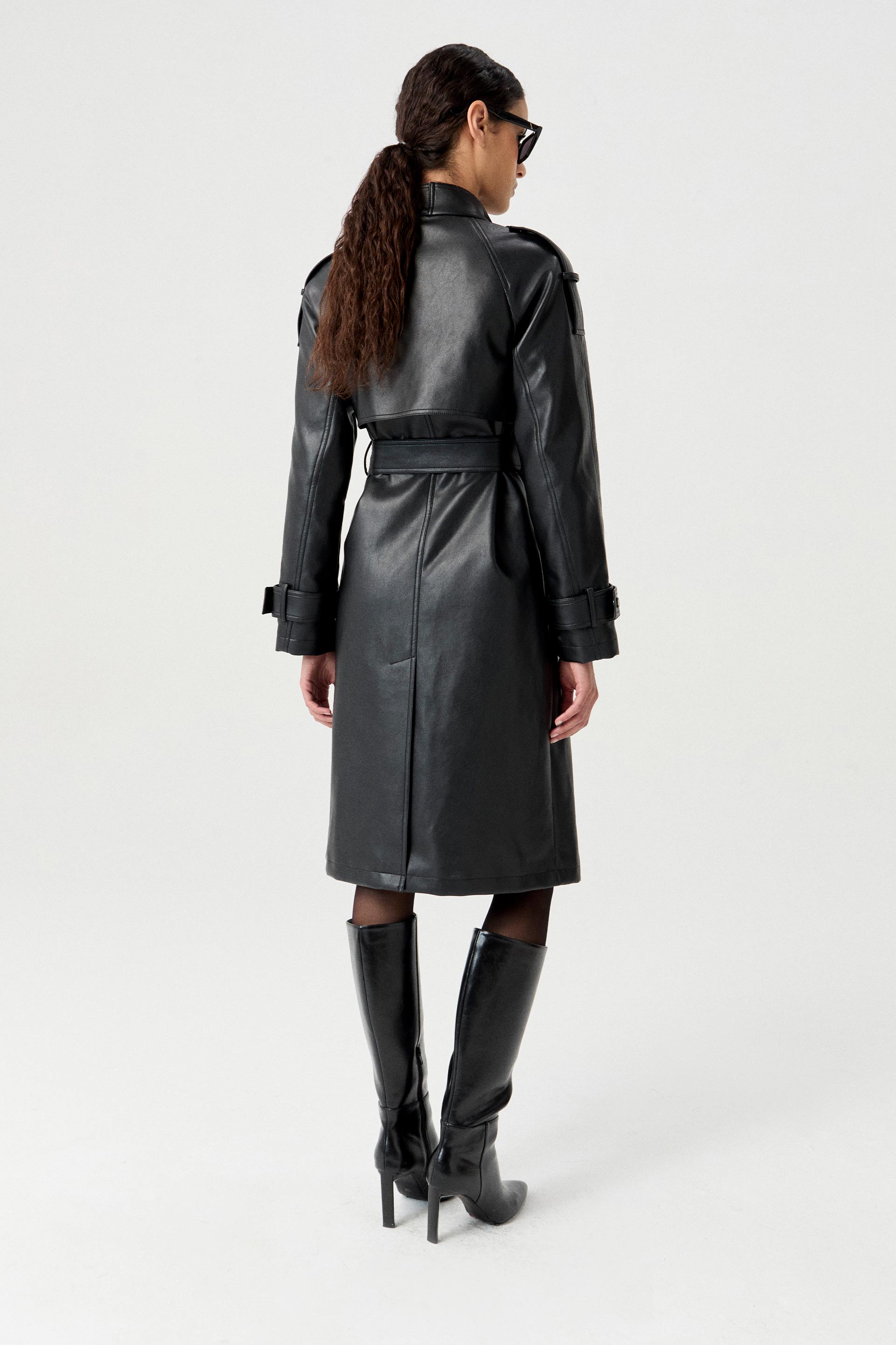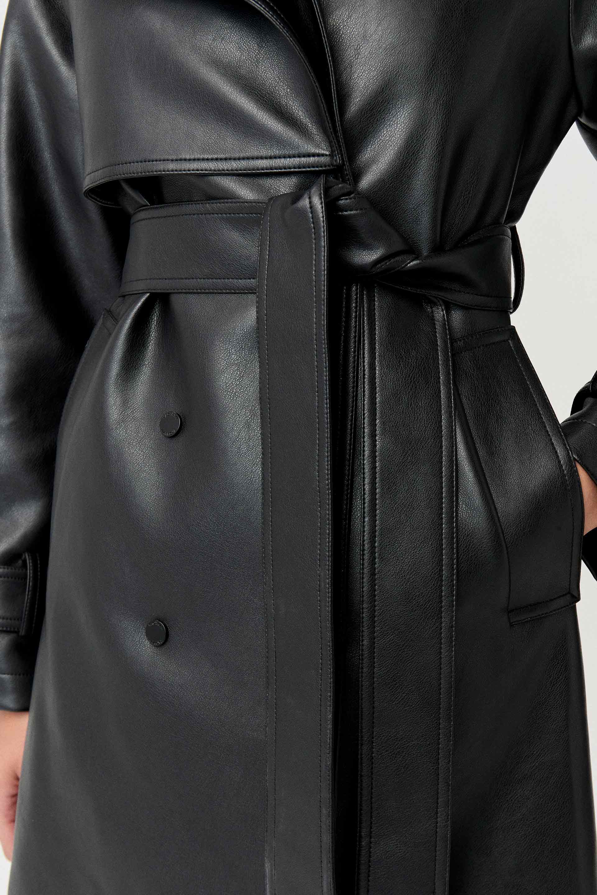 Trench efecto cuero, de silueta entallada, con solapa doble y manga larga. Cruzado, posee acceso con broches metálicos personalizados MKV a tono, lazo en cintura para un mayor entalle y bolsillos diagonales. Su género efecto cuero y su largo modular lo convierten en un ítem de tendencia capaz de elevar cualquier outfit.