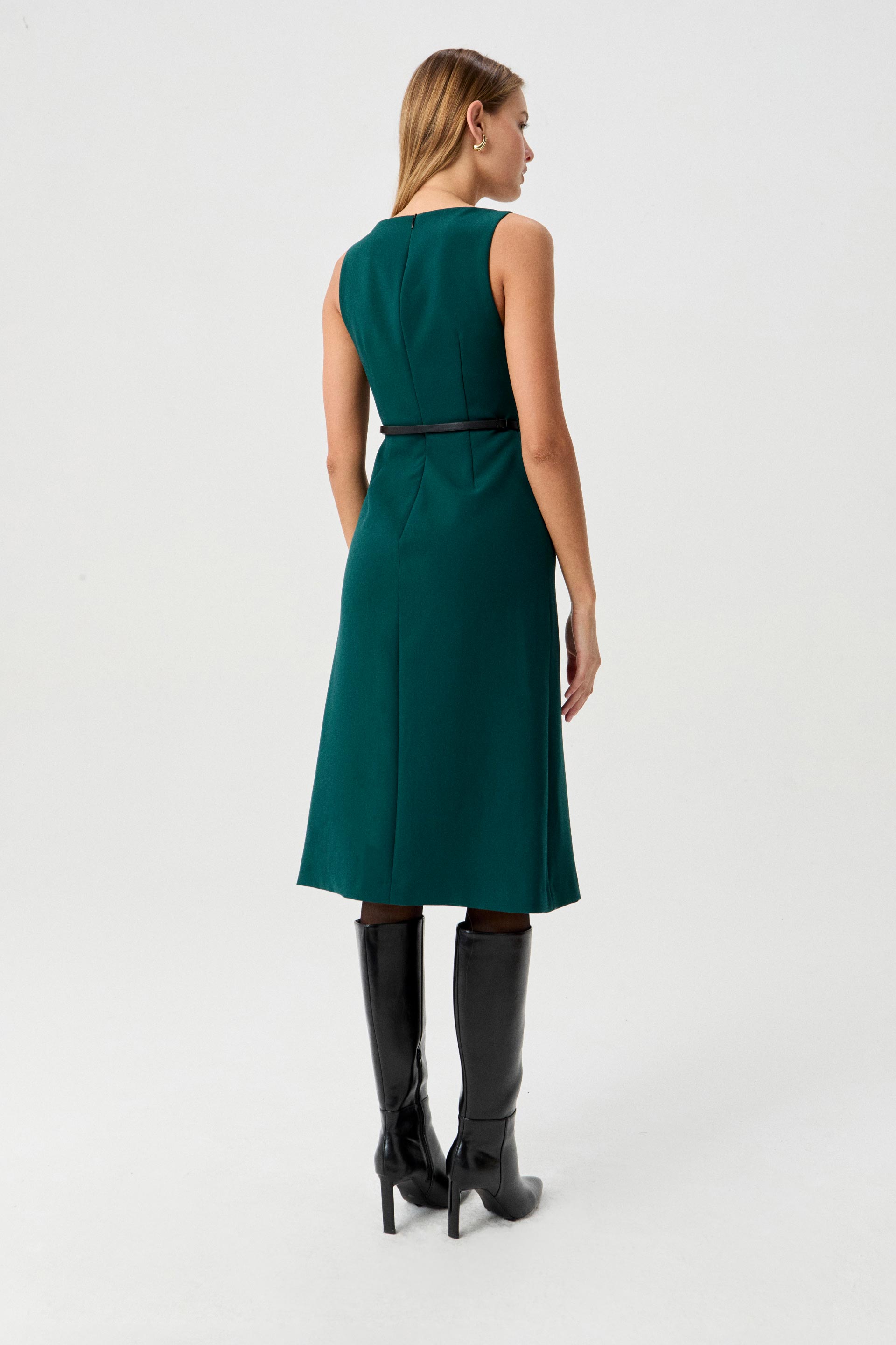 Vestido largo de sastrería rayón, de silueta evasé y sin mangas. Posee escote bote, recortes en el delantero pespunteados, acceso con cierre invisible y cinturón desmontable en efecto cuero con hebilla metálica. Su largo modular, su color y su diseño sobrio y elegante lo convierten en una prenda clásica pero de tendencia ideal tanto para la oficina como para un evento.