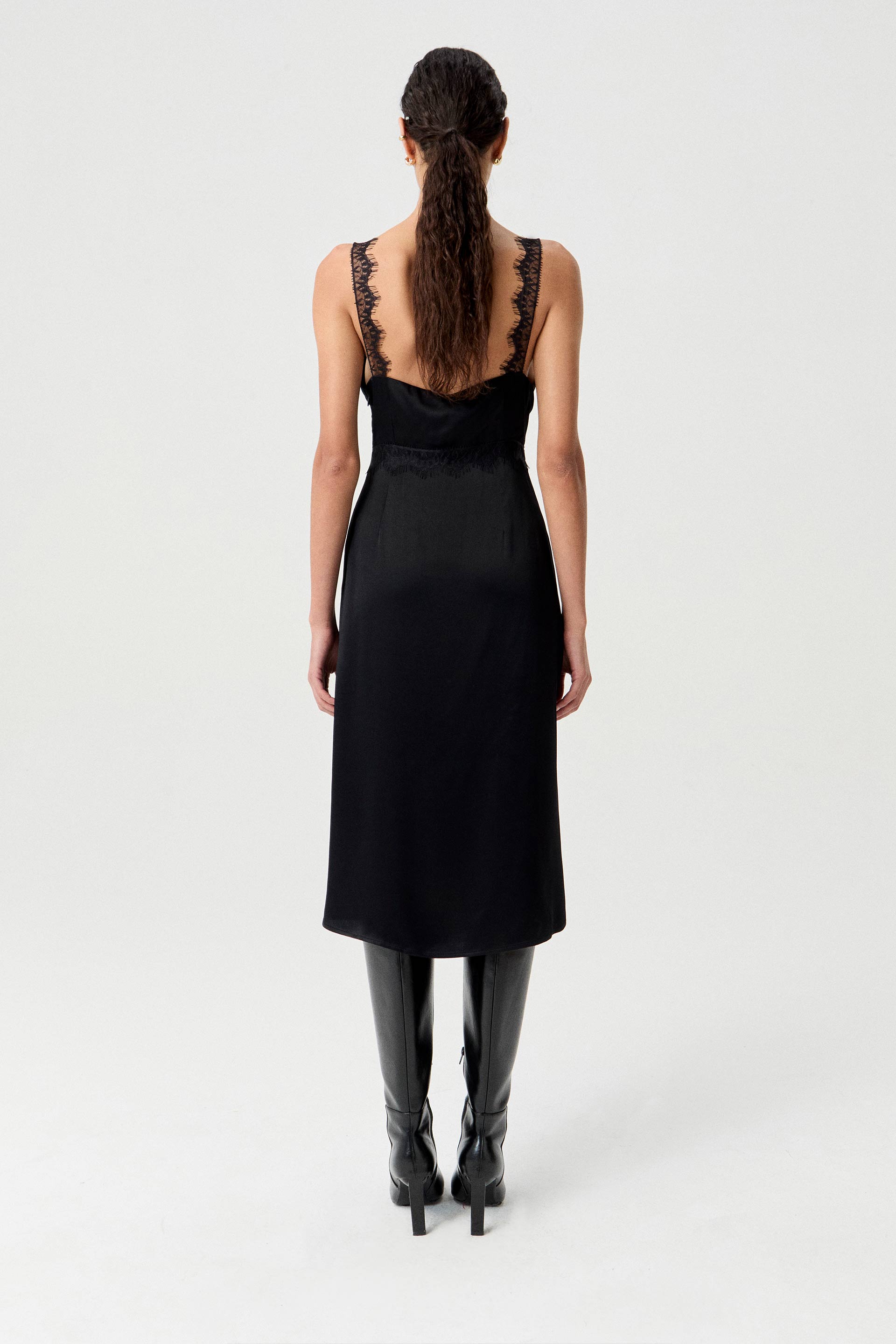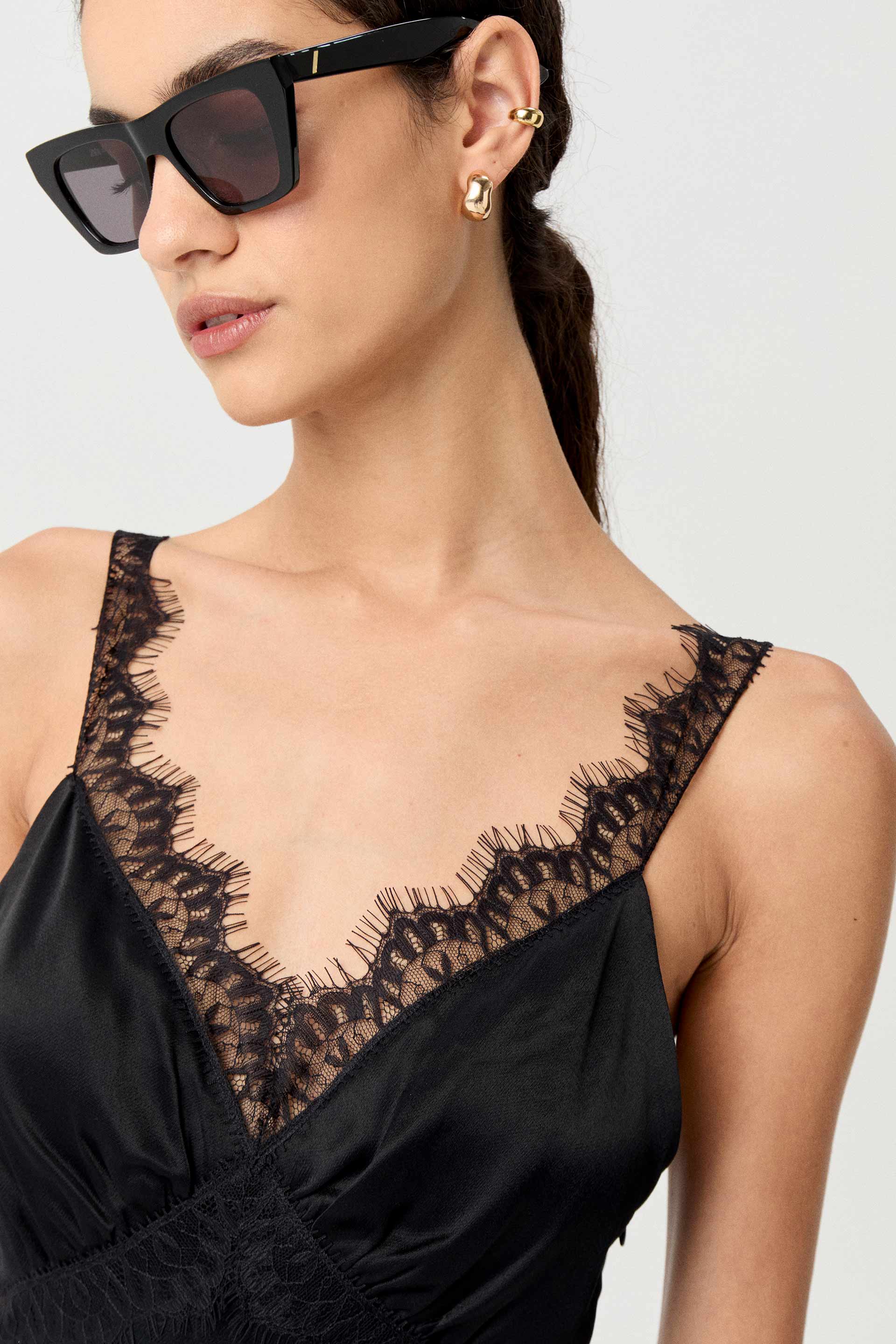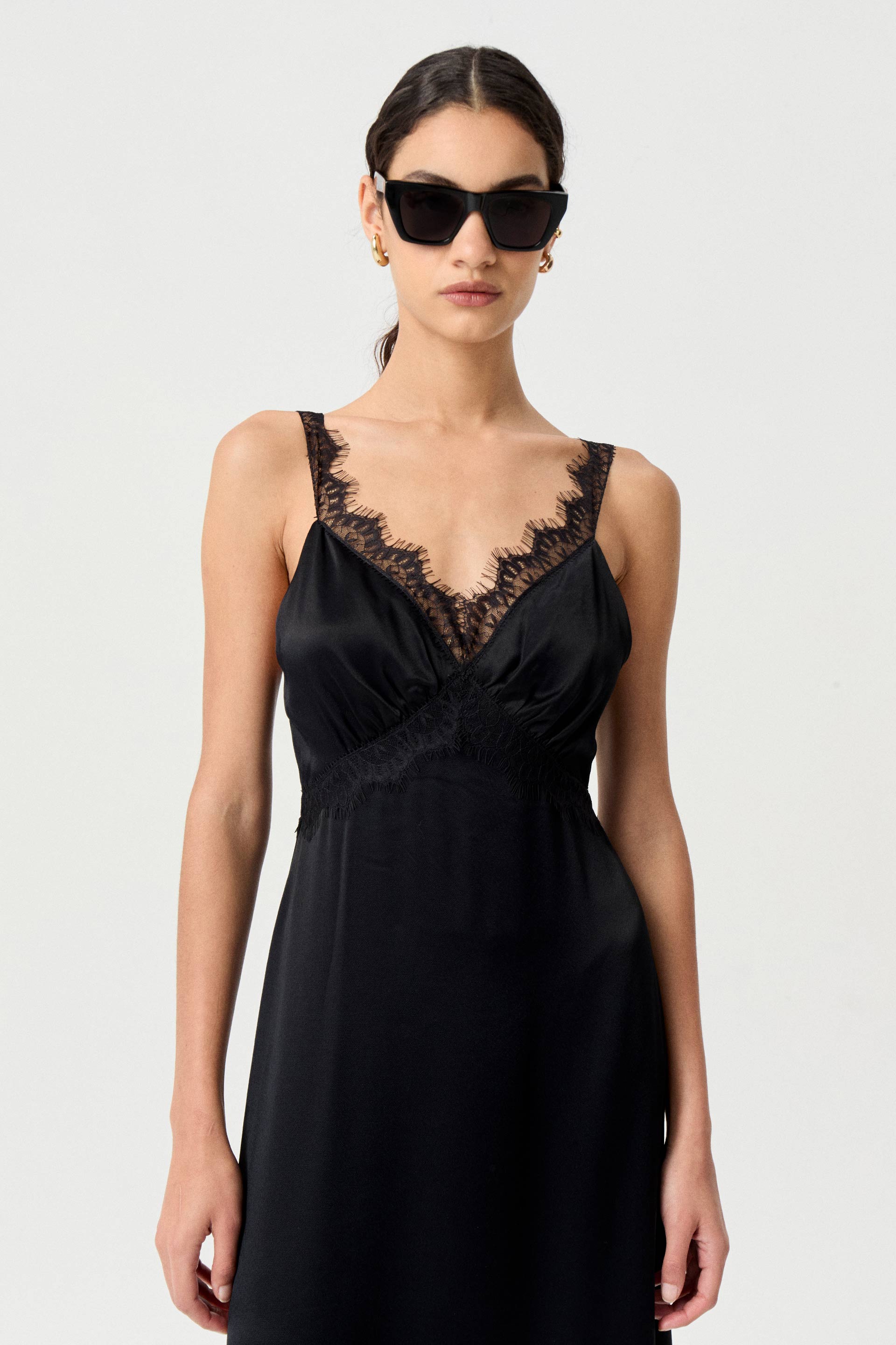 Vestido de satén elastizado estilo lencero, de silueta evasé y sin mangas. Posee escote en V, acceso con cierre invisible y puntilla en escote y cintura. Su género brilloso combinado con puntilla y su largo modular lo convierten en un vestido ideal para un evento nocturno. Combinalo con las botas Maure y armá un total look canchero y sofisticado.