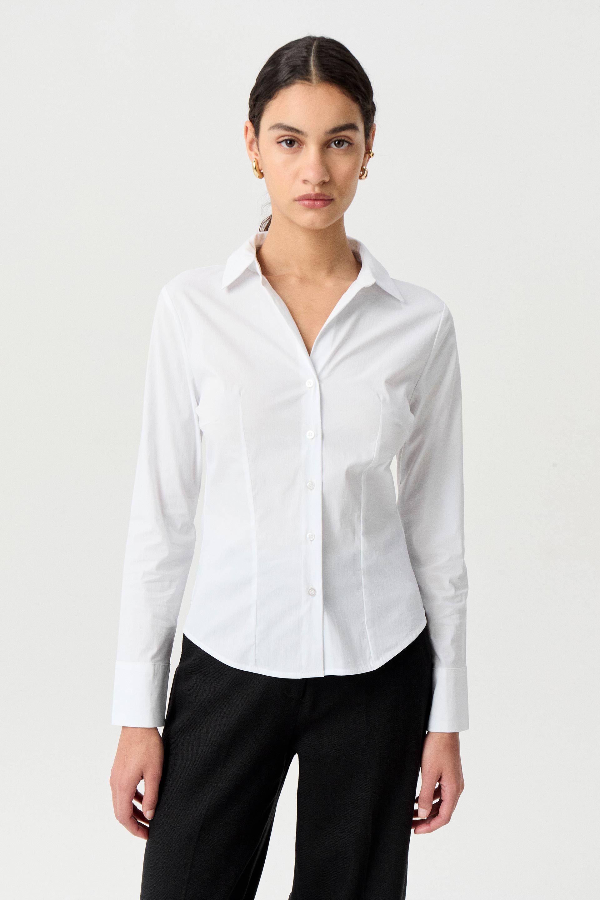 Camisa de poplin spandex rayada, de calce anatómico. Mangas largas con puños anchos y pinzas de busto y de entalle en cintura. Cartera con botones a la vista y escote en V. Su detalle de lúrex le confiere un toque moderno reversionando un clásico.