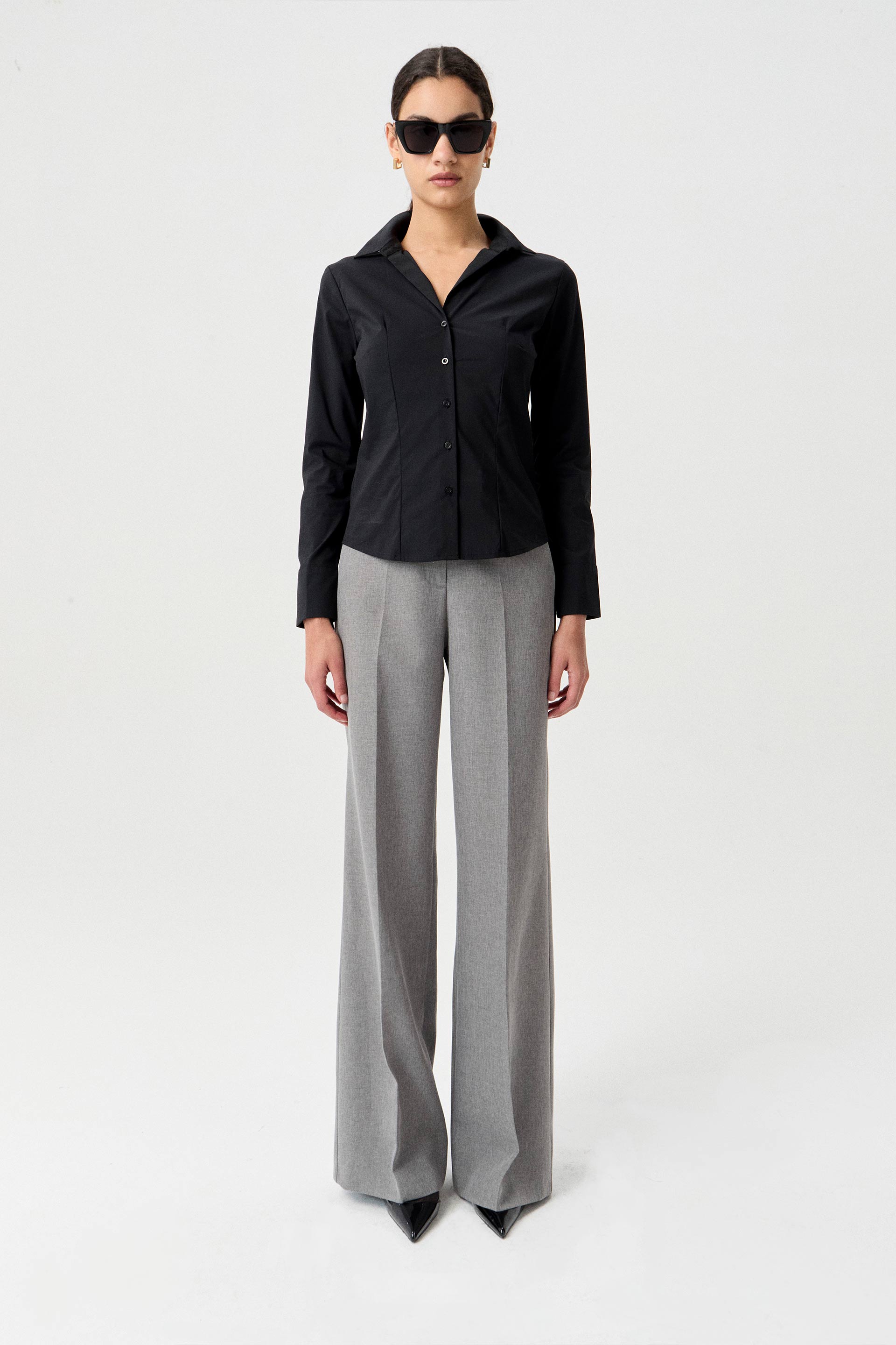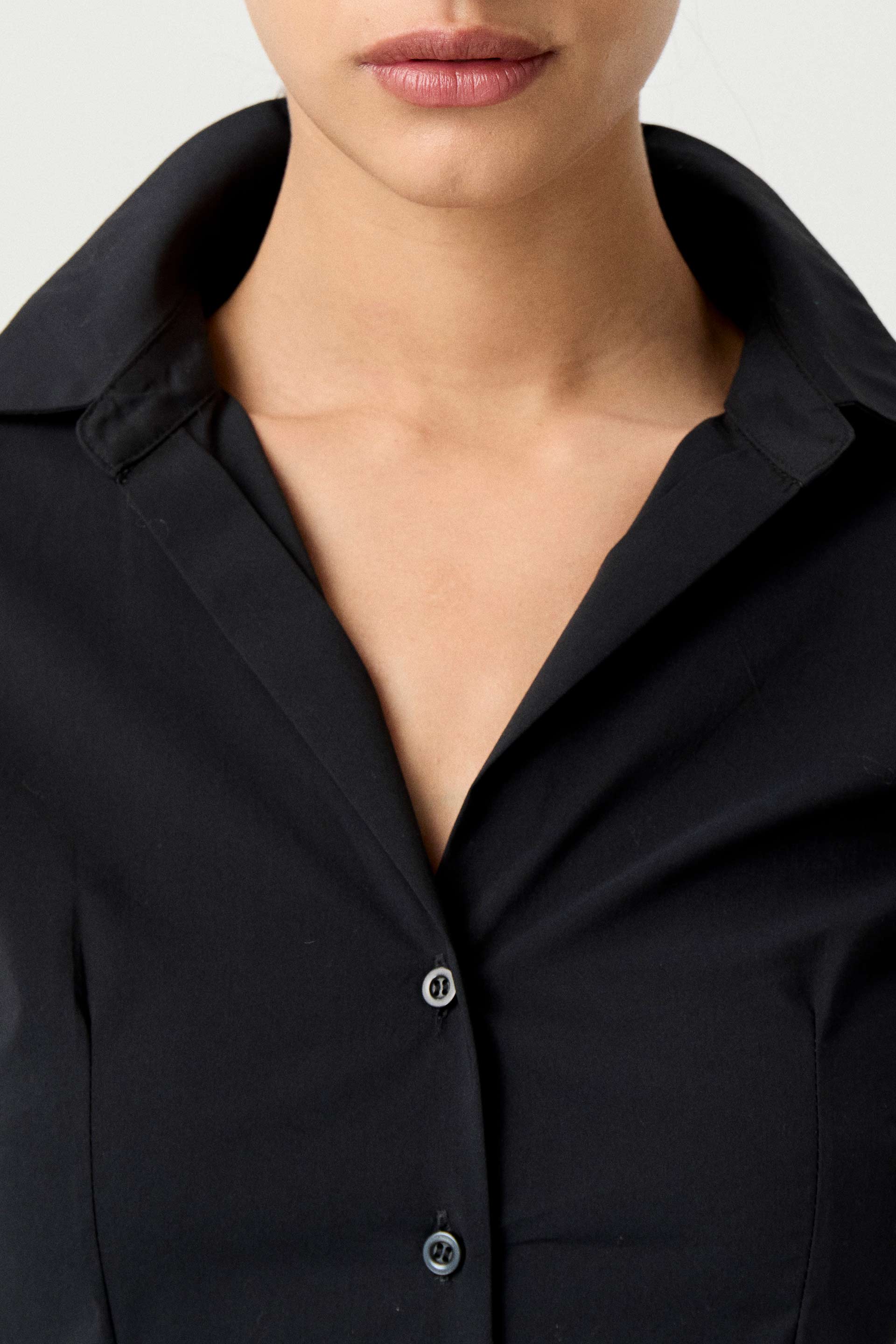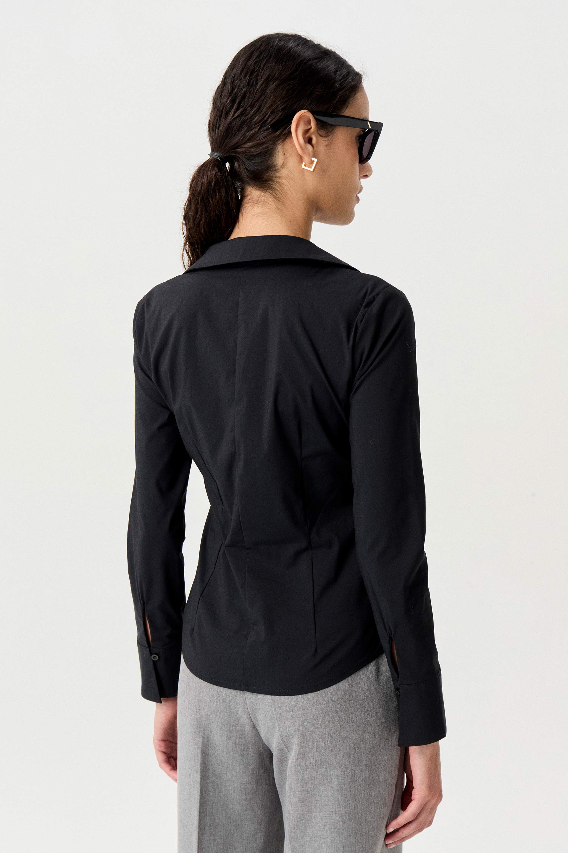 Camisa de poplin spandex rayada, de calce anatómico. Mangas largas con puños anchos y pinzas de busto y de entalle en cintura. Cartera con botones a la vista y escote en V. Su detalle de lúrex le confiere un toque moderno reversionando un clásico.
