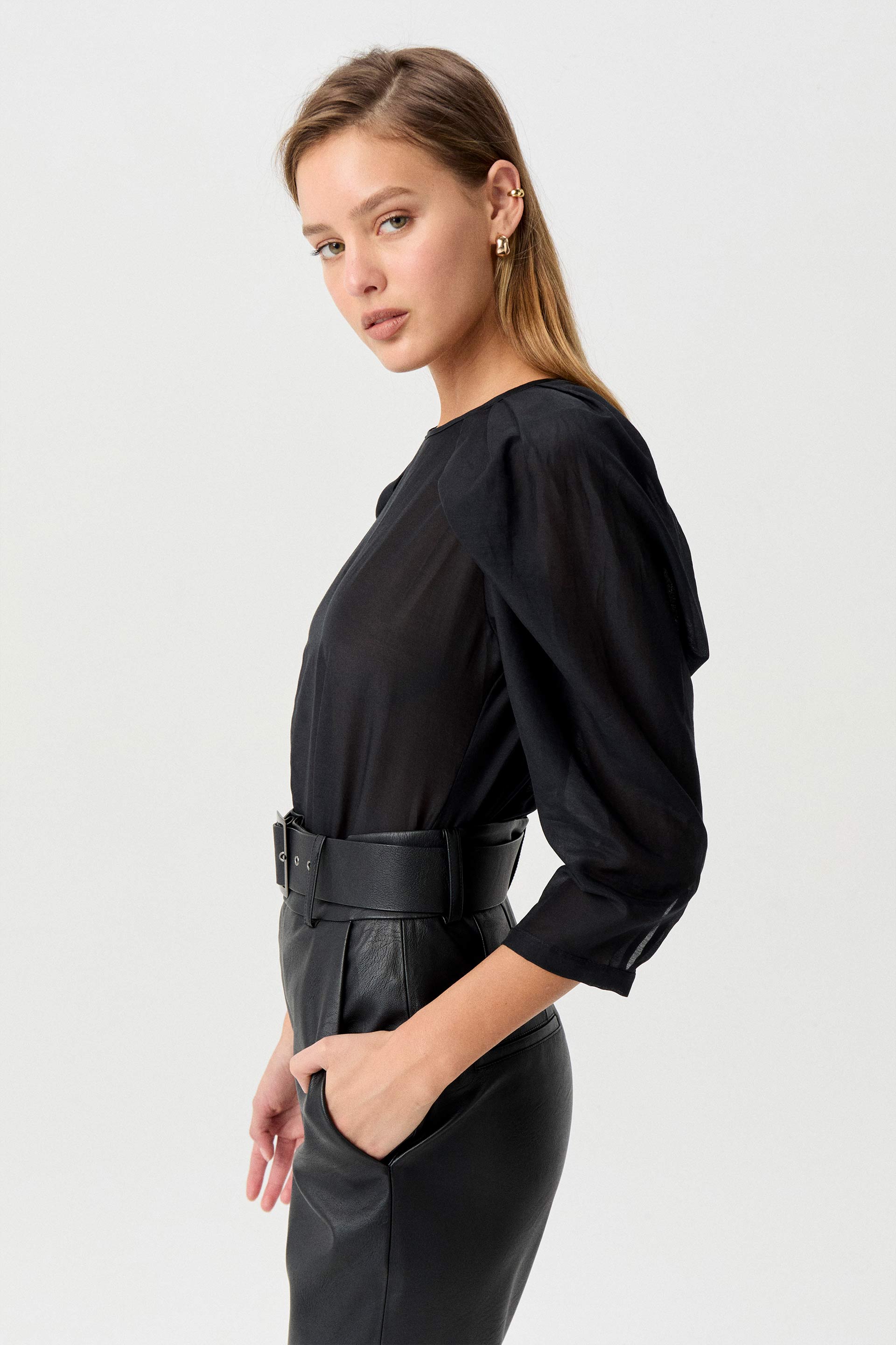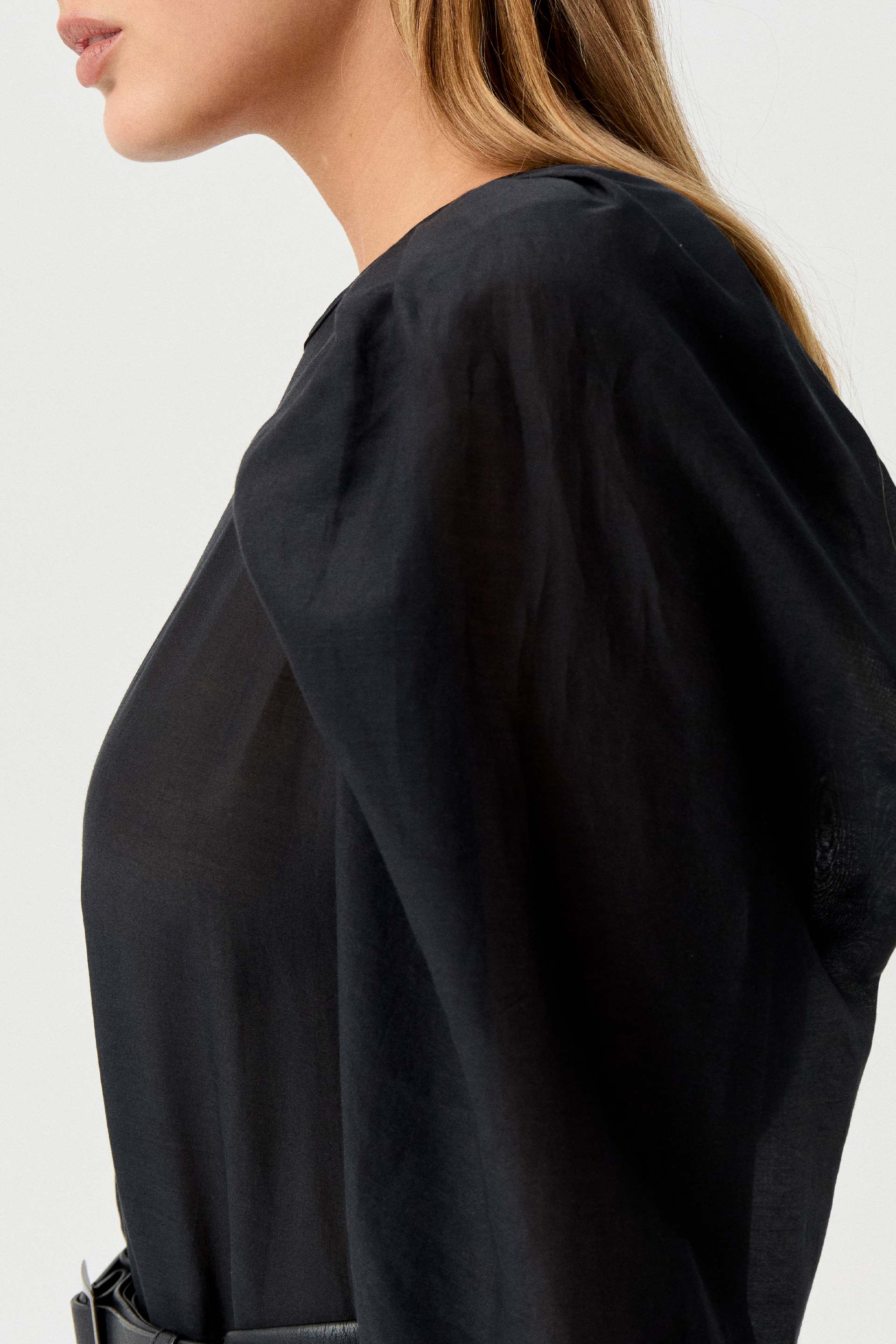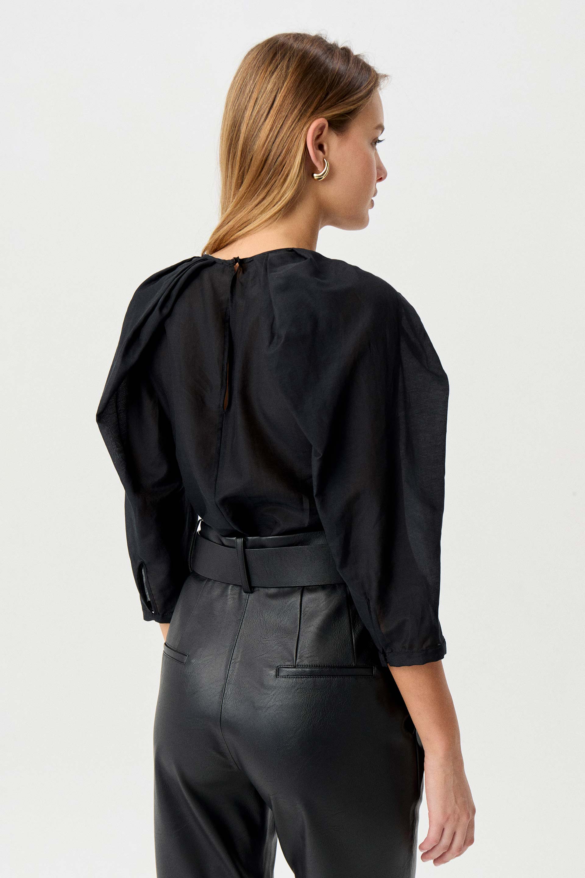 Blusa de algodón seda de calce relajado. Escote a la base, mangas tres cuartos y puff en hombros. Su género translúcido y sus hombros voluminosos hacen de esta prenda un ítem perfecto para destacarte.
