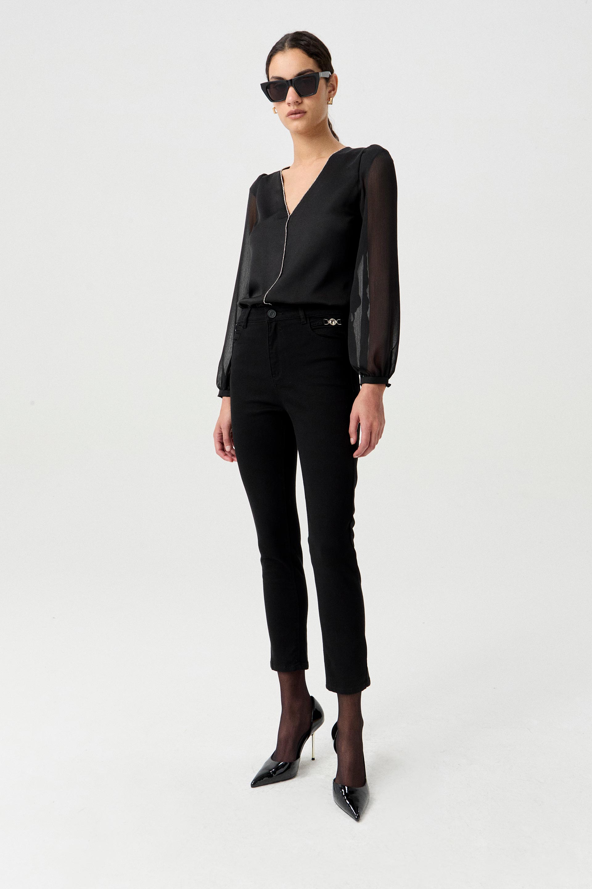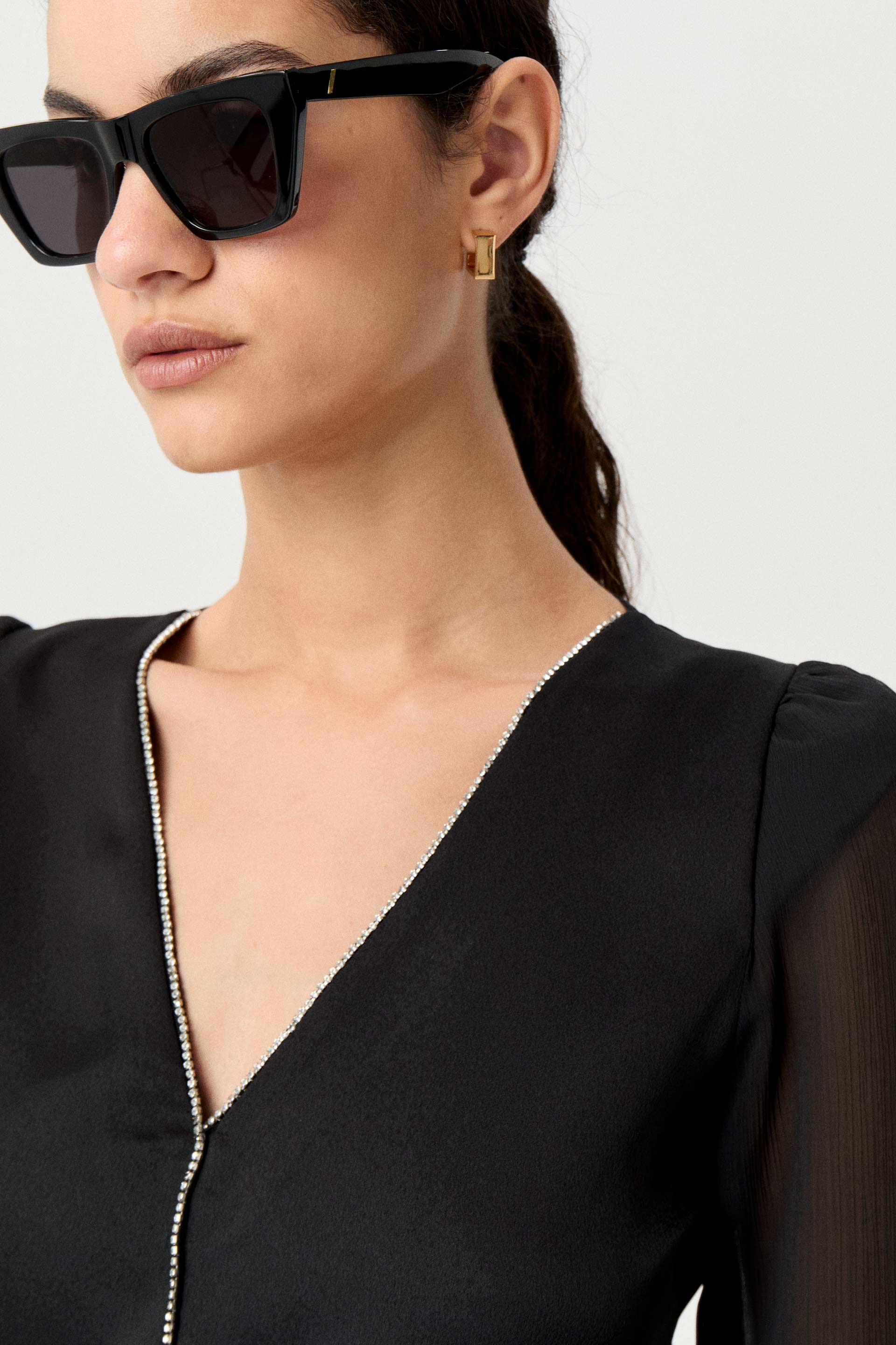 Blusa de sedita con combinación de gasa plisada en mangas, de calce al cuerpo. Strass en escote en V y recorte central en delantero. Mangas largas corte balloon. Un ítem de noche que no pasa de moda.