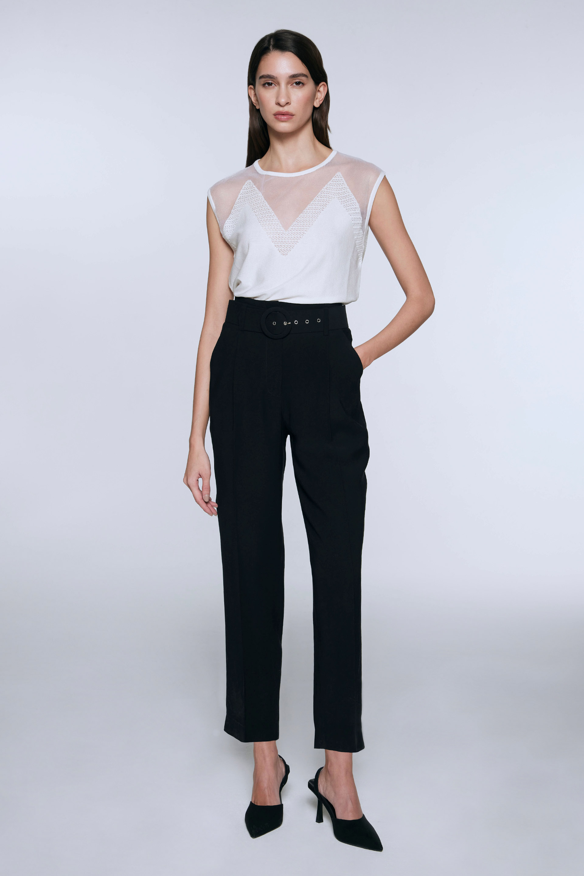 La modelo tiene contorno de busto 86 y usa talle S.