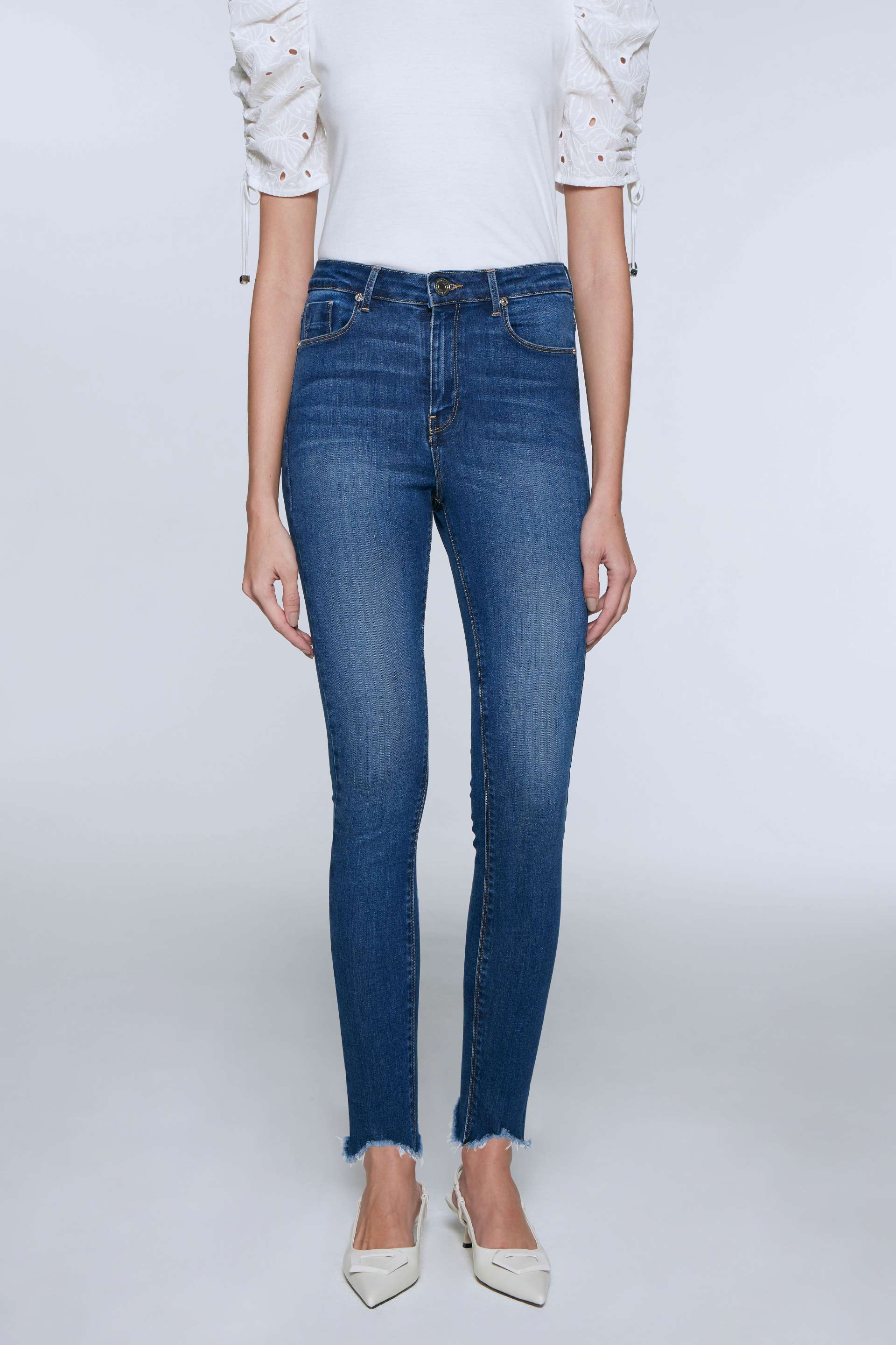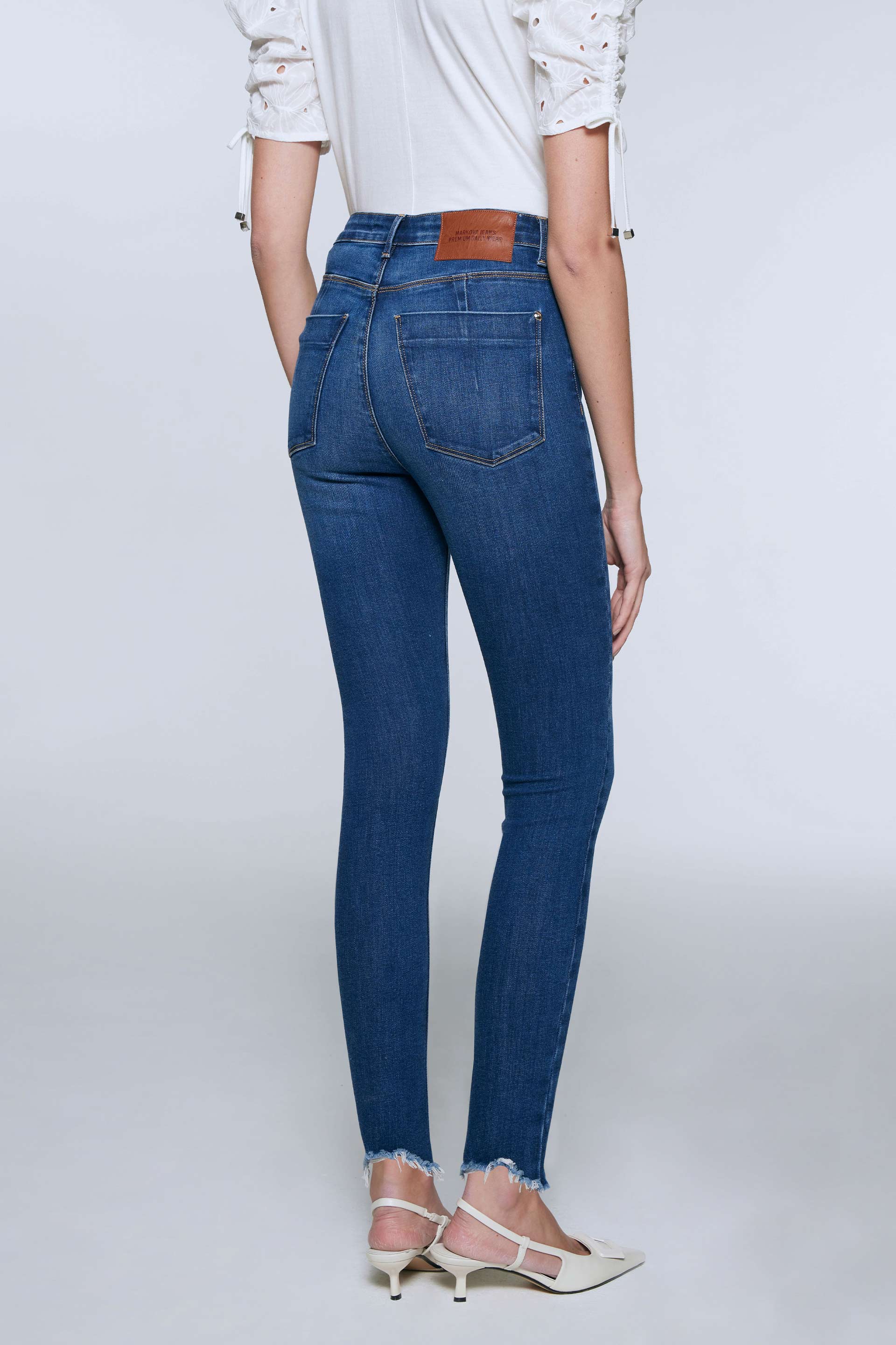 Jean elastizado, tiro alto con pierna ultraslim y calce al cuerpo ultra fit. Posee badana, botones y remaches metálicos MKV. Su tela premium con bajada de color, gastado localizado y roturas irregulares en ruedos lo convierten en el jean perfecto para componer todo tipo de looks.