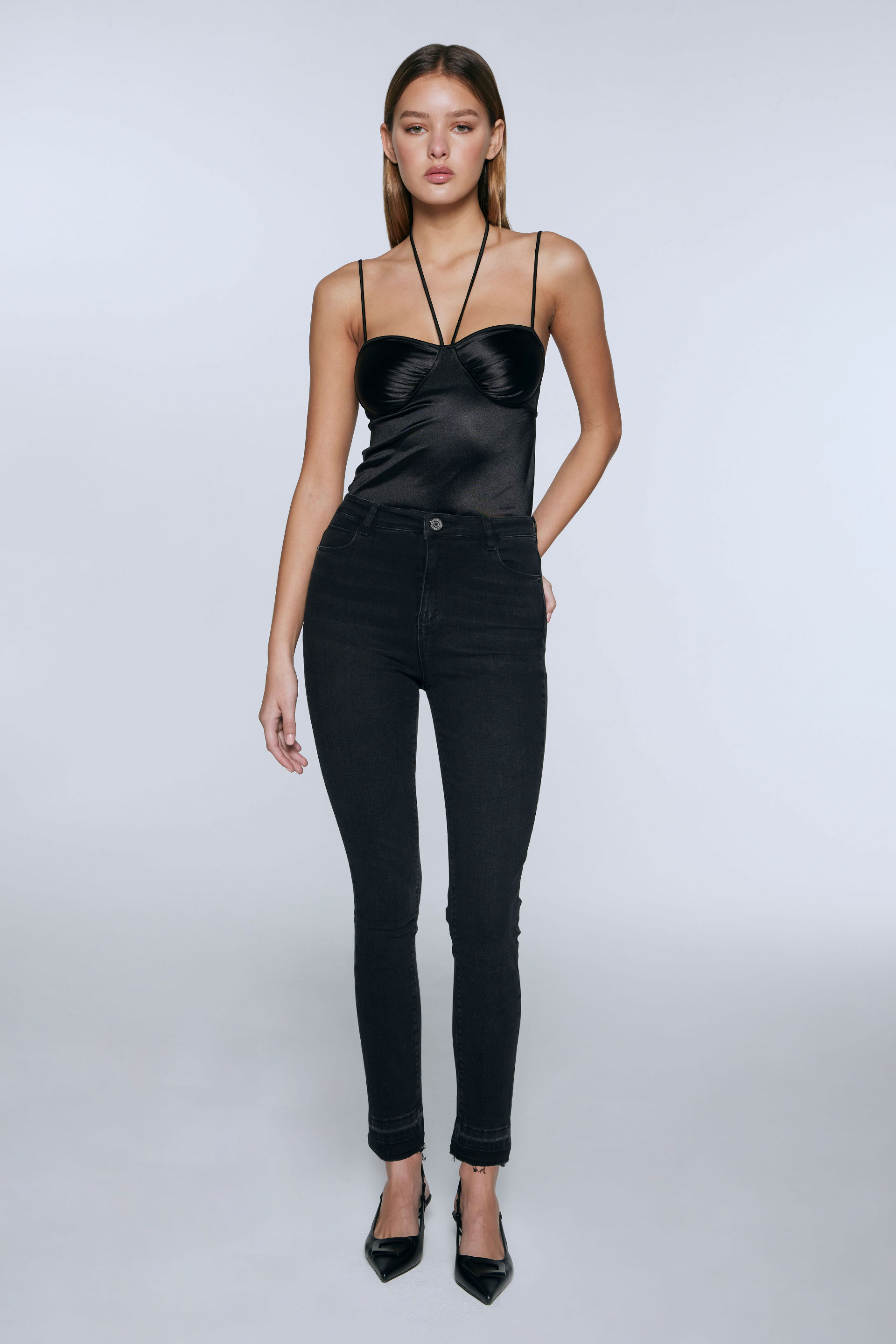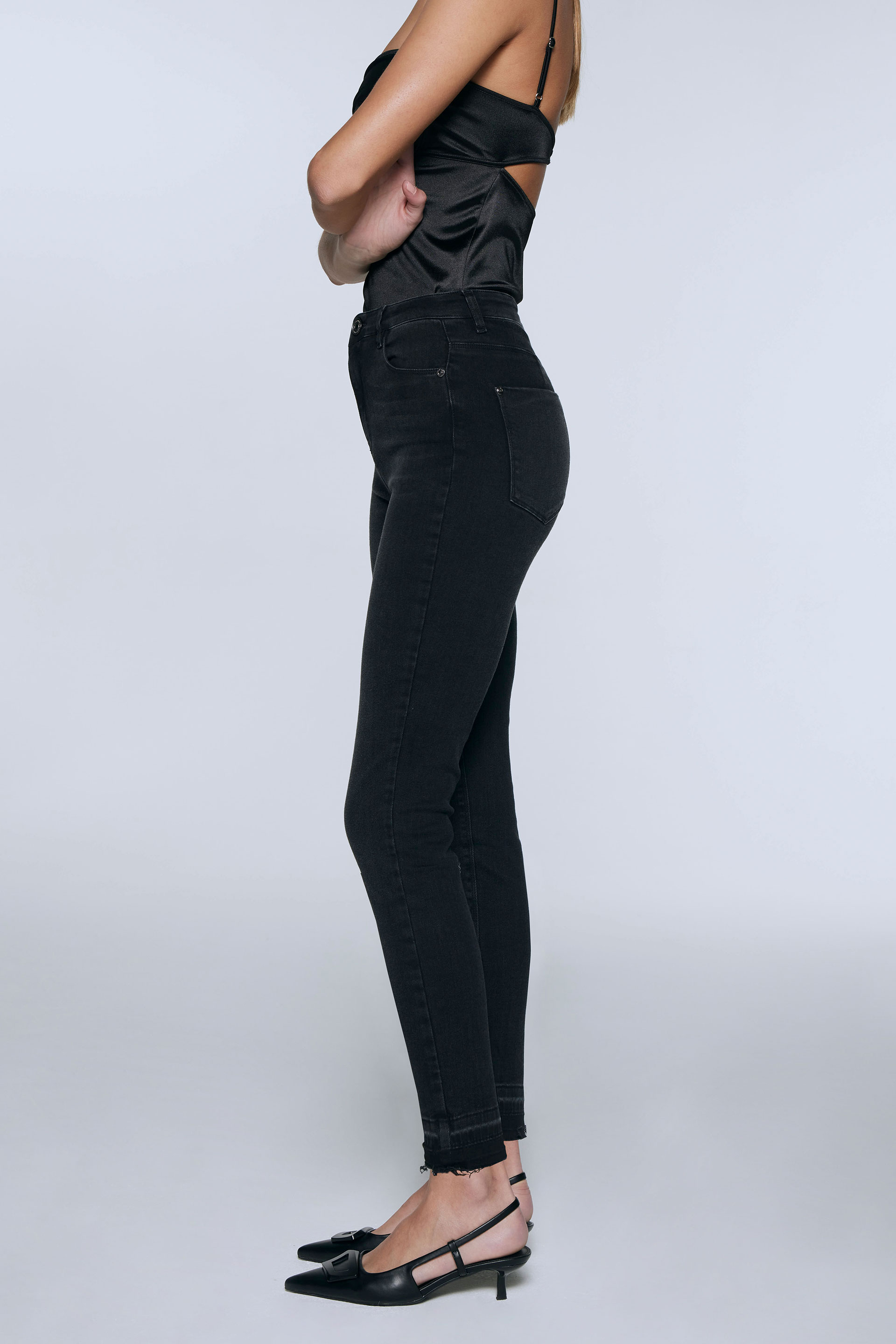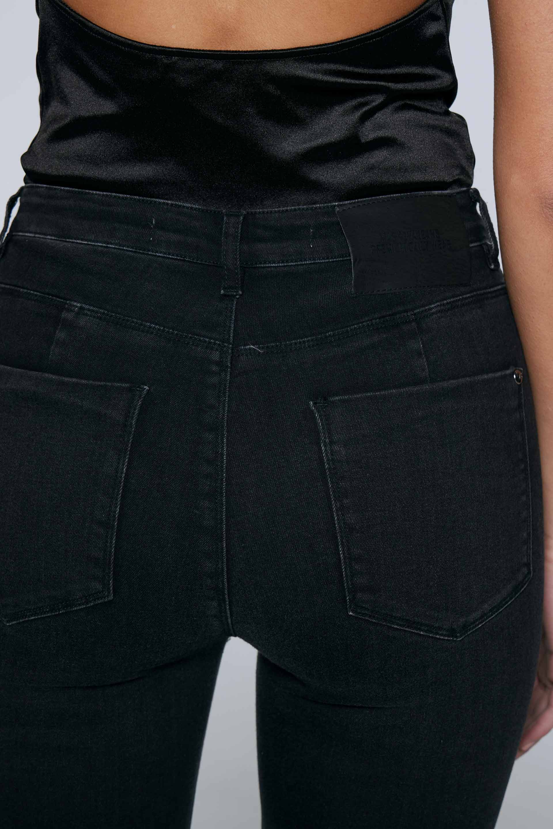 Jean elastizado tiro alto con pierna ultraslim y calce al cuerpo. Posee badana, botones y remaches metálicos personalizados MKV. Se le aplicó un lavado gastado localizado. Su detalle en ruedo con reserva de color lo convierte en un jean rocker ideal para combinar con una chaqueta efecto cuero y armar un look de noche.