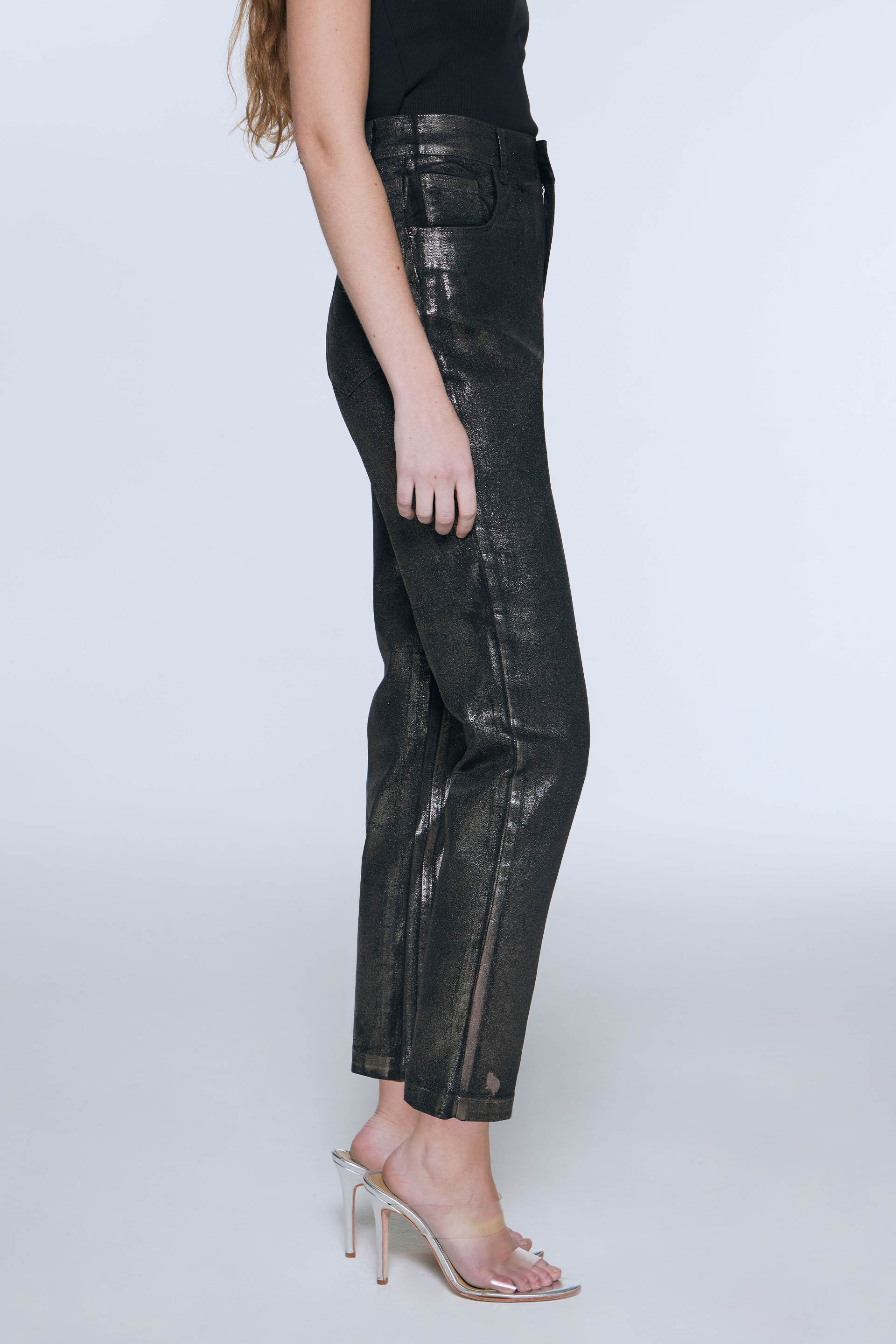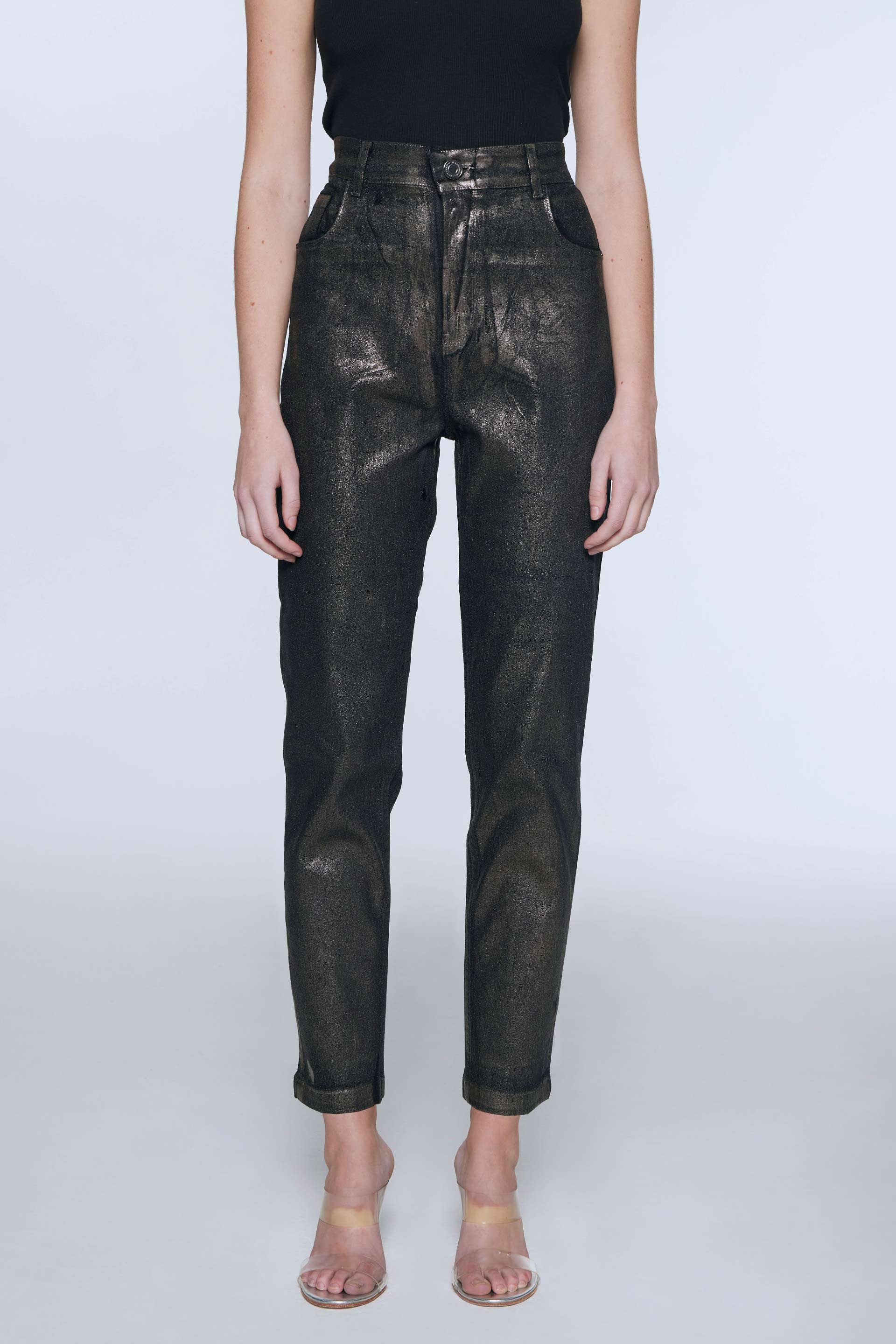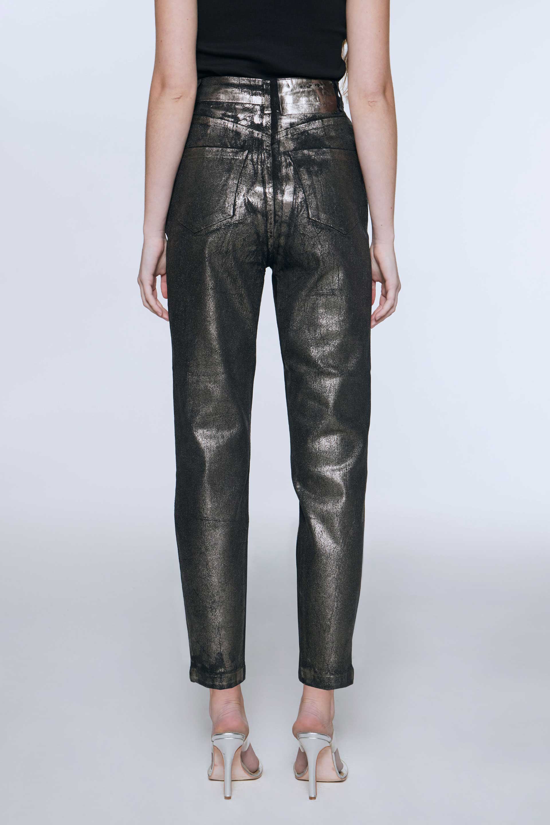Jean elastizado tiro alto con pierna recta slim, calce relajado y diseño 5 bolsillos. Posee badana y botón metálico personalizado MKV. Se le aplicó un lavado foil tornasolado que lo convierte en un jean de absoluta tendencia que elevará todos tus looks. Combinalo con una chaqueta de cuero y armá un look de noche.