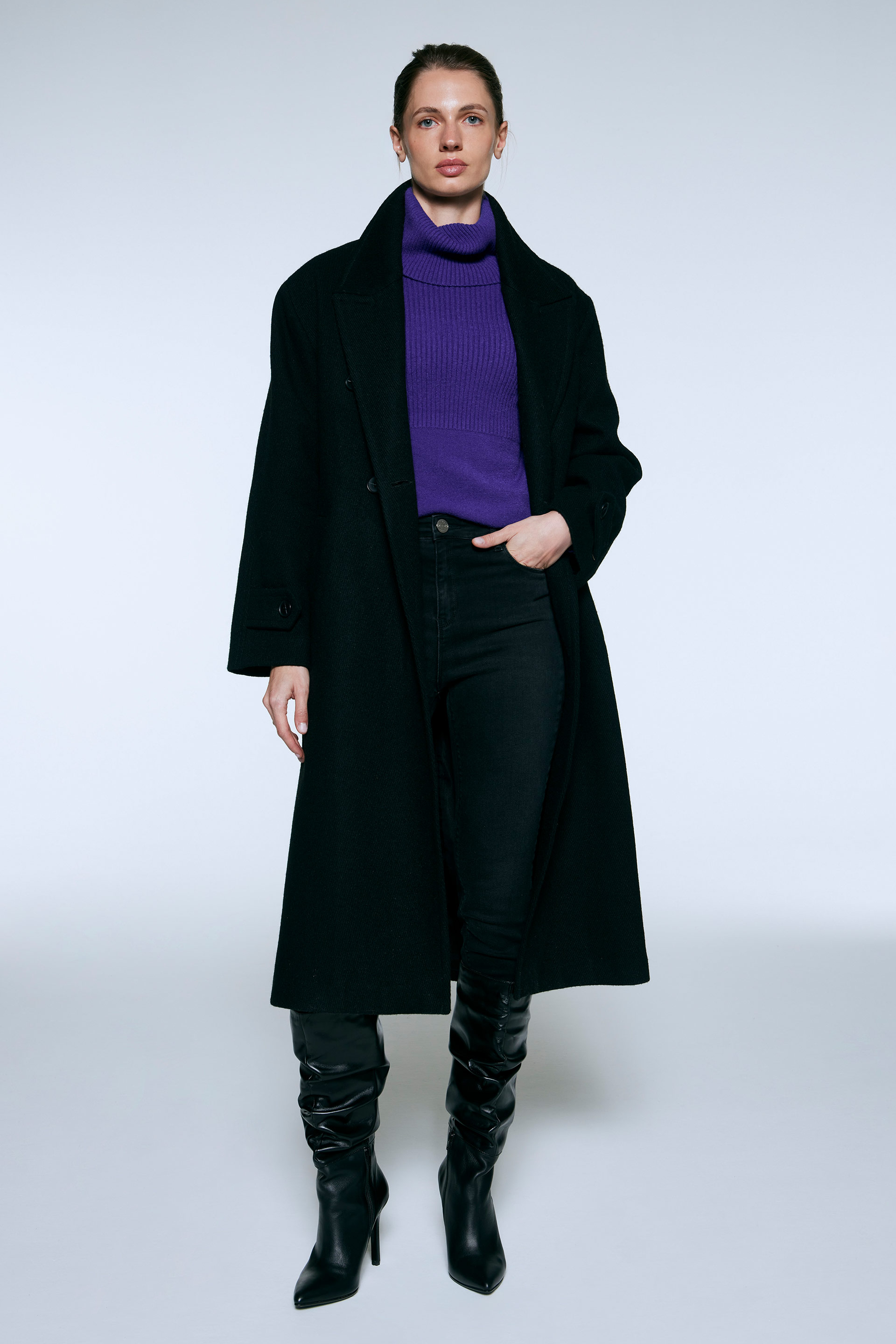 Tapado premium de paño lana, de silueta entallada, cuello alto y manga larga. Posee cierre y broches metálicos personalizados Markova. La forma redondeada de su cartera principal y las tapas de bolsillo acompañan a complementar un diseño clásico con un toque de moda.
